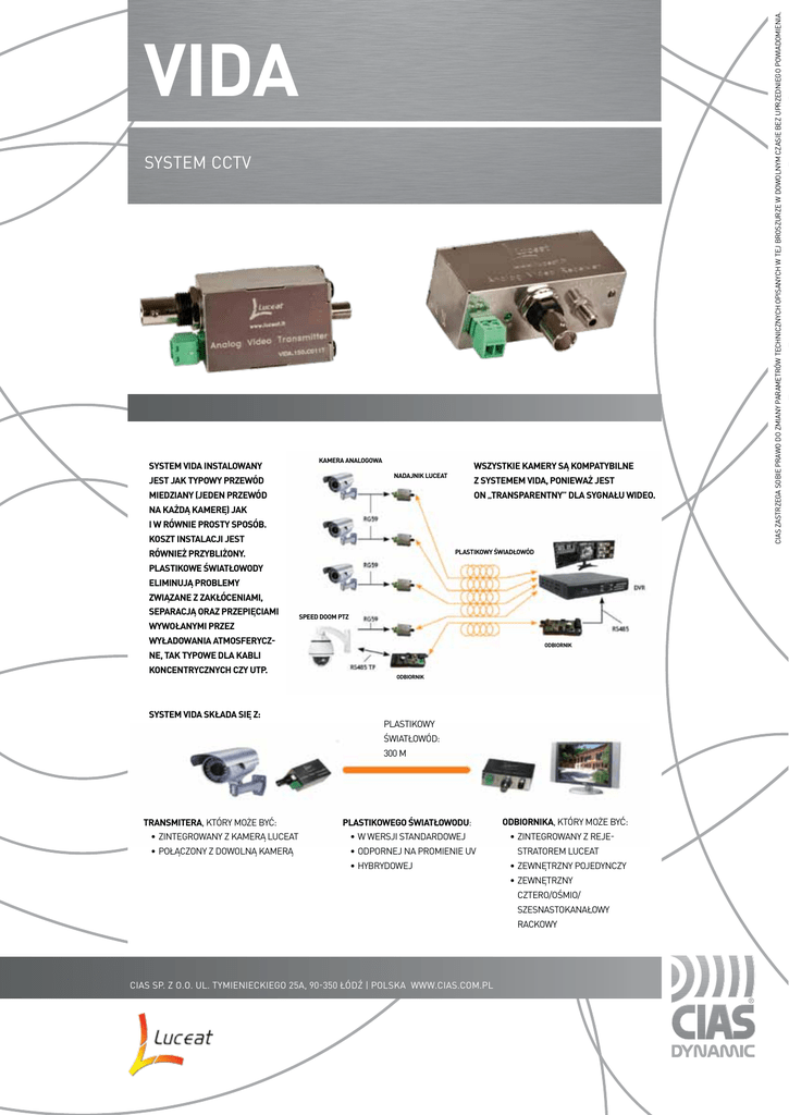 System CCTV System VIDA instalowany KAMERA ANALOGOWA Wszystkie kamery są kompatybilne NADAJNIK LUCEAT jest jak typowy przewód z systemem VIDA, ponieważ jest miedziany (jeden przewód on „transparentny” dla sygnału wideo. na każdą kamerę) jak i w równie prosty sposób. Koszt instalacji jest również przybliżony. PLASTIKOWY ŚWIADŁOWÓD Plastikowe światłowody eliminują problemy związane z zakłóceniami, separacją oraz przepięciami wywołanymi przez SPEED DOOM PTZ wyładowania atmosferycz- ODBIORNIK ne, tak typowe dla kabli koncentrycznych czy UTP. System VIDA składa się z: ODBIORNIK PlastikowY światłowÓD: 300 M Transmitera, który może być: Plastikowego światłowodu: •zintegrowany z kamerą Luceat •w wersji standardowej •połączony z dowolną kamerą •odpornej na promienie UV •hybrydowej Odbiornika, który może być: •zintegrowany z rejestratorem Luceat •zewnętrzny pojedynczy •zewnętrzny cztero/ośmio/ szesnastokanałowy rackowy v 2.0 CIAS SP. Z O.O. UL. TYMIENIECKIEGO 25A, 90-350 ŁÓDŹ | POLSKA WWW.CIAS.COM.PL Cias zastrzega sobie prawo do zmiany parametrów technicznych opisanych w tej broszurze w dowolnym czasie bez uprzedniego powiadomienia. VIDA