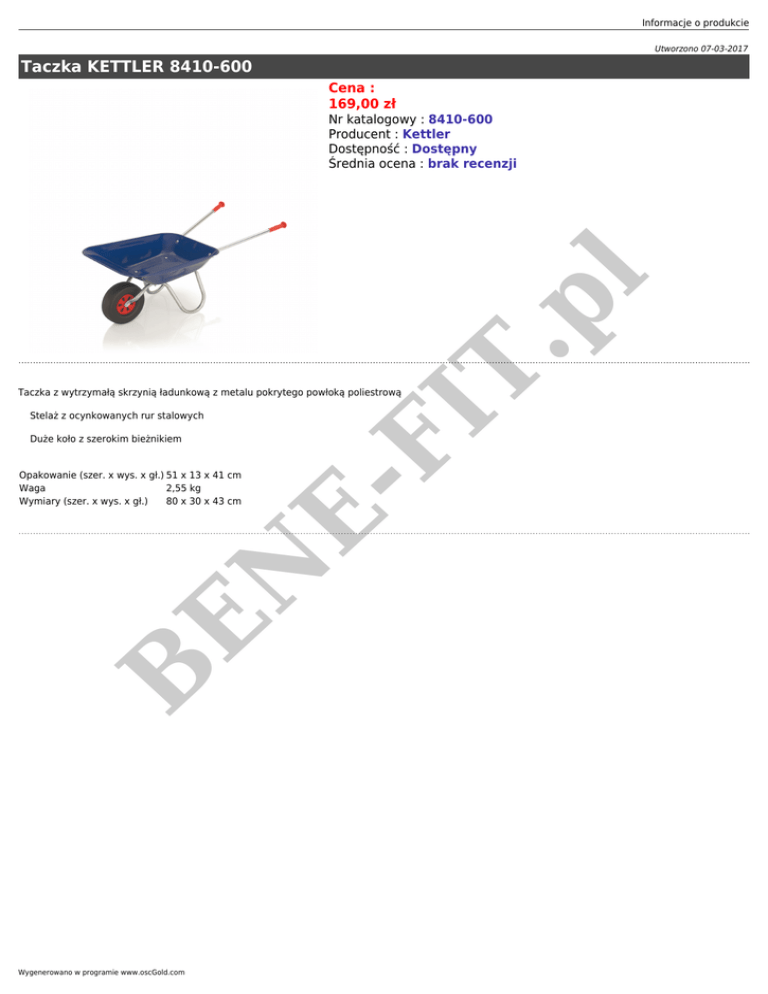 Informacje o produkcie Utworzono 07-03-2017 Taczka KETTLER 8410-600 Cena : 169,00 zł FI T .p l Nr katalogowy : 8410-600 Producent : Kettler Dostępność : Dostępny Średnia ocena : brak recenzji Taczka z wytrzymałą skrzynią ładunkową z metalu pokrytego powłoką poliestrową Stelaż z ocynkowanych rur stalowych Duże koło z szerokim bieżnikiem B EN E- Opakowanie (szer. x wys. x gł.) 51 x 13 x 41 cm Waga 2,55 kg Wymiary (szer. x wys. x gł.) 80 x 30 x 43 cm Wygenerowano w programie www.oscGold.com
