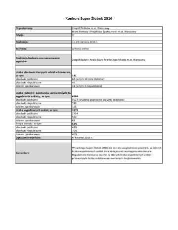Konkurs Super Żłobek 2016 Organizatorzy: Edycja: Zespół Żłobków m.st. Warszawy Biuro Pomocy i Projektów Społecznych m.st. Warszawy XI Realizacja: 10-29 czerwca 2016 r. Technika: Ankieta online Realizacja badania oraz opracowanie wyników: Zespół Badań i Analiz Biuro Marketingu Miasta m.st. Warszawy Liczba placówek biorących udział w konkursie, w tym: placówki publiczne placówki niepubliczne dzienni opiekunowie Liczba rodziców, opiekunów uprawnionych do wypełnienia ankiety, w tym: placówki publiczne placówki niepubliczne dzienni opiekunowie Liczba wypełnionych ankiet, w tym: placówki publiczne placówki niepubliczne dzienni opiekunowie Stopa zwrotu, w tym: placówki publiczne placówki niepubliczne dzienni opiekunowie Ogłoszenie wyników: Komentarz: 141 64 (w tym 10 mini żłobków) 46 31 (w tym 4 niepubliczne) 6504 5627 (wysłano poprawnie do 5607 rodziców) 742 155 3378 2754 562 62 52% 49% 76% 40% IV kwartał 2016 r. W rankingu Super Żłobek 2016 nie zostały uwzględnione placówki, w których liczba wypełnionych ankiet była mniejsza niż wymagana określona w Regulaminie Konkursu oraz te, w których liczba wypełnionych ankiet przewyższyła liczbę rodziców uprawnionych do głosowania.