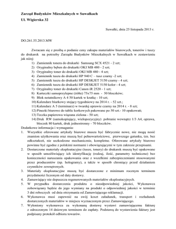 Zarząd Budynków Mieszkalnych w Suwałkach Ul. Wigierska 32 Suwałki, dnia 25 listopada 2013 r. DO.261.55.2013.MW Zwracam się z prośbą o podanie ceny zakupu materiałów biurowych, tonerów i tuszy do drukarek na potrzeby Zarządu Budynków Mieszkalnych w Suwałkach w zestawieniu jak niżej: 1) Zamiennik tonera do drukarki Samsung SCX 4521 - 2 szt; 2) Oryginalny bęben do drukarki OKI MB 480 - 2 szt; 3) Oryginalny toner do drukarki OKI MB 480 - 4 szt; 4) Zamiennik tuszu do drukarki HP 940 C – tusz czarny -2 szt; 5) Zamiennik tuszu do drukarki HP DESKJET 5150 czarny - 4 szt; 6) Zamiennik tuszu do drukarki HP DESKJET 5150 kolor - 4 szt; 7) Oryginalny toner do drukarki Canon iR 2520 - 1 szt; 8) Karteczki samoprzylepne (żółte) 75x75 mm - 50 bloczków; 9) Blok notatnikowy A 4 50 kartek w kratkę - 10 szt; 10) Kalendarz biurkowy stojący tygodniowy na 2014 r. - 52 szt.; 11) Kalendarz A 5 (terminarz) w twardej oprawie czarny na 2014 r. - 8 szt; 12) Pinezki biurowe do tablic korkowych pakowane po 50 szt.- 10 opakowań; 13) Teczka papierowa wiązana zielona - 50 szt; 14) Druk RW (samokopiujący, wielopozycyjny) pobranie wewnątrz 1/3 A4, oprawa, bloczek 80 kartek, druk jednostronny - 70 bloczków. Dodatkowe informacja i wymagania: 1. Wszystkie oferowane artykuły biurowe musza być fabrycznie nowe, nie mogą nosić znamion użytkowania oraz muszą być pełnowartościowe, pierwszego gatunku, tzn. bez odkształceń, nie uszkodzone mechanicznie, kompletne. Oferowane artykuły biurowe powinne być zgodne z polskimi normami i obowiązującymi w tym zakresie przepisami. 2. Dostarczone materiały eksploatacyjne (tusze, tonery) do drukarek muszą być opakowane w sposób umożliwiający ich identyfikację (rodzaj, ilość, parametry techniczne) bez konieczności naruszania opakowania oraz z wszelkimi zabezpieczeniami stosowanymi przez producentów (np. hologramy), a także w sposób chroniący przed działaniem czynników zewnętrznych. 3. Materiały eksploatacyjne muszą być dostarczone z minimum rocznym terminem przydatności liczonym od daty dostawy. 4. Zamawiający nie dopuszcza regenerowanych materiałów eksploatacyjnych. 5. W przypadku dostarczenia produktu o nieodpowiedniej jakości, Wykonawca zobowiązany będzie do jego wymiany na produkt o odpowiedniej jakości w terminie 3 dni roboczych od dnia otrzymania od Zamawiającego reklamacji. 6. Wykonawca musi zapewnić na swój koszt załadunek, transport i rozładunek dostarczonych materiałów w miejscu wyznaczonym przez Zamawiającego. 7. Wyłoniony wykonawca za wykonaną dostawę wystawi zamawiającemu fakturę z odroczonym 14 dniowym terminem do zapłaty. Podstawą do wystawienia faktury jest podpisany protokół odbioru towarów. Termin realizacji zamówienia – do dnia 13 grudnia 2013 r. Zamawiający dopuszcza możliwość unieważnienia postępowania w każdym czasie bez podania przyczyny. Ofertę /formularz cenowy/ na wykonanie dostawy proszę złożyć w siedzibie ZBM przy ul. Wigierska 32 (sekretariat) do dnia 03 grudnia 2013 r. do godz.1000. Oferta winna znajdować się w zamkniętej kopercie zaadresowanej na adres Zamawiającego z podaniem przedmiotu dostawy. O wyniku postępowania Zamawiający poinformuje Wykonawców na stronie internetowej www.zbm.suwalki.pl. ZASTĘPCA DYREKTORA Wiesław Lange /-/ podpis nieczytelny W załączeniu: - formularz ofertowy