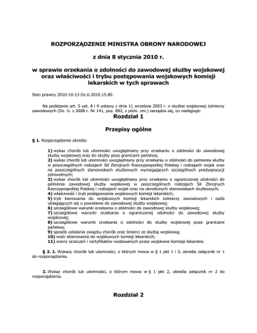 ROZPORZĄDZENIE MINISTRA OBRONY NARODOWEJ z dnia 8 stycznia 2010 r. w sprawie orzekania o zdolności do zawodowej służby wojskowej oraz właściwości i trybu postępowania wojskowych komisji lekarskich w tych sprawach Stan prawny 2010-10-13 Dz.U.2010.15.80. Na podstawie art. 5 ust. 8 i 9 ustawy z dnia 11 września 2003 r. o służbie wojskowej żołnierzy zawodowych (Dz. U. z 2008 r. Nr 141, poz. 892, z późn. zm.) zarządza się, co następuje: Rozdział 1 Przepisy ogólne § 1. Rozporządzenie określa: 1) wykaz chorób lub ułomności uwzględniany przy orzekaniu o zdolności do zawodowej służby wojskowej oraz do służby poza granicami państwa; 2) wykaz chorób lub ułomności uwzględniany przy orzekaniu o zdolności do pełnienia służby w poszczególnych rodzajach Sił Zbrojnych Rzeczypospolitej Polskiej i rodzajach wojsk oraz na poszczególnych stanowiskach służbowych wymagających szczególnych predyspozycji zdrowotnych; 3) wykaz chorób lub ułomności uwzględniany przy orzekaniu o ograniczonej zdolności do pełnienia zawodowej służby wojskowej w poszczególnych rodzajach Sił Zbrojnych Rzeczypospolitej Polskiej i rodzajach wojsk oraz na określonych stanowiskach służbowych; 4) właściwość i tryb postępowania wojskowych komisji lekarskich; 5) tryb kierowania do wojskowych komisji lekarskich żołnierzy zawodowych i osób ubiegających się o powołanie do zawodowej służby wojskowej; 6) szczegółowe warunki orzekania o zdolności do zawodowej służby wojskowej; 7) szczegółowe warunki orzekania o ograniczonej zdolności do zawodowej służby wojskowej; 8) szczegółowe warunki orzekania o zdolności do służby wojskowej poza granicami państwa; 9) sposób ustalania związku chorób oraz śmierci ze służbą wojskową; 10) wzór skierowania do wojskowych komisji lekarskich; 11) wzory orzeczeń i certyfikatów wydawanych przez wojskowe komisje lekarskie. § 2. 1. Wykazy chorób lub ułomności, o których mowa w § 1 pkt 1 i 3, określa załącznik nr 1 do rozporządzenia. 2. Wykaz chorób lub ułomności, o którym mowa w § 1 pkt 2, określa załącznik nr 2 do rozporządzenia. Rozdział 2 Właściwość wojskowych komisji lekarskich § 3. 1. Właściwe do orzekania o zdolności fizycznej i psychicznej do pełnienia zawodowej służby wojskowej są: 1) terenowe wojskowe komisje lekarskie, 2) rejonowe wojskowe komisje lekarskie, 3) Wojskowa Komisja Lotniczo-Lekarska w Dęblinie, 4) Wojskowa Komisja Lotniczo-Lekarska w Warszawie, 5) Wojskowa Komisja Lekarska Sił Powietrznych w Warszawie, 6) Wojskowa Komisja Morsko-Lekarska w Gdańsku, 7) Wojskowa Komisja Lekarska Marynarki Wojennej w Gdańsku, 8) Stołeczna Wojskowa Komisja Lekarska w Warszawie, 9) Centralna Wojskowa Komisja Lekarska w Warszawie - zwane dalej „wojskowymi komisjami lekarskimi”. 2. Właściwość miejscową wojskowej komisji lekarskiej ustala się: 1) w stosunku do żołnierzy zawodowych - według miejsca stacjonowania jednostki wojskowej lub pododdziału jednostki wojskowej, w której pełnią służbę; 2) w stosunku do osób ubiegających się o powołanie do zawodowej służby wojskowej - według miejsca ich zamieszkania. § 4. Terenowe wojskowe komisje lekarskie są Właściwe w zakresie: 1) orzekania o zdolności do pełnienia zawodowej służby wojskowej: a) żołnierzy zawodowych zajmujących stanowiska służbowe do stopnia etatowego podpułkownika (komandora porucznika), b) żołnierzy pełniących służbę kandydacką, c) osób ubiegających się o powołanie do służby kandydackiej lub zawodowej służby wojskowej; 2) orzekania w stosunku do osób, o których mowa w pkt 1, o zdolności do pełnienia służby: a) poza granicami państwa, b) w jednostkach desantowo-szturmowych, c) w zasięgu działania promieniowania mikrofalowego, d) w warunkach działania prądu elektrycznego; 3) orzekania w stosunku do żołnierzy, o których mowa w pkt 1 lit. a i b, o związku chorób, ułomności i śmierci odpowiednio z zawodową służbą wojskową albo służbą kandydacką; 4) orzekania w stosunku do żołnierzy, o których mowa w pkt 1 lit. a, o: a) ograniczonej zdolności do pełnienia zawodowej służby wojskowej, b) potrzebie długotrwałego lub stałego zwolnienia żołnierza zawodowego ze względu na stan zdrowia od niektórych zajęć służbowych, c) stanie zdrowia pozwalającym albo uniemożliwiającym dalsze pełnienie służby na dotychczas zajmowanym stanowisku służbowym, d) zdolności do pełnienia służby poza granicami państwa, e) zdolności do pełnienia służby w jednostkach reprezentacyjnych Sił Zbrojnych Rzeczypospolitej Polskiej, f) zdolności do pełnienia służby w Żandarmerii Wojskowej. § 5. Rejonowe wojskowe komisje lekarskie są właściwe w zakresie: 1) orzekania w stosunku do żołnierzy zawodowych zajmujących stanowiska służbowe od stopnia etatowego pułkownika (komandora), z wyjątkiem żołnierzy, o których mowa w § 8 pkt 1, § 10 pkt 1 i 5: a) o zdolności do pełnienia zawodowej służby wojskowej, b) w sprawach wymienionych w § 4 pkt 2 - 4; 2) zatwierdzania projektów orzeczeń terenowych wojskowych komisji lekarskich ustalających: a) trwałą lub czasową niezdolność do pełnienia zawodowej służby wojskowej oraz związek lub brak związku choroby lub ułomności z tą służbą, b) związek lub brak związku śmierci odpowiednio z zawodową służbą wojskową albo służbą kandydacką; 3) rozpatrywania odwołań od orzeczeń terenowych wojskowych komisji lekarskich; 4) zajęcia stanowisk w sprawie sprzeciwów zgłoszonych do projektów orzeczeń terenowych wojskowych komisji lekarskich. § 6. Wojskowa Komisja Lotniczo-Lekarska w Dęblinie jest właściwa w zakresie: 1) orzekania w stosunku do żołnierzy zawodowych - członków personelu latającego, personelu naziemnego zabezpieczenia lotów i personelu służby inżynieryjno-lotniczej, zajmujących stanowiska służbowe do stopnia etatowego podpułkownika (komandora poruczn
