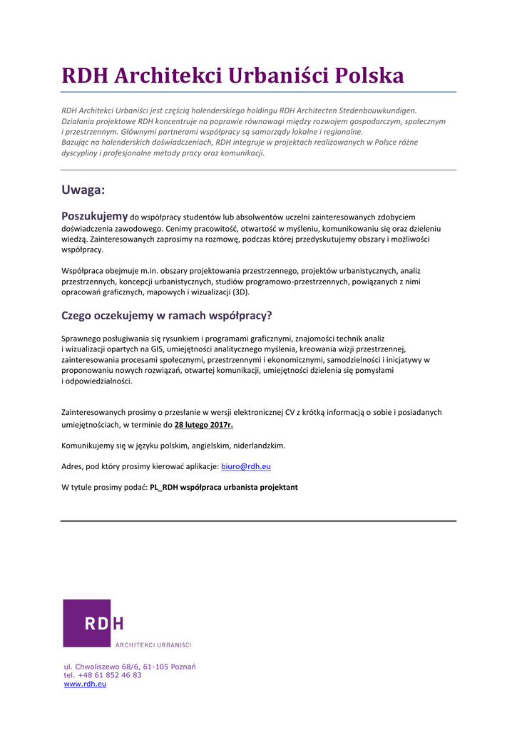 RDH Architekci Urbaniści Polska RDH Architekci Urbaniści jest częścią holenderskiego holdingu RDH Architecten Stedenbouwkundigen. Działania projektowe RDH koncentruje na poprawie równowagi między rozwojem gospodarczym, społecznym i przestrzennym. Głównymi partnerami współpracy są samorządy lokalne i regionalne. Bazując na holenderskich doświadczeniach, RDH integruje w projektach realizowanych w Polsce różne dyscypliny i profesjonalne metody pracy oraz komunikacji. Uwaga: Poszukujemy do współpracy studentów lub absolwentów uczelni zainteresowanych zdobyciem doświadczenia zawodowego. Cenimy pracowitość, otwartość w myśleniu, komunikowaniu się oraz dzieleniu wiedzą. Zainteresowanych zaprosimy na rozmowę, podczas której przedyskutujemy obszary i możliwości współpracy. Współpraca obejmuje m.in. obszary projektowania przestrzennego, projektów urbanistycznych, analiz przestrzennych, koncepcji urbanistycznych, studiów programowo-przestrzennych, powiązanych z nimi opracowań graficznych, mapowych i wizualizacji (3D). Czego oczekujemy w ramach współpracy? Sprawnego posługiwania się rysunkiem i programami graficznymi, znajomości technik analiz i wizualizacji opartych na GIS, umiejętności analitycznego myślenia, kreowania wizji przestrzennej, zainteresowania procesami społecznymi, przestrzennymi i ekonomicznymi, samodzielności i inicjatywy w proponowaniu nowych rozwiązań, otwartej komunikacji, umiejętności dzielenia się pomysłami i odpowiedzialności. Zainteresowanych prosimy o przesłanie w wersji elektronicznej CV z krótką informacją o sobie i posiadanych umiejętnościach, w terminie do 28 lutego 2017r. Komunikujemy się w języku polskim, angielskim, niderlandzkim. Adres, pod który prosimy kierować aplikacje: [email protected] W tytule prosimy podać: PL_RDH współpraca urbanista projektant ul. Chwaliszewo 68/6, 61-105 Poznań tel. +48 61 852 46 83 www.rdh.eu RDH Architekci Urbaniści Polska RDH Architekci Urbaniści is part of the Dutch holding company RDH Architecten Stedenbouwkundigen. Project activities of RDH are focusing on improvement of the balance between economic, social and spatial development of urban and rural areas. Our main clients in cooperation are local and regional authorities in Poland. RDH integrates in her projects different disciplines, working methods and communication which are based on our Dutch experience. Attention: We are looking for students and recent graduates interested in getting professional work experience. We value diligence, openness in thinking, communicating and sharing knowledge. Cooperation includes among others areas of spatial planning, urban design, spatial analysis, urban concepts, spatial and programmatic studies, and linked to them drawings, mapping and visualization (3D). What do we expect in the frame of cooperation? Effective use of drawing and graphics programs, knowledge of analysis and visual techniques based on GIS, analytical thinking, capability of creating spatial visions, interest in social, spatial and economic processes, selfreliance and initiative in proposing new solutions. Open in communication sharing information and ideas, responsibility. If you are interested, please send electronic version of your CV with brief information about yourself and your th skills till 28 February 2017. We will invite a selection of candidates for an interview, during which we will discuss the scope and possibilities of cooperation. We speak Polish, English and Dutch. Please send your application to e-mail address: [email protected] In the title please specify: PL_RDH cooperation urban designer ul. Chwaliszewo 68/6, 61-105 Poznań tel. +48 61 852 46 83 www.rdh.eu