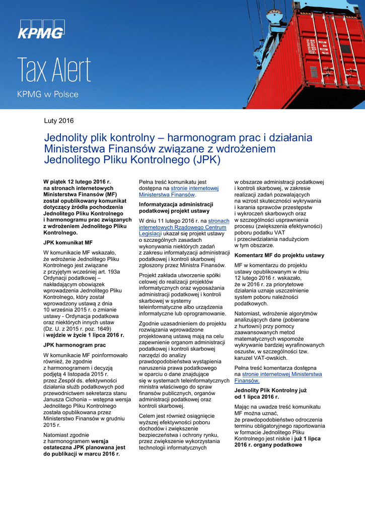 Luty 2016 Jednolity plik kontrolny – harmonogram prac i działania Ministerstwa Finansów związane z wdrożeniem Jednolitego Pliku Kontrolnego (JPK) W piątek 12 lutego 2016 r. na stronach internetowych Ministerstwa Finansów (MF) został opublikowany komunikat dotyczący źródła pochodzenia Jednolitego Pliku Kontrolnego i harmonogramu prac związanych z wdrożeniem Jednolitego Pliku Kontrolnego. JPK komunikat MF W komunikacie MF wskazało, że wdrożenie Jednolitego Pliku Kontrolnego jest związane z przyjętym wcześniej art. 193a Ordynacji podatkowej – nakładającym obowiązek wprowadzenia Jednolitego Pliku Kontrolnego, który został wprowadzony ustawą z dnia 10 września 2015 r. o zmianie ustawy - Ordynacja podatkowa oraz niektórych innych ustaw (Dz. U. z 2015 r. poz. 1649) i wejdzie w życie 1 lipca 2016 r. JPK harmonogram prac W komunikacie MF poinformowało również, że zgodnie z harmonogramem i decyzją podjętą 4 listopada 2015 r. przez Zespół ds. efektywności działania służb podatkowych pod przewodnictwem sekretarza stanu Janusza Cichonia – wstępna wersja Jednolitego Pliku Kontrolnego została opublikowana przez Ministerstwo Finansów w grudniu 2015 r. Natomiast zgodnie z harmonogramem wersja ostateczna JPK planowana jest do publikacji w marcu 2016 r. Pełna treść komunikatu jest dostępna na stronie internetowej Ministerstwa Finansów. w obszarze administracji podatkowej i kontroli skarbowej, w zakresie realizacji zadań pozwalających na wzrost skuteczności wykrywania Informatyzacja administracji i karania sprawców przestępstw podatkowej projekt ustawy i wykroczeń skarbowych oraz W dniu 11 lutego 2016 r. na stronach w szczególności usprawnienia internetowych Rządowego Centrum procesu (zwiększenia efektywności) poboru podatku VAT Legislacji ukazał się projekt ustawy i przeciwdziałania nadużyciom o szczególnych zasadach w tym obszarze. wykonywania niektórych zadań z zakresu informatyzacji administracji Komentarz MF do projektu ustawy podatkowej i kontroli skarbowej zgłoszony przez Ministra Finansów. MF w komentarzu do projektu ustawy opublikowanym w dniu Projekt zakłada utworzenie spółki 12 lutego 2016 r. wskazało, celowej do realizacji projektów że w 2016 r. za priorytetowe informatycznych oraz wyposażania działania uznaje uszczelnienie administracji podatkowej i kontroli system poboru należności skarbowej w systemy podatkowych. teleinformatyczne albo urządzenia informatyczne lub oprogramowanie. Natomiast, wdrożenie algorytmów analizujących dane (pobierane Zgodnie uzasadnieniem do projektu z hurtowni) przy pomocy rozwiązania wprowadzone zaawansowanych metod projektowaną ustawą mają na celu matematycznych wspomoże zapewnienie organom administracji wykrywanie bardziej wyrafinowanych podatkowej i kontroli skarbowej oszustw, w szczególności tzw. narzędzi do analizy karuzel VAT-owskich. prawdopodobieństwa wystąpienia naruszenia prawa podatkowego Pełna treść komentarza dostępna w oparciu o dane znajdujące na stronie internetowej Ministerstwa się w systemach teleinformatycznych Finansów. ministra właściwego do spraw Jednolity Plik Kontrolny już finansów publicznych, organów od 1 lipca 2016 r. administracji podatkowej oraz kontroli skarbowej. Mając na uwadze treść komunikatu MF można uznać, Celem jest również osiągnięcie że prawdopodobieństwo odroczenia wyższej efektywności poboru terminu obligatoryjnego raportowania dochodów i zwiększenie w formacie Jednolitego Pliku bezpieczeństwa i ochrony rynku, Kontrolnego jest niskie i już 1 lipca przez zwiększenie wykorzystania 2016 r. organy podatkowe technologii informatycznych i skarbowe będą mogły żądać od podatników przekazania danych w formacie Jednolitego Pliku Kontrolnego. Zgodnie z przyjętymi przez MF założeniami rezultaty elektronicznej procedury kontroli podatników mają przełożyć sią na zwiększoną skuteczność i wydajność rezultatów kontroli ukierunkowanych na wykrycie nieprawidłowości w rozliczeniach podatników. Jak możemy pomóc? KPMG jest gotowe wspierać Państwa także w kolejnych etapach W związku z intensyfikowanymi wdrażania Jednolitego Pliku działaniami Ministerstwa Finansów Kontrolnego – zarówno w zakresie już dziś niezbędne jest merytoryki podatkowej jak i usług przeprowadzenie procesu weryfikacji informatyczno-technicznych. obecnie stosowanych rozwiązań Jeżeli są Państwo zainteresowani informatycznych co do możliwości takim wsparciem, bardzo prosimy ich dostosowania do nowych o kontakt. Jeżeli są Państwo wymagań prawa podatkowego zainteresowani szczegółami w ramach Jednolitego Pliku dotyczącymi projektowanych Kontrolnego. przepisów, uprzejmie prosimy o kontakt. Informacje zawarte w niniejszej publikacji mają charakter ogólny i nie dotyczą sytuacji konkretnej firmy. Ze względu na szybkość zmian zachodzących w polskim prawodawstwie prosimy o upewnienie się w dniu zapoznania się z niniejszą publikacją, czy informacje w niej zawarte są wciąż aktualne. Przed podjęciem konkretnych decyzji proponujemy skonsultowanie ich z naszymi doradcami. Nazwa i logo KPMG są zastrzeżonymi znakami towarowymi bądź znakami towarowymi KPMG International. © 2016 KPMG Tax M.Michna sp.k. jest polską spółką komandytową i członkiem sieci KPMG składającej się z niezależnych spółek członkowskich stowarzyszonych z KPMG International Cooperative („KPMG International”), podmiotem prawa szwajcarskiego. Wszelkie prawa zastrzeżone. kpmg.pl 3 Kontakt Biura KPMG Andrzej Tajchert Partner Tel. : +48 22 528 11 01 Faks: +48 22 528 10 59 [email protected] Warszawa ul. Inflancka 4a 00-189 Warszawa Tel. : +48 22 528 11 00 Faks: +48 22 528 10 09 [email protected] Gdańsk al. Zwycięstwa 13a 80-219 Gdańsk Tel. : +48 58 772 95 00 Faks: +48 58 772 95 01 [email protected] Kraków al. Armii Krajowej 18 30-150 Kraków Tel. : +48 12 424 94 00 Faks: +48 12 424 94 01 [email protected] Katowice