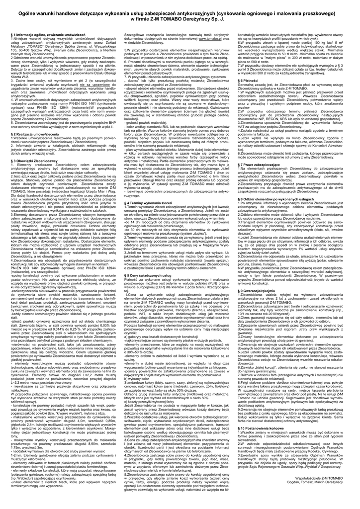 Ogólne warunki handlowe dotyczące wykonania usług zabezpieczeń antykorozyjnych (cynkowania ogniowego i malowania proszkowego) w firmie Z-M TOMABO DereŜyńscy Sp. J. § 1 Informacje ogólne, zawieranie umów/zleceń 1.Niniejsze warunki dotyczą wszystkich umów/zleceń dotyczących usług zabezpieczeń antykorozyjnych zawieranych przez Zakład Metalowy „TOMABO” DereŜyńscy Spółka Jawna, ul. Wyszyńskiego 135, 66-400 Gorzów Wlkp. zwanym dalej Zleceniobiorcą, a klientem zwanym dalej Zleceniodawcą. 2.Odmienne warunki umowy/zlecenia proponowane poprzez Zleceniodawcę obowiązują tylko i wyłącznie wówczas, gdy zostały zaakceptowane przez Zleceniobiorcę w jednoznaczny sposób i na piśmie. Dotyczy to w szczególności dodatkowych zmian i zastrzeŜeń dokonywanych telefonicznie lub w inny sposób z pracownikami Działu Obsługi Klienta W-2. 3. śadne inne osoby, niŜ wymienione w pkt 2 (w szczególności brygadziści zmianowi wydziału ocynkowni) nie są uprawnione do uzgadniania zmian warunków wykonania zlecenia, warunków handlowych oraz zawierania umów/zleceń dotyczących wykonania usług antykorozyjnych. 4. W umowach/zleceniach dotyczących zabezpieczeń antykorozyjnych nadrzędne zastosowanie mają normy PN-EN ISO 1461 (cynkowanie ogniowe) oraz PN-EN ISO 12944 (malowanie).W przypadkach szczególnych wymagań wykraczających poza treść w/w norm wymagane jest pisemne ustalenie warunków wykonania i odbioru powłok poprze Zleceniodawcę i Zleceniobiorcę. 5. Zleceniodawca zobowiązany jest do przestrzegania przepisów BHP oraz ochrony środowiska wynikających z norm wymienionych w pkt 4. § 2 Realizacja umowy/zlecenia 1.Wszelkie umowy/zlecenia realizowane będą po pisemnym potwierdzeniu warunków poprzez Zleceniodawcę i Zleceniobiorcę. 2. Informacje zawarte w katalogach, ulotkach reklamowych mają jedynie charakter orientacyjny. Zleceniobiorca zastrzega sobie prawo do ich zmiany w kaŜdej chwili. § 3 Obowiązki Zleceniodawcy 1. Elementy przekazane Zleceniobiorcy celem zabezpieczenia antykorozyjnego powinny być dostarczone wraz ze specyfikacją zawierającą nazwę detalu, ilość sztuk oraz cięŜar całkowity. 2.Ilośc sztuk oraz cięŜar całkowity podane przez Zleceniodawcę nie są wiąŜące. Stanowią jedynie pomoc dla pracowników Zleceniobiorcy celem dalszych czynności pomiarowych. Zleceniobiorca zwaŜy dostarczone elementy na wagach zainstalowanych na terenie Z-M TOMABO, które posiadają świadectwa legalizacji Urzędu Miar i Wag. Dla duŜej liczebności dostarczonych elementów przez zleceniodawcę oraz w warunkach utrudnionej kontroli ilości sztuk podczas przyjęcia towaru Zleceniobiorca przyjmie przybliŜoną ilość sztuk jedynie w celach orientacyjnych i nie ponosi odpowiedzialności za późniejsze roszczenia zleceniodawcy wynikające z rozbieŜności w sztukach. 3.Elementy dostarczane przez Zleceniodawcę własnym transportem, celem zabezpieczeń antykorozyjnych powinny być dostosowane do rozładunku wózkiem widłowym lub urządzeniami dźwigowymi, stosując palety drewniane, stojaki, przekładki drewniane. Drobne elementy naleŜy zapakować w pojemniki lub na palety dokładnie owinięte folią termokurczliwą lub strecz oraz spięte taśmą stalową lub z tworzywa sztucznego w taki sposób, aby nie zagraŜały zdrowiu i Ŝyciu pracowników Zleceniobiorcy dokonujących rozładunku. Dostarczone elementy, których nie moŜna rozładować z uŜyciem urządzeń mechanicznych Zleceniodawca rozładuje samodzielnie na wskazane przez Zleceniobiorcę palety lub stojaki. Pomoc przy rozładunku jest dobrą wolą Zleceniobiorcy, a nie obowiązkiem! 4.Zleceniodawca ma obowiązek do przystosowania dostarczonych konstrukcji, tak aby odpowiadały wymogom stawianym w normach PN-EN ISO 1461 (cynkowanie ogniowe) oraz PN-EN ISO 12944 (malowanie), a w szczególności: -spoiny konstrukcji powinny być wykonane półautomatem w osłonie gazów ochronnych. Nie zaleca się spawania elektrodą otuloną, ze względu na wystąpienie braku ciągłości powłoki cynkowej, w przypadku nie oczyszczenia zgorzeliny spawalniczej, -zanieczyszczenia nieusuwalne w procesie przygotowania powierzchni do cynkowania stare powłoki malarskie, oznakowanie farbami, permanentnymi markerami stosowanymi do trasowania oraz identyfikacji detali podczas produkcji, zanieczyszczenia lakierami, smołami Ŝywicznymi, środkami anty odpryskowymi, spieki spawalnicze muszą by bezwzględnie usunięte przez Zleceniodawcę, -kaŜdy element konstrukcyjny powinien składać się z jednego gatunku stali, -jakość powłoki cynkowej uzaleŜniona jest od składu chemicznego stali. Zawartość krzemu w stali powinna wynosić poniŜej 0,03% lub mieścić się w przedziale od 0,014% do 0,25 %. W przypadku zastosowania przez Zleceniodawcę stali o własnościach nie spełniających powyŜszego wymogu naleŜy powiadomić o tym fakcie Zleceniobiorcę oraz przedstawić certyfikat zakupu z podanym składem chemicznym, -nierówności na powierzchni stali, takie jak zawalcowania, wŜery zgorzelinowe, wŜery korozyjne, łuski, naderwania i inne nieciągłości po cynkowaniu stają się bardziej widoczne. Celem uzyskania gładkiej powierzchni po cynkowaniu Zleceniodawca musi dostarczyć element o gładkiej powierzchni, - elementy konstrukcyjne muszą posiadać odpowiednie otwory technologiczne, słuŜące odpowietrzeniu oraz swobodnemu przepływu cynku na zewnątrz i wewnątrz elementu oraz do zawieszenia na linii do cynkowania. Elementy rurowe do długości L=2,2 metra muszą posiadać jeden otwór na podwieszenie, natomiast powyŜej długości L=2,2 metra muszą posiadać dwa otwory, - niewskazane są zamknięte przekroje skrzynkowe oraz połączenia nakładkowe. W przypadku połączenia spawanego, nakładkowego spoina powinna być wykonana szczelnie ze wszystkich stron (w razie potrzeby naleŜy szlifować spawy), - konstrukcje nie powinny posiadać małych szczelin lub wnęk, poniewaŜ powodują po cynkowaniu wyp
