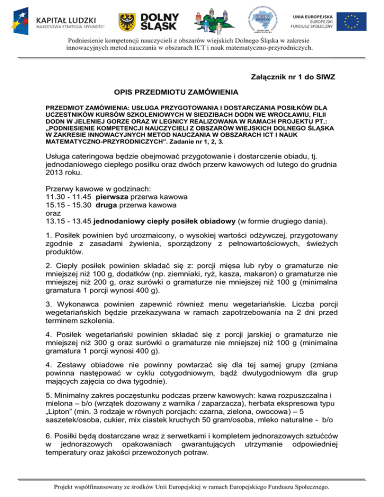 Załącznik nr 1 do SIWZ OPIS PRZEDMIOTU ZAMÓWIENIA PRZEDMIOT ZAMÓWIENIA: USŁUGA PRZYGOTOWANIA I DOSTARCZANIA POSIŁKÓW DLA UCZESTNIKÓW KURSÓW SZKOLENIOWYCH W SIEDZIBACH DODN WE WROCŁAWIU, FILII DODN W JELENIEJ GORZE ORAZ W LEGNICY REALIZOWANA W RAMACH PROJEKTU PT.: „PODNIESIENIE KOMPETENCJI NAUCZYCIELI Z OBSZARÓW WIEJSKICH DOLNEGO ŚLĄSKA W ZAKRESIE INNOWACYJNYCH METOD NAUCZANIA W OBSZARACH ICT I NAUK MATEMATYCZNO-PRZYRODNICZYCH”. Zadanie nr 1, 2, 3. Usługa cateringowa będzie obejmować przygotowanie i dostarczenie obiadu, tj. jednodaniowego ciepłego posiłku oraz dwóch przerw kawowych od lutego do grudnia 2013 roku. Przerwy kawowe w godzinach: 11.30 - 11.45 pierwsza przerwa kawowa 15.15 - 15.30 druga przerwa kawowa oraz 13.15 - 13.45 jednodaniowy ciepły posiłek obiadowy (w formie drugiego dania). 1. Posiłek powinien być urozmaicony, o wysokiej wartości odżywczej, przygotowany zgodnie z zasadami żywienia, sporządzony z pełnowartościowych, świeżych produktów. 2. Ciepły posiłek powinien składać się z: porcji mięsa lub ryby o gramaturze nie mniejszej niż 100 g, dodatków (np. ziemniaki, ryż, kasza, makaron) o gramaturze nie mniejszej niż 200 g, oraz surówki o gramaturze nie mniejszej niż 100 g (minimalna gramatura 1 porcji wynosi 400 g). 3. Wykonawca powinien zapewnić również menu wegetariańskie. Liczba porcji wegetariańskich będzie przekazywana w ramach zapotrzebowania na 2 dni przed terminem szkolenia. 4. Posiłek wegetariański powinien składać się z porcji jarskiej o gramaturze nie mniejszej niż 300 g oraz surówki o gramaturze nie mniejszej niż 100 g (minimalna gramatura 1 porcji wynosi 400 g). 4. Zestawy obiadowe nie powinny powtarzać się dla tej samej grupy (zmiana powinna następować w cyklu cotygodniowym, bądź dwutygodniowym dla grup mających zajęcia co dwa tygodnie). 5. Minimalny zakres poczęstunku podczas przerw kawowych: kawa rozpuszczalna i mielona – b/o (wrzątek dozowany z warnika / zaparzacza), herbata ekspresowa typu „Lipton” (min. 3 rodzaje w równych porcjach: czarna, zielona, owocowa) – 5 saszetek/osoba, cukier, mix ciastek kruchych 50 gram/osoba, mleko naturalne - b/o 6. Posiłki będą dostarczane wraz z serwetkami i kompletem jednorazowych sztućców w jednorazowych opakowaniach gwarantujących utrzymanie odpowiedniej temperatury oraz jakości przewożonych potraw. Projekt współfinansowany ze środków Unii Europejskiej w ramach Europejskiego Funduszu Społecznego. 7. W ramach zamówienia Wykonawca przygotuje i dostarczy posiłki o wyznaczonych godzinach do miejsc określonych w opisach poszczególnych zadań. 8. Zamawiający zastrzega sobie prawo określenia na 2 dni przed terminem szkolenia dokładnej liczby uczestników kursu danej grupy z możliwością zwiększenia lub zmniejszenia o maksymalnie 4 osoby. Wnioskodawca winien dołączyć do oferty informacje dotyczące średniej gramatury oferowanych posiłków oraz 4 przykładowe menu na cztery kolejne tygodnie (jedno menu na jeden tydzień). Harmonogram zajęć ZADANIE NR 1 DODN we Wrocławiu, ul. Komuny Paryskiej 19a Łączna liczba posiłków – 1096 Zadanie 1. Harmonogram usługi cateringowej we Wrocławiu w 2013 r. Lp. 1 Liczba zjazdów/dzień tygodnia dla poszczególnych grup 6 / poniedziałek 2 6 / wtorek 3 5 /środa 4 6 / czwartek 5 6 / piątek 6 6 / sobota Termin szkoleń 11.02.2013 r. 25.02.2012 r. 11.03.2013 r. 08.04.2013 r. 06.05.2013 r. 12.02.2013 r. 19.02.2013 r. 26.02.2013 r. 05.03.2013 r. 12.03.2013 r. 13.02.2013 r. 27.02.2013 r. 13.03.2013 r. 10.04.2013 r. 14.02.2013 r. 21.02.2013 r. 07.03.2013 r. 21.03.2013 r. 18.04.2013 r. 15.02.2013 r. 22.02.2013 r. 01.03.2013 r. 08.03.2013 r. 15.03.2013 r. 16.02.2013 r. 02.03.2013 r. 16.03.2013 r. 06.04.2013 r. 20.04.2013 r. Numer grupy Liczba osób w grupie G 16-60W 16 (+/- 20%) G18-60W 16 (+/- 20%) G 11-40W 20 (+/- 20%) G 20-60W 16 (+/- 20%) G22-60W 16 (+/- 20%) G 24-60W 16 (+/- 20%) Projekt współfinansowany ze środków Unii Europejskiej w ramach Europejskiego Funduszu Społecznego. 7 10 / poniedziałek -czwartek 8 10 / wtorek 9 10 / piątek 11.05.2013 r. 18.02.2013 r. 28.02.2013 r. 04.03.2013 r. 14.03.2013 r. 18.03.2013 r. 11.04.2013 r. 15.04.2013 r. 09.05.2013 r. 13.05.2013 r. 23.05.2013 r. 05.03.2013 r. 12.03.2013 r. 19.03.2013 r. 09.04.2013 r. 16.04.2013 r. 07.05.2013 r. 14.05.2013 r. 21.05.2013 r. 28.05.2013 r. 04.06.2013 r. 08.03.2013 r. 15.03.2013 r. 22.03.2013 r. 12.04.2013 r. 19.04.2013 r. 10.05.2013 r. 17.05.2013 r. 24.05.2013 r. 31.05.2013 r. 07.06.2013 r. G 01-100W 20 (+/- 20%) G 03-100W 20 (+/- 20%) G 05-100W 20 (+/- 20%) ZADANIE NR 2 Filia DODN w Legnicy, ul. Skarbowa 5 Łączna liczba posiłków – 844 Zadanie 2. Harmonogram usługi cateringowej w Legnicy w 2013 r. Lp. 1 Liczba zjazdów dla poszczególnych grup 6 / poniedziałek 2 6 / wtorek Termin szkoleń 11.02.2013 r. 25.02.2013 r. 11.03.2013 r. 08.04.2013 r. 06.05.2013 r. 12.02.2013 r. 19.02.2013 r. 26.02.2013 r. 05.03.2013 r. G 17-60L Liczba osób w grupie 16 (+/- 20%) G 19-60L 16 (+/- 20%) Numer grupy Projekt współfinansowany ze środków Unii Europejskiej w ramach Europejskiego Funduszu Społecznego. 3 10 / środa 4 6 / czwartek 5 4 / piątek 6 10 / poniedziałek 7 8 / piątek 12.03.2013 r. 13.02.2013 r. 27.02.2013 r. 06.03.2013 r. 20.03.2013 r. 10.04.2013 r. 08.05.2013 r. 15.05.2013 r. 29.05.2013 r. 05.06.2013 r. 14.02.2013 r. 21.02.2013 r. 07.03.2013 r. 21.03.2013 r. 18.04.2013 r. 22.02.2013 r. 01.03.2013 r. 08.03.2013 r. 15.03.2013 r. 18.02.2013 r. 28.02.2013 r. 04.03.2013 r. 14.03.2013 r. 18.03.2013 r. 11.04.2013 r. 15.04.2013 r. 09.05.2013 r. 13.05.2013 r. 23.05.2013 r. 22.03.2013 r. 12.04.2013 r. 19.04.2013 r. 10.05.2013 r. 17.05.2013 r. 24.05.2013 r. 31.05.2013 r. 07.06.2013 r. G 04-100L 20 (+/- 20%) G 21-60L 16 (+/- 20%) G 23-60L 16 (+/- 20%) G 02-100L 20 (+/- 20%) G 06-100L 20 (+/- 20%) ZADANIE NR 3 Filia DODN w Jeleniej Górze, ul. 1 maja 43 Łączna ilość posiłków - 56 Zadanie 3. Harmonogram us