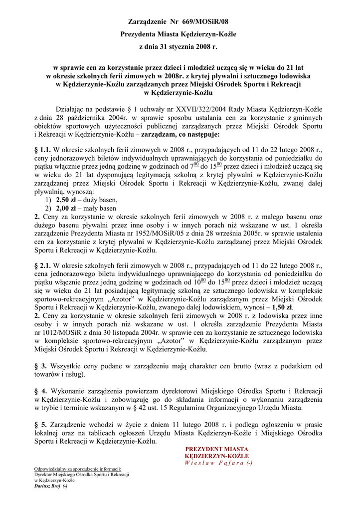 Zarządzenie Nr 669/MOSiR/08 Prezydenta Miasta Kędzierzyn-Koźle z dnia 31 stycznia 2008 r. w sprawie cen za korzystanie przez dzieci i młodzieŜ uczącą się w wieku do 21 lat w okresie szkolnych ferii zimowych w 2008r. z krytej pływalni i sztucznego lodowiska w Kędzierzynie-Koźlu zarządzanych przez Miejski Ośrodek Sportu i Rekreacji w Kędzierzynie-Koźlu Działając na podstawie § 1 uchwały nr XXVII/322/2004 Rady Miasta Kędzierzyn-Koźle z dnia 28 października 2004r. w sprawie sposobu ustalania cen za korzystanie z gminnych obiektów sportowych uŜyteczności publicznej zarządzanych przez Miejski Ośrodek Sportu i Rekreacji w Kędzierzynie-Koźlu – zarządzam, co następuje: § 1.1. W okresie szkolnych ferii zimowych w 2008 r., przypadających od 11 do 22 lutego 2008 r., ceny jednorazowych biletów indywidualnych uprawniających do korzystania od poniedziałku do piątku włącznie przez jedną godzinę w godzinach od 700 do 1500 przez dzieci i młodzieŜ uczącą się w wieku do 21 lat dysponującą legitymacją szkolną z krytej pływalni w Kędzierzynie-Koźlu zarządzanej przez Miejski Ośrodek Sportu i Rekreacji w Kędzierzynie-Koźlu, zwanej dalej pływalnią, wynoszą: 1) 2,50 zł – duŜy basen, 2) 2,00 zł – mały basen 2. Ceny za korzystanie w okresie szkolnych ferii zimowych w 2008 r. z małego basenu oraz duŜego basenu pływalni przez inne osoby i w innych porach niŜ wskazane w ust. 1 określa zarządzenie Prezydenta Miasta nr 1952/MOSiR/05 z dnia 28 września 2005r. w sprawie ustalenia cen za korzystanie z krytej pływalni w Kędzierzynie-Koźlu zarządzanej przez Miejski Ośrodek Sportu i Rekreacji w Kędzierzynie-Koźlu. § 2.1. W okresie szkolnych ferii zimowych w 2008 r., przypadających od 11 do 22 lutego 2008 r., cena jednorazowego biletu indywidualnego uprawniającego do korzystania od poniedziałku do piątku włącznie przez jedną godzinę w godzinach od 1000 do 1500 przez dzieci i młodzieŜ uczącą się w wieku do 21 lat posiadającą legitymację szkolną ze sztucznego lodowiska w kompleksie sportowo-rekreacyjnym „Azotor” w Kędzierzynie-Koźlu zarządzanym przez Miejski Ośrodek Sportu i Rekreacji w Kędzierzynie-Koźlu, zwanego dalej lodowiskiem, wynosi – 1,50 zł. 2. Ceny za korzystanie w okresie szkolnych ferii zimowych w 2008 r. z lodowiska przez inne osoby i w innych porach niŜ wskazane w ust. 1 określa zarządzenie Prezydenta Miasta nr 1012/MOSiR z dnia 30 listopada 2004r. w sprawie cen za korzystanie ze sztucznego lodowiska w kompleksie sportowo-rekreacyjnym „Azotor” w Kędzierzynie-Koźlu zarządzanym przez Miejski Ośrodek Sportu i Rekreacji w Kędzierzynie-Koźlu. § 3. Wszystkie ceny podane w zarządzeniu mają charakter cen brutto (wraz z podatkiem od towarów i usług). § 4. Wykonanie zarządzenia powierzam dyrektorowi Miejskiego Ośrodka Sportu i Rekreacji w Kędzierzynie-Koźlu i zobowiązuję go do składania informacji o wykonaniu zarządzenia w trybie i terminie wskazanym w § 42 ust. 15 Regulaminu Organizacyjnego Urzędu Miasta. § 5. Zarządzenie wchodzi w Ŝycie z dniem 11 lutego 2008 r. i podlega ogłoszeniu w prasie lokalnej oraz na tablicach ogłoszeń Urzędu Miasta Kędzierzyn-Koźle i Miejskiego Ośrodka Sportu i Rekreacji w Kędzierzynie-Koźlu. PREZYDENT MIASTA KĘDZIERZYN-KOŹLE W i e s ł a w F ą f a r a (-) Odpowiedzialny za sporządzenie informacji: Dyrektor Miejskiego Ośrodka Sportu i Rekreacji w Kędzierzyn-Koźle Dariusz Broj (-)