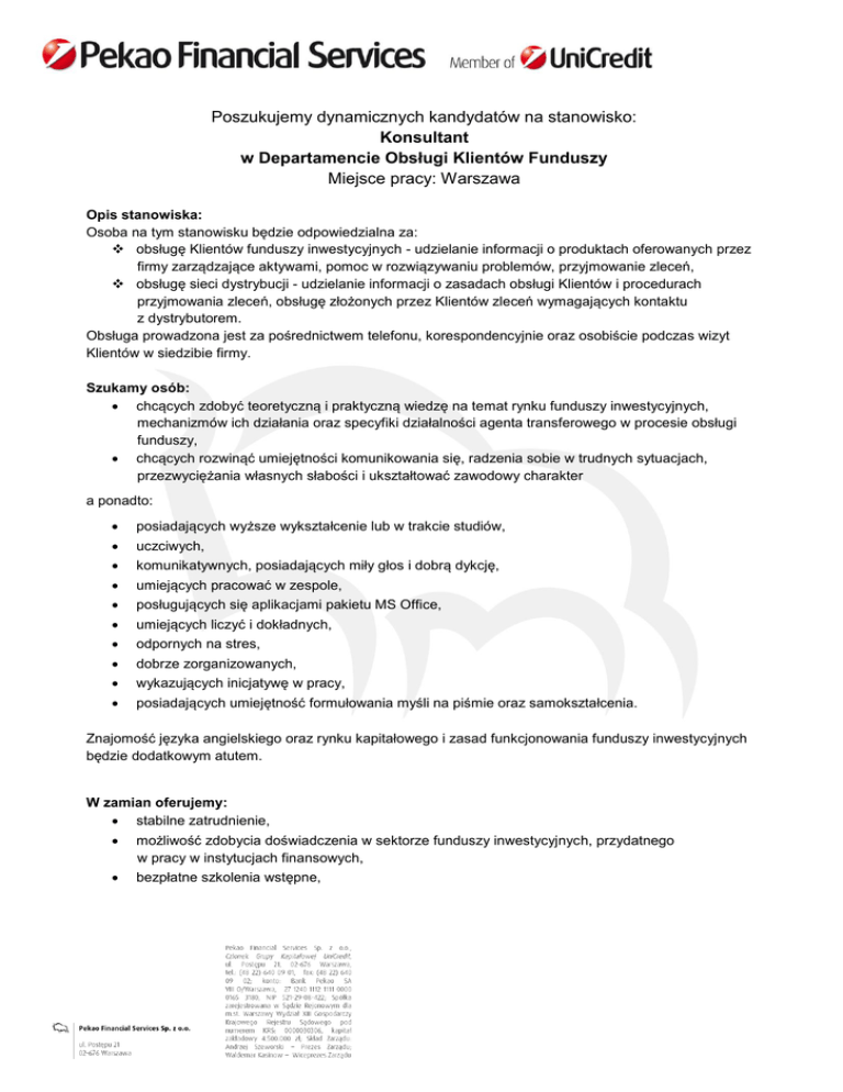 Poszukujemy dynamicznych kandydatów na stanowisko: Konsultant w Departamencie Obsługi Klientów Funduszy Miejsce pracy: Warszawa Opis stanowiska: Osoba na tym stanowisku będzie odpowiedzialna za: obsługę Klientów funduszy inwestycyjnych - udzielanie informacji o produktach oferowanych przez firmy zarządzające aktywami, pomoc w rozwiązywaniu problemów, przyjmowanie zleceń, obsługę sieci dystrybucji - udzielanie informacji o zasadach obsługi Klientów i procedurach przyjmowania zleceń, obsługę złożonych przez Klientów zleceń wymagających kontaktu z dystrybutorem. Obsługa prowadzona jest za pośrednictwem telefonu, korespondencyjnie oraz osobiście podczas wizyt Klientów w siedzibie firmy. Szukamy osób: chcących zdobyć teoretyczną i praktyczną wiedzę na temat rynku funduszy inwestycyjnych, mechanizmów ich działania oraz specyfiki działalności agenta transferowego w procesie obsługi funduszy, chcących rozwinąć umiejętności komunikowania się, radzenia sobie w trudnych sytuacjach, przezwyciężania własnych słabości i ukształtować zawodowy charakter a ponadto: posiadających wyższe wykształcenie lub w trakcie studiów, uczciwych, komunikatywnych, posiadających miły głos i dobrą dykcję, umiejących pracować w zespole, posługujących się aplikacjami pakietu MS Office, umiejących liczyć i dokładnych, odpornych na stres, dobrze zorganizowanych, wykazujących inicjatywę w pracy, posiadających umiejętność formułowania myśli na piśmie oraz samokształcenia. Znajomość języka angielskiego oraz rynku kapitałowego i zasad funkcjonowania funduszy inwestycyjnych będzie dodatkowym atutem. W zamian oferujemy: stabilne zatrudnienie, możliwość zdobycia doświadczenia w sektorze funduszy inwestycyjnych, przydatnego w pracy w instytucjach finansowych, bezpłatne szkolenia wstępne, elastyczne i zarazem stałe godziny pracy (praca zmianowa w godzinach 8:00 – 19:00), wolne weekendy, udział w ciekawych i rozwojowych projektach, szkolenia podnoszące kwalifikacje. Zgłoszenia zawierające list motywacyjny i CV prosimy przesyłać na adres e-mailowy: [email protected] W temacie prosimy o podanie numeru referencyjnego: COK Informujemy, że odpowiemy tylko na wybrane zgłoszenia. Do aplikacji prosimy o dopisanie następującej treści klauzuli: „Wyrażam zgodę na przetwarzanie moich danych osobowych zawartych w ofercie pracy dla potrzeb niezbędnych do realizacji procesu rekrutacji (zgodnie z ustawą z 29.08.1997 r. o ochronie danych osobowych, Dz.U. nr 133, poz. 883)”.