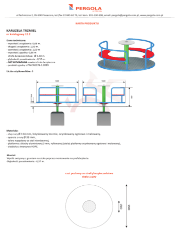 ul.Techniczna 2, 05-500 Piaseczno, tel./fax 22 845 62 75, tel. kom. 501-130-598, email: [email protected], www pergola.com.pl KARTA PRODUKTU KARUZELA TRZMIEL nr katalogowy 12.2 Dane techniczne: - wysokoœæ urz¹dzenia: 0,66 m. - d³ugoœæ urz¹dzenia: 1,50 m. - szerokoœæ urz¹dzenia: 1,50 m - wysokoœæ upadku: 0,66 m - strefa bezpieczeñstwa: O 5,50 m - g³êbokoœæ posadowienia: -0,57 m. - NIE WYMAGANA nawierzchnia bezpieczna - produkt zgodny z PN-EN1176-1:2009 Liczba u¿ytkowników: 6 Materia³y: - s³up rury O 114 mm, ³o¿yskowany tocznie, ocynkowany ogniowo i malowany, - oparcia z rury O 33 mm , - talerz napêdowy ze stali nierdzewnej, - platforma z blachy aluminiowej 3 mm, ryflowanej (stela¿ platformy ocynkowany ogniowo i malowany), - siedziska z tworzywa HDPE. Monta¿: Wyrób zwi¹zany z gruntem na sta³e poprzez montowanie na prefabrykacie. G³êbokoœæ posadowienia: -0,57 m. rzut poziomy ze stref¹ bezpieczeñstwa skala 1:100 5500 1500