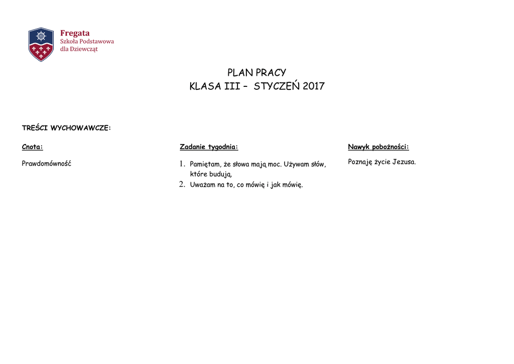 PLAN PRACY KLASA III – STYCZEŃ 2017 TREŚCI WYCHOWAWCZE: Cnota: Zadanie tygodnia: Prawdomówność 1. Pamiętam, że słowa mają moc. Używam słów, które budują. 2. Uważam na to, co mówię i jak mówię. Nawyk pobożności: Poznaję życie Jezusa. PORANEK: Patron miesiąca: Obrazy: Wiersz / proza: Audycje muzyczne: Lektura: Św. Jan Kanty Portret małżonków Arnolfinich Jan van Przedstawienie „Święta w Bullerbyn” G. Bizet „Carmen cz.1 E.H. Porter Styczeń „Pollyanna” Eyck A. Vivaldi „Cztery pory roku. Zima” Rok z Lineą Ortografia „Uwaga” M. Ende „Momo” – zadanie na ferie zimowe TREŚCI EDUKACYJNE: przedmiot Edukacja polonistyczna Edukacja matematyczna Edukacja społeczno przyrodnicza Edukacja muzyczna Język angielski - tematyka Przygotowanie do uroczystości z okazji Dnia Babci i Dziadka Omówienie lektury „Pollyanna” Przypomnienie wiadomości na temat rzeczowników, czasowników, przymiotników, liczebników i przysłówków Odmiana czasownika przez osoby w różnych czasach Omówienie baśni „O 12 miesiącach” Mikołaj Kopernik Wyrażenia związane z czasem Obliczenia zegarowe Obliczenia kalendarzowe Kolejność wykonywania działań Zmiany zachodzące w przyrodzie Przyczyny powstawania dnia i nocy oraz pór roku Kolędy – przygotowanie do Orszaku Trzech Króli Przygotowanie do uroczystości Dnia Babci i Dziadka 1. Powtórzenie materiału z I trymestru słownictwo: sformułowania: 2. Nazwy zwierząt: meerkat - surykatka Snakes live in the desert. Węże żyją na pustyni. lizard - jaszczurka ostrich - struś vulture - sęp armadillo - pancernik swordfish - ryba miecz starfish - rozgwiazda crab - krab octopus - ośmiornica whale - wieloryb chameleon - kameleon baboon - pawian moose - łoś polar bear - niedźwiedź polarny walrus - mors Starfish live in the ocean. Baboons live in the jungle. Rozgwiazdy żyją w oceanie. Pawiany żyją w dżungli. 3. Środowisko życia zwierząt: desert- pustynia ocean - ocean jungle - dżungla polar lands - strefa polarna Psychomotoryka Kształtowanie umiejętności nawiązywania i utrzymania poprawnych kontaktów z rówieśnikami i osobami dorosłymi, współpracy w grupie. Zadania: Zabawy bieżne, skoczne, rzutne. Zabawy na śniegu Hartowanie organizmu Zasady bezpieczeństwa w czasie zabaw na śniegu marszobiegi terenowe Wprowadzenie do mini koszykówki ( nauka poruszania się po boisku z piłką i bez piłki) Język kaszubski leksyka: nazwy miesięcy nauka czytania: zwrócenie uwagi na wymowę kaszubskich głosek tańce kaszubskie - historia i leksyka Klucz do sezamu bajki kaszubskiej: baśnie i legendy gdańskie w opracowaniu J. Sampa Zajęcia komputerowe Bitwa morska - algorytmy przeszukiwania styczeń 2017 – klasa III poniedziałek 2 wtorek 3 środa 4 Urodziny Helenki 11 czwartek piątek 5 6 Pollyanna ORSZAK TRZECH KRÓLI 12 13 sobota niedziela 7 1 8 14 15 9 10 Olimpusek zintegrowana Olimpusek - angielski 16 17 18 19 20 21 22 Ferie – czytam „Momo” Ferie – czytam „Momo” Ferie – czytam „Momo” Ferie – czytam „Momo” Ferie – czytam „Momo” Ferie – czytam „Momo” Ferie – czytam „Momo” 23 24 25 26 27 28 29 Ferie – czytam „Momo” Ferie – czytam „Momo” Ferie – czytam „Momo” Ferie – czytam „Momo” Ferie – czytam „Momo” Ferie – czytam „Momo” Ferie – czytam „Momo” 30 31 Dzień Babci i Dziadka