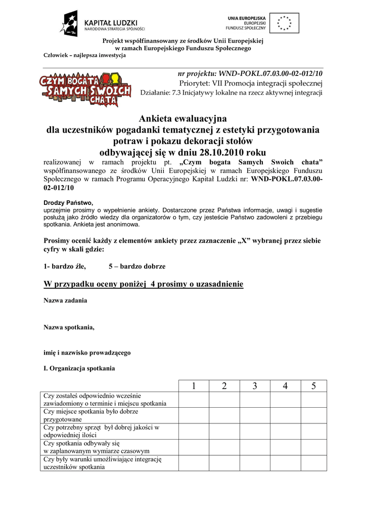 Projekt współfinansowany ze środków Unii Europejskiej w ramach Europejskiego Funduszu Społecznego Człowiek – najlepsza inwestycja nr projektu: WND-POKL.07.03.00-02-012/10 Priorytet: VII Promocja integracji społecznej Działanie: 7.3 Inicjatywy lokalne na rzecz aktywnej integracji Ankieta ewaluacyjna dla uczestników pogadanki tematycznej z estetyki przygotowania potraw i pokazu dekoracji stołów odbywającej się w dniu 28.10.2010 roku realizowanej w ramach projektu pt. „Czym bogata Samych Swoich chata” współfinansowanego ze środków Unii Europejskiej w ramach Europejskiego Funduszu Społecznego w ramach Programu Operacyjnego Kapitał Ludzki nr: WND-POKL.07.03.0002-012/10 Drodzy Państwo, uprzejmie prosimy o wypełnienie ankiety. Dostarczone przez Państwa informacje, uwagi i sugestie posłużą jako źródło wiedzy dla organizatorów o tym, czy jesteście Państwo zadowoleni z przebiegu spotkania. Ankieta jest anonimowa. Prosimy ocenić każdy z elementów ankiety przez zaznaczenie „X” wybranej przez siebie cyfry w skali gdzie: 1- bardzo źle, 5 – bardzo dobrze W przypadku oceny poniżej 4 prosimy o uzasadnienie Nazwa zadania Nazwa spotkania, imię i nazwisko prowadzącego I. Organizacja spotkania 1 Czy zostałeś odpowiednio wcześnie zawiadomiony o terminie i miejscu spotkania Czy miejsce spotkania było dobrze przygotowane Czy potrzebny sprzęt był dobrej jakości w odpowiedniej ilości Czy spotkania odbywały się w zaplanowanym wymiarze czasowym Czy były warunki umożliwiające integrację uczestników spotkania 2 3 4 5 Projekt współfinansowany ze środków Unii Europejskiej w ramach Europejskiego Funduszu Społecznego Człowiek – najlepsza inwestycja Uzasadnienie oceny (poniżej 4) ………………………………………………………………………………………………… ………………………………………………………………………………………………… ………………………………………………………………………………………………… II. Prowadzący 1 2 3 4 5 Czy treść spotkania odpowiadała jego tematowi (nazwie) Czy prowadzący był dobrze przygotowany merytorycznie do prowadzenia spotkania Czy treść była przekazywana w zrozumiały i przystępny sposób Czy spotkanie zawierało zadania/ prace zespołowe umożliwiające przećwiczenie zdobytej wiedzy Czy prowadzący był dobrze nastawiony do uczestników, odpowiadał na pytania, udzielał dodatkowych wyjaśnień Czy podczas spotkania panowała dobra atmosfera sprzyjająca komunikacji i współpracy Uzasadnienie oceny (poniżej 4) ………………………………………………………………………………………………… ………………………………………………………………………………………………… ………………………………………………………………………………………………… ………………………………………………………………………………………………… III. Przydatność spotkania 1 Czy spotkanie spełniło Twoje oczekiwania Czy spotkanie poszerzyło Twoje umiejętności Czy nabyte umiejętności będą przydatne w działaniach na rzecz rozwoju własnej wsi Czy po spotkaniu masz nowe pomysły, które chciałbyś zastosować w przyszłości Czy poleciłbyś te spotkanie innym 2 3 4 5 Projekt współfinansowany ze środków Unii Europejskiej w ramach Europejskiego Funduszu Społecznego Człowiek – najlepsza inwestycja Uzasadnienie oceny (poniżej 4) ………………………………………………………………………………………………… ………………………………………………………………………………………………… ………………………………………………………………………………………………… IV. Ocena ogólna 1 2 3 4 5 Czy ogólnie rzecz biorąc jesteś zadowolony z spotkania Uzasadnienie oceny (poniżej 4) ………………………………………………………………………………………………… ………………………………………………………………………………………………… ………………………………………………………………………………………………… ………………………………………………………………………………………………… Podczas spotkania: a) Najbardziej podobało mi się ......................................................................................... .............................................................................................................................................. b) Przede wszystkim zabrakło mi............................................................................................. ……………………………………………………………………………………………. Sugestie, uwagi wobec spotkania z tej tematyki ………………………………………………………………………………………………. ………………………………………………………………………………………………. ………………………………………………………………………………………………. ……………………………………………………………………………………………….