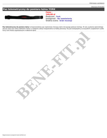 Informacje o produkcie Utworzono 07-03-2017 Pas telemetryczny do pomiaru tętna YORK Cena : 149,00 zł Producent : York Dostępność : Na zamówienie Średnia ocena : brak recenzji B EN E- FI T .p l Pas telemetryczny do pomiaru tętna to bezprzewodowy pas napiersiowy mierzący tętno ćwiczącego podczas treningu. W celu uzyskania optymalnego odczytu tętna pas należy delikatnie zwilżyć a następnie założyć bezpośrednio na klatkę piersiową. Pas jest kompatybilny ze wszystkimi urządzeniami cardio firmy York Fitness wyposażonymi w odbiornik tętna. Wygenerowano w programie www.oscGold.com