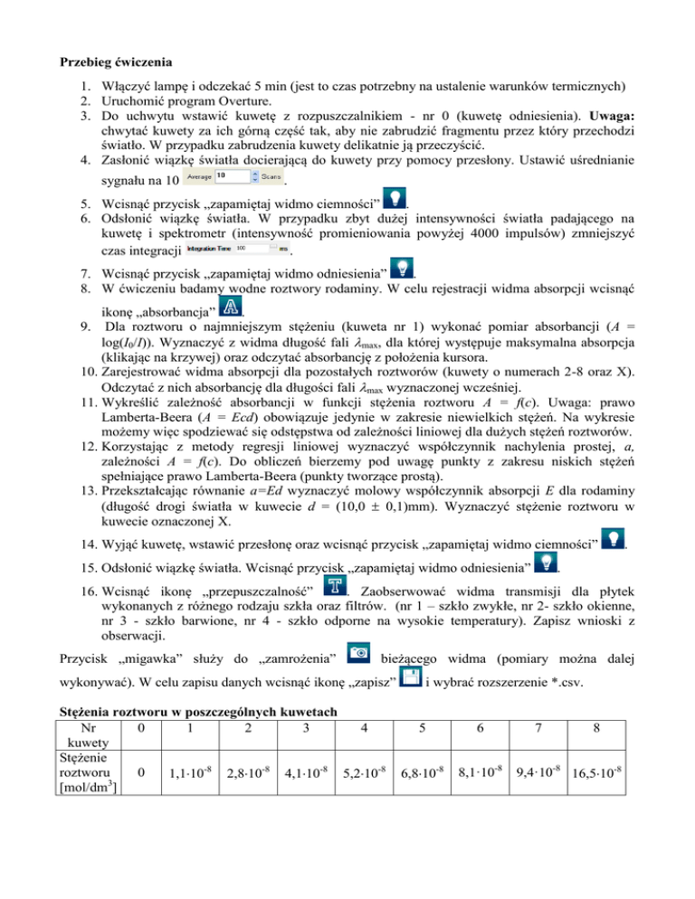 Przebieg ćwiczenia 1. Włączyć lampę i odczekać 5 min (jest to czas potrzebny na ustalenie warunków termicznych) 2. Uruchomić program Overture. 3. Do uchwytu wstawić kuwetę z rozpuszczalnikiem - nr 0 (kuwetę odniesienia). Uwaga: chwytać kuwety za ich górną część tak, aby nie zabrudzić fragmentu przez który przechodzi światło. W przypadku zabrudzenia kuwety delikatnie ją przeczyścić. 4. Zasłonić wiązkę światła docierającą do kuwety przy pomocy przesłony. Ustawić uśrednianie sygnału na 10 . 5. Wcisnąć przycisk „zapamiętaj widmo ciemności” . 6. Odsłonić wiązkę światła. W przypadku zbyt dużej intensywności światła padającego na kuwetę i spektrometr (intensywność promieniowania powyżej 4000 impulsów) zmniejszyć czas integracji . 7. Wcisnąć przycisk „zapamiętaj widmo odniesienia” . 8. W ćwiczeniu badamy wodne roztwory rodaminy. W celu rejestracji widma absorpcji wcisnąć ikonę „absorbancja” . Dla roztworu o najmniejszym stężeniu (kuweta nr 1) wykonać pomiar absorbancji (A = log(I0/I)). Wyznaczyć z widma długość fali max, dla której występuje maksymalna absorpcja (klikając na krzywej) oraz odczytać absorbancję z położenia kursora. 10. Zarejestrować widma absorpcji dla pozostałych roztworów (kuwety o numerach 2-8 oraz X). Odczytać z nich absorbancję dla długości fali max wyznaczonej wcześniej. 11. Wykreślić zależność absorbancji w funkcji stężenia roztworu A = f(c). Uwaga: prawo Lamberta-Beera (A = Ecd) obowiązuje jedynie w zakresie niewielkich stężeń. Na wykresie możemy więc spodziewać się odstępstwa od zależności liniowej dla dużych stężeń roztworów. 12. Korzystając z metody regresji liniowej wyznaczyć współczynnik nachylenia prostej, a, zależności A = f(c). Do obliczeń bierzemy pod uwagę punkty z zakresu niskich stężeń spełniające prawo Lamberta-Beera (punkty tworzące prostą). 13. Przekształcając równanie a=Ed wyznaczyć molowy współczynnik absorpcji E dla rodaminy (długość drogi światła w kuwecie d = (10,0 0,1)mm). Wyznaczyć stężenie roztworu w kuwecie oznaczonej X. 9. 14. Wyjąć kuwetę, wstawić przesłonę oraz wcisnąć przycisk „zapamiętaj widmo ciemności” 15. Odsłonić wiązkę światła. Wcisnąć przycisk „zapamiętaj widmo odniesienia” . . 16. Wcisnąć ikonę „przepuszczalność” . Zaobserwować widma transmisji dla płytek wykonanych z różnego rodzaju szkła oraz filtrów. (nr 1 – szkło zwykłe, nr 2- szkło okienne, nr 3 - szkło barwione, nr 4 - szkło odporne na wysokie temperatury). Zapisz wnioski z obserwacji. Przycisk „migawka” służy do „zamrożenia” bieżącego widma (pomiary można dalej wykonywać). W celu zapisu danych wcisnąć ikonę „zapisz” Stężenia roztworu w poszczególnych kuwetach Nr 0 1 2 3 4 kuwety Stężenie roztworu 0 1,110-8 2,810-8 4,110-8 5,210-8 3 [mol/dm ] i wybrać rozszerzenie *.csv. 5 6 6,810-8 8,1·10-8 7 8 9,4·10-8 16,510-8