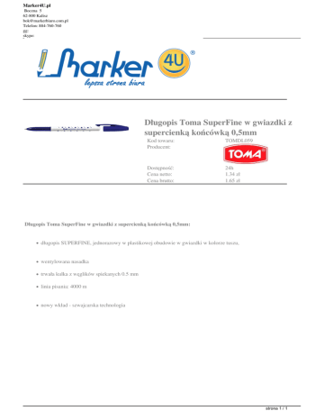 Marker4U.pl Boczna 5 62-800 Kalisz [email protected] Telefon: 884-760-760 gg: skype: Długopis Toma SuperFine w gwiazdki z supercienką końcówką 0,5mm Kod towaru: Producent: TOMDL059 Dostępność: Cena netto: Cena brutto: 24h 1.34 zł 1.65 zł Długopis Toma SuperFine w gwiazdki z supercienką końcówką 0,5mm: długopis SUPERFINE, jednorazowy w plastikowej obudowie w gwiazdki w kolorze tuszu, wentylowana nasadka trwała kulka z węglików spiekanych 0.5 mm linia pisania: 4000 m nowy wkład - szwajcarska technologia strona 1 / 1 Powered by TCPDF (www.tcpdf.org)