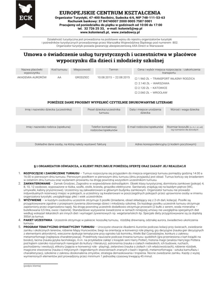 EUROPEJSKIE CENTRUM KSZTAŁCENIA Organizator Turystyki, 47-400 Racibórz, Sudecka 4/6, NIP 748-111-53-63 Rachunek bankowy: 37 84740007 2000 0005 7587 0001 Pracujemy od poniedziałku do piątku w godzinach od 10:00 do 17:00 tel. 32 726 25 33, e-mail: [email protected] www.koloniena5.pl, www.zwiadowcy.pl __________________________________________________________________________________________________________________________ Działalność turystyczna jest prowadzona na podstawie wpisu do rejestru organizatorów turystyki i pośredników turystycznych prowadzonego przez Marszałka Województwa Śląskiego pod numerem 802. Organizator turystyki posiada gwarancję ubezpieczeniową AXA Direct w Warszawie ______________________________________________________________________________________________________________________________________________________________________________________ Umowa o świadczenie usług turystycznych i uczestnictwa w placówce wypoczynku dla dzieci i młodzieży szkolnej Nazwa placówki wypoczynku Kod turnusu Miejscowość Termin Cena i wybór miejsca rozpoczęcia i zakończenia transportu AKADEMIA AURORÓW AA GRODZIEC 10.08.2015 – 22.08.2015 □ 1.960 ZŁ – TRANSPORT WŁASNY RODZICA □ 2.140 ZŁ – WARSZAWA □ 2.120 ZŁ – KATOWICE □ 2.060 ZŁ – WROCŁAW PONIŻSZE DANE PROSIMY WYPEŁNIĆ CZYTELNIE DRUKOWANYMI LITERAMI Imię i nazwisko dziecka (uczestnika) Pesel dziecka/uczestnika turnusu Data i miejsce urodzenia dziecka Wzrost i waga dziecka Imię i nazwisko rodzica (opiekuna) Telefon kontaktowy rodziców/opiekunów E-mail rodziców/opiekunów Rozmiar koszulki (s, m, l, xl, xxl) Dokładne dane osoby, na którą należy wystawić fakturę wg rozmiarów dla dorosłych Adres korespondencyjny (z kodem pocztowym) § 1 ORGANIZATOR OŚWIADCZA, A KLIENT PRZYJMUJE PONIŻSZĄ OFERTĘ ORAZ ZASADY JEJ REALIZACJI 1. ROZPOCZĘCIE I ZAKOŃCZENIE TURNUSU – Turnus rozpoczyna się przyjazdem do miejsca organizacji turnusu pomiędzy godziną 14.00 a 2. 3. 4. 5. 16.00 w pierwszym dniu turnusu. Pierwszym posiłkiem w pierwszym dniu turnusu (dniu przyjazdu) jest obiad. Turnus kończy się śniadaniem w ostatnim dniu turnusu oraz wydaniem prowiantu na drogę powrotną wszystkim uczestnikom turnusu. ZAKWATEROWANIE – Zamek Grodziec, Zagrodno w województwie dolnośląskim. Obiekt klasy turystycznej, dormitoria zamkowe (pokoje) 4, 8, 10, 12 osobowe, wyposażone w łóżka, szafki, stolik, krzesła, gniazdko elektryczne. Sanitariaty znajdują się na każdym piętrze (WC, umywalki, kabiny prysznicowe). Uczestnicy są zakwaterowani w głównym budynku zamkowym. Organizator turnusu nie prowadzi indywidualnych rezerwacji miejsc w pokojach, a uczestnicy są kwaterowani w poszczególnych pokojach przez uprawnione osoby w imieniu organizatora turystyki, uwzględniając płeć i wiek uczestników. WYŻYWIENIE – w każdym osobodniu uczestnik otrzymuje 3 posiłki (śniadanie, obiad składający się z 2-ch dań, kolacja). Posiłki są przygotowywane zgodnie z przepisami żywienia zbiorowego dzieci i młodzieży szkolnej. Do każdego posiłku uczestnik turnusu otrzymuje zapewniony przez organizatora napój. Na drogę powrotną uczestnik dodatkowo otrzymuje prowiant (2 bułki z serem, woda mineralna – butelkowana 0,5 litra, owoc i batonik). Standardowe wyżywienie świadczone w ramach niniejszej umowy nie uwzględnia specjalnych diet według wskazań lekarskich ani innych diet i wymagań żywieniowych np. wegetariańskich itp. Specjale diety przygotowywane są za dopłatą 300zł za turnus. PAKIET UCZESTNIKA - Uczestnik otrzymuje w pakiecie: koszulkę turnusu, różdżkę drewnianą, odznakę aurora, świadectwo ukończenia turnusu. PROGRAM TEMATYCZNO-DYDAKTYCZNY TURNUSU – Uroczyste otwarcie Akademii Aurorów podczas kolacji przy świecach, zwiedzanie zamku i okolicznych terenów, robienie Mapy Huncwotów, biegi na orientację w konwencji role playing, gry decyzyjne (nauka gier decyzyjnych z elementami aktorskimi), wieczorne dyskusje tematyczne przy ognisko lub kominku, Wielki Bal Czarodziejów, konkurs z zakresu metamorfomagii (najlepsza charakteryzacja). Przedmioty nauczane podczas trwania turnusu: quidditch (gra przeniesiona z kart książki na boisko), łacina (nauka języka łacińskiego, m.in. na przykładzie zaklęć z książek serii Harry Potter), historia magii (analiza Harry’ego Pottera pod kątem szeroko rozumianych nawiązań do kultury i literatury), astronomia (nauka o ciałach niebieskich, ich budowie, ruchach, pochodzeniu i ewolucji), eliksiry (zajęcia w konwencji role - playing), zielarstwo (nauka o ziołach i ich właściwościach), robienie różdżek, magiczne stworzenia (nauka o mitycznych i legendarnych stworzeniach znanych z baśń i legend), metamorfomagia - sztuka kamuflażu i charakteryzacji, szkolenie z zakresu doskonalenia zmysłów, strategia demaskowania i tropienia. Nocne zwiedzanie zamku. Każdy z wyżej wymienionych elementów jest prowadzony przez minimum 1 jednostkę czasową trwającą 45 minut. __________________________ (podpis klienta) 6. PRZEDMIOTY NAUCZANE PODCZAS TRWANIA TURNUSU: quidditch (gra w palanta), łacina (nauka języka łacińskiego, m.in. na przykładzie zaklęć z książek serii Harry Potter), historia magii (analiza Harry’ego Pottera pod kątem szeroko rozumianych nawiązań do kultury i literatury), astronomia (nauka o ciałach niebieskich, ich budowie, ruchach, pochodzeniu i ewolucji), eliksiry (zajęcia w konwencji role playing), zielarstwo (nauka o ziołach i ich właściwościach), robienie różdżek, magiczne stworzenia (nauka o mitycznych i legendarnych stworzeniach znanych z baśń i legend), sztuka kamuflażu i charakteryzacji, szkolenie z zakresu doskonalenia zmysłów, strategia demaskowania i tropienia, szkolenie z zakresu odporności na presję z zewnątrz i wytrwałość. Nocne zwiedzanie zamku. Dwie projekcje filmu. Każdy z wyżej wymienionych elementów jest prowadzony przez minimum 1 jednostkę czasową