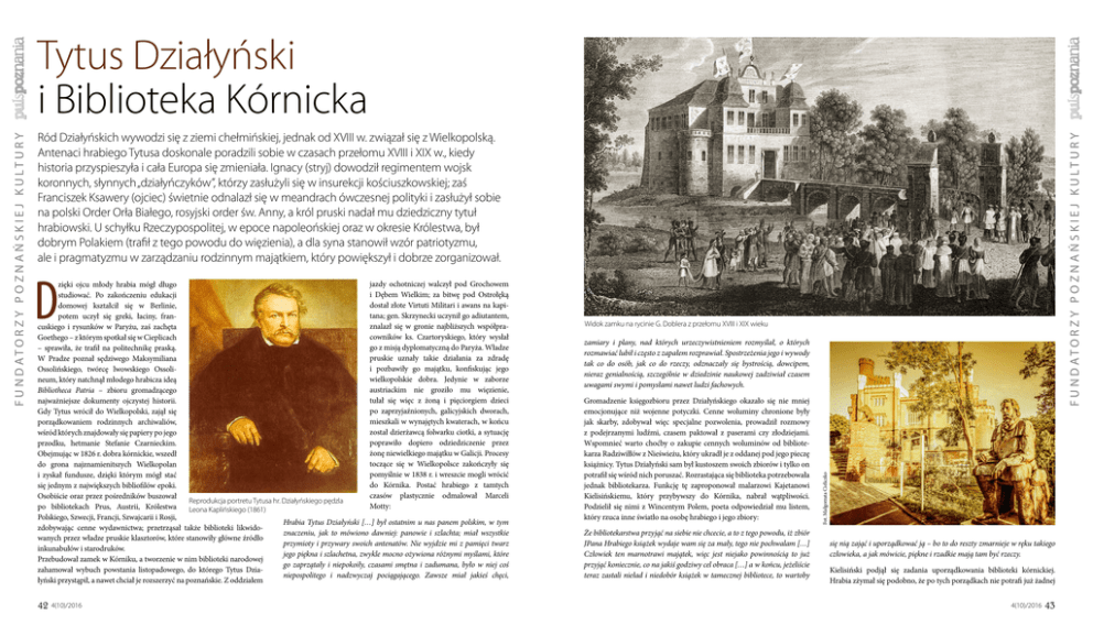 D jazdy ochotniczej walczył pod Grochowem zięki ojcu młody hrabia mógł długo i Dębem Wielkim; za bitwę pod Ostrołęką studiować. Po zakończeniu edukacji dostał złote Virtuti Militari i awans na kapidomowej kształcił się w Berlinie, tana; gen. Skrzynecki uczynił go adiutantem, potem uczył się greki, łaciny, franznalazł się w gronie najbliższych współpracuskiego i rysunków w Paryżu, zaś zachęta cowników ks. Czartoryskiego, który wysłał Goethego – z którym spotkał się w Cieplicach go z misją dyplomatyczną do Paryża. Władze – sprawiła, że trafił na politechnikę praską. pruskie uznały takie działania za zdradę W Pradze poznał sędziwego Maksymiliana i pozbawiły go majątku, konfiskując jego Ossolińskiego, twórcę lwowskiego Ossoliwielkopolskie dobra. Jedynie w zaborze neum, który natchnął młodego hrabicza ideą austriackim nie groziło mu więzienie, Bibliotheca Patria – zbioru gromadzącego tułał się więc z żoną i pięciorgiem dzieci najważniejsze dokumenty ojczystej historii. po zaprzyjaźnionych, galicyjskich dworach, Gdy Tytus wrócił do Wielkopolski, zajął się mieszkali w wynajętych kwaterach, w końcu porządkowaniem rodzinnych archiwaliów, został dzierżawcą folwarku ciotki, a sytuację wśród których znajdowały się papiery po jego poprawiło dopiero odziedziczenie przez przodku, hetmanie Stefanie Czarnieckim. żonę niewielkiego majątku w Galicji. Procesy Obejmując w 1826 r. dobra kórnickie, wszedł toczące się w Wielkopolsce zakończyły się do grona najznamienitszych Wielkopolan pomyślnie w 1838 r. i wreszcie mogli wrócić i zyskał fundusze, dzięki którym mógł stać do Kórnika. Postać hrabiego z tamtych się jednym z największych bibliofilów epoki. czasów plastycznie odmalował Marceli Osobiście oraz przez pośredników buszował Reprodukcja portretu Tytusa hr. Działyńskiego pędzla Motty: po bibliotekach Prus, Austrii, Królestwa Leona Kaplińskiego (1861) Polskiego, Szwecji, Francji, Szwajcarii i Rosji, Hrabia Tytus Działyński […] był ostatnim u nas panem polskim, w tym zdobywając cenne wydawnictwa; przetrząsał także biblioteki likwidoznaczeniu, jak to mówiono dawniej: panowie i szlachta; miał wszystkie wanych przez władze pruskie klasztorów, które stanowiły główne źródło przymioty i przywary swoich antenatów. Nie wyjdzie mi z pamięci twarz inkunabułów i starodruków. jego piękna i szlachetna, zwykle mocno ożywiona różnymi myślami, które Przebudował zamek w Kórniku, a tworzenie w nim biblioteki narodowej go zaprzątały i niepokoiły, czasami smętna i zadumana, było w niej coś zahamował wybuch powstania listopadowego, do którego Tytus Dzianiepospolitego i nadzwyczaj pociągającego. Zawsze miał jakieś chęci, łyński przystąpił, a nawet chciał je rozszerzyć na poznańskie. Z oddziałem 42 4(10)/2016 F undatorzy pozna ń skiej kultury Ród Działyńskich wywodzi się z ziemi chełmińskiej, jednak od XVIII w. związał się z Wielkopolską. Antenaci hrabiego Tytusa doskonale poradzili sobie w czasach przełomu XVIII i XIX w., kiedy historia przyspieszyła i cała Europa się zmieniała. Ignacy (stryj) dowodził regimentem wojsk koronnych, słynnych „działyńczyków”, którzy zasłużyli się w insurekcji kościuszkowskiej; zaś Franciszek Ksawery (ojciec) świetnie odnalazł się w meandrach ówczesnej polityki i zasłużył sobie na polski Order Orła Białego, rosyjski order św. Anny, a król pruski nadał mu dziedziczny tytuł hrabiowski. U schyłku Rzeczypospolitej, w epoce napoleońskiej oraz w okresie Królestwa, był dobrym Polakiem (trafił z tego powodu do więzienia), a dla syna stanowił wzór patriotyzmu, ale i pragmatyzmu w zarządzaniu rodzinnym majątkiem, który powiększył i dobrze zorganizował. Widok zamku na rycinie G. Doblera z przełomu XVIII i XIX wieku zamiary i plany, nad których urzeczywistnieniem rozmyślał, o których rozmawiać lubił i często z zapałem rozprawiał. Spostrzeżenia jego i wywody tak co do osób, jak co do rzeczy, odznaczały się bystrością, dowcipem, nieraz genialnością, szczególnie w dziedzinie naukowej zadziwiał czasem uwagami swymi i pomysłami nawet ludzi fachowych. Gromadzenie księgozbioru przez Działyńskiego okazało się nie mniej emocjonujące niż wojenne potyczki. Cenne woluminy chronione były jak skarby, zdobywał więc specjalne pozwolenia, prowadził rozmowy z podejrzanymi ludźmi, czasem paktował z paserami czy złodziejami. Wspomnieć warto choćby o zakupie cennych woluminów od bibliotekarza Radziwiłłów z Nieświeżu, który ukradł je z oddanej pod jego pieczę książnicy. Tytus Działyński sam był kustoszem swoich zbiorów i tylko on potrafił się wśród nich poruszać. Rozrastająca się biblioteka potrzebowała jednak bibliotekarza. Funkcję tę zaproponował malarzowi Kajetanowi Kielisińskiemu, który przybywszy do Kórnika, nabrał wątpliwości. Podzielił się nimi z Wincentym Polem, poeta odpowiedział mu listem, który rzuca inne światło na osobę hrabiego i jego zbiory: Że bibliotekarstwa przyjąć na siebie nie chcecie, a to z tego powodu, iż zbiór JPana Hrabiego książek wydaje wam się za mały, tego nie pochwalam […] Człowiek ten marnotrawi majątek, więc jest niejako powinnością to już przyjąć koniecznie, co na jakiś godziwy cel obraca […] a w końcu, jeżeliście teraz zastali nieład i niedobór książek w tamecznej bibliotece, to wartoby Fot. Małgorzata Cieliczko F undatorzy pozna ń skiej kultury Tytus Działyński i Biblioteka Kórnicka się nią zająć i uporządkować ją – bo to do reszty zmarnieje w ręku takiego człowieka, a jak mówicie, piękne i rzadkie mają tam być rzeczy. Kielisiński podjął się zadania uporządkowania biblioteki kórnickiej. Hrabia zżymał się podobno, że po tych porządkach nie potrafi już żadnej 4(10)/2016 43 REKLAMA Fot. Waldemar Borowiak Fot. Małgorzata Ciel