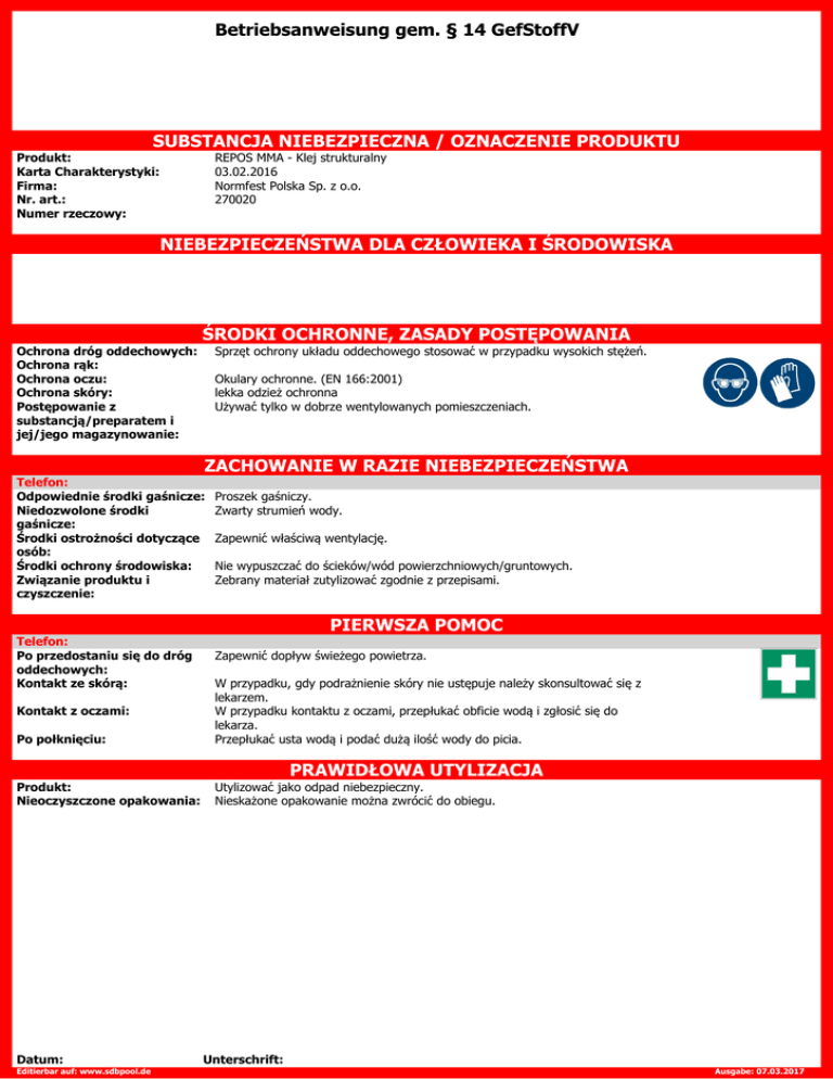 Betriebsanweisung gem. § 14 GefStoffV SUBSTANCJA NIEBEZPIECZNA / OZNACZENIE PRODUKTU Produkt: Karta Charakterystyki: Firma: Nr. art.: Numer rzeczowy: REPOS MMA - Klej strukturalny 03.02.2016 Normfest Polska Sp. z o.o. 270020 NIEBEZPIECZEŃSTWA DLA CZŁOWIEKA I ŚRODOWISKA Ochrona dróg oddechowych: Ochrona rąk: Ochrona oczu: Ochrona skóry: Postępowanie z substancją/preparatem i jej/jego magazynowanie: ŚRODKI OCHRONNE, ZASADY POSTĘPOWANIA Sprzęt ochrony układu oddechowego stosować w przypadku wysokich stężeń. Okulary ochronne. (EN 166:2001) lekka odzież ochronna Używać tylko w dobrze wentylowanych pomieszczeniach. ZACHOWANIE W RAZIE NIEBEZPIECZEŃSTWA Telefon: Odpowiednie środki gaśnicze: Niedozwolone środki gaśnicze: Środki ostrożności dotyczące osób: Środki ochrony środowiska: Związanie produktu i czyszczenie: Telefon: Po przedostaniu się do dróg oddechowych: Kontakt ze skórą: Proszek gaśniczy. Zwarty strumień wody. Zapewnić właściwą wentylację. Nie wypuszczać do ścieków/wód powierzchniowych/gruntowych. Zebrany materiał zutylizować zgodnie z przepisami. PIERWSZA POMOC Zapewnić dopływ świeżego powietrza. Po połknięciu: W przypadku, gdy podrażnienie skóry nie ustępuje należy skonsultować się z lekarzem. W przypadku kontaktu z oczami, przepłukać obficie wodą i zgłosić się do lekarza. Przepłukać usta wodą i podać dużą ilość wody do picia. Produkt: Nieoczyszczone opakowania: Utylizować jako odpad niebezpieczny. Nieskażone opakowanie można zwrócić do obiegu. Kontakt z oczami: Datum: Editierbar auf: www.sdbpool.de PRAWIDŁOWA UTYLIZACJA Unterschrift: Ausgabe: 07.03.2017