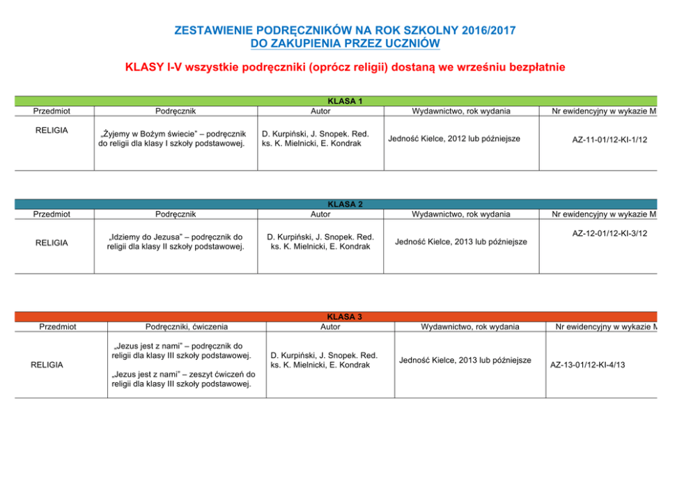 ZESTAWIENIE PODRĘCZNIKÓW NA ROK SZKOLNY 2016/2017 DO ZAKUPIENIA PRZEZ UCZNIÓW KLASY I-V wszystkie podręczniki (oprócz religii) dostaną we wrześniu bezpłatnie Przedmiot RELIGIA Podręcznik „Żyjemy w Bożym świecie” – podręcznik do religii dla klasy I szkoły podstawowej. Przedmiot Podręcznik RELIGIA „Idziemy do Jezusa” – podręcznik do religii dla klasy II szkoły podstawowej. Przedmiot Podręczniki, ćwiczenia „Jezus jest z nami” – podręcznik do religii dla klasy III szkoły podstawowej. RELIGIA „Jezus jest z nami” – zeszyt ćwiczeń do religii dla klasy III szkoły podstawowej. KLASA 1 Autor D. Kurpiński, J. Snopek. Red. ks. K. Mielnicki, E. Kondrak KLASA 2 Autor D. Kurpiński, J. Snopek. Red. ks. K. Mielnicki, E. Kondrak KLASA 3 Autor D. Kurpiński, J. Snopek. Red. ks. K. Mielnicki, E. Kondrak Wydawnictwo, rok wydania Jedność Kielce, 2012 lub późniejsze Wydawnictwo, rok wydania Jedność Kielce, 2013 lub późniejsze Wydawnictwo, rok wydania Jedność Kielce, 2013 lub późniejsze Nr ewidencyjny w wykazie MEN AZ-11-01/12-KI-1/12 Nr ewidencyjny w wykazie MEN AZ-12-01/12-KI-3/12 Nr ewidencyjny w wykazie MEN AZ-13-01/12-KI-4/13 Przedmiot RELIGIA Podręcznik Miejsce pełne BOGActw – podręcznik do religii dla klasy IV szkoły podstawowej. Miejsce pełne BOGActw – zeszyt ćwiczeń do religii dla klasy IV szkoły podstawowej. KLASA 4 Autor Wydawnictwo, rok wydania ks. Krzysztof Mielnicki, Elżbieta Kondrak, Bogusław Nosek Jedność Kielce, 2012 lub późniejsze Nr ewidencyjny w wykazie MEN AZ-21-02/12-KI-1/12 Elżbieta Kondrak, Ewelina Parszewska KLASA 5 Przedmiot RELIGIA Podręcznik „Spotkania u BOGAcające” – podręcznik do religii dla klasy V szkoły podstawowej. Autor Wydawnictwo, rok wydania ks. Krzysztof Mielnicki, Elżbieta Kondrak, Ewelina Parszewska Jedność Kielce, 2013 lub późniejsze „Spotkania u BOGAcające” – zeszyt ćwiczeń do religii dla klasy V szkoły podstawowej. Nr ewidencyjny w wykazie MEN Elżbieta Kondrak, Ewelina Parszewska, Jolanta Konat AZ-22-02/12-KI-1/13 KLASY VI wszystkie podręczniki kupują we własnym zakresie KLASA 6 Przedmiot RELIGIA J. POLSKI Podręcznik „Tajemnice BOGAtego życia” – podręcznik do religii dla klasy VI szkoły podstawowej. Autor ks. Krzysztof Mielnicki, Elżbieta Kondrak, Ewelina Parszewska „Tajemnice BOGAtego życia” – zeszyt ćwiczeń do religii dla klasy VI szkoły podstawowej. Elżbieta Kondrak, Ewelina Parszewska, Agnieszka Sętorek Teraz polski! 6 Język polski Podręcznik do kształcenia literackiego, kulturowego i językowego „Teraz polski!” 6 zeszyt ćwiczeń dla klasy VI A. Klimowicz, A. Marcinkiewicz Wydawnictwo, rok wydania Nr ewidencyjny MEN Jedność Kielce, 2014 lub późniejsze AZ-23-02/12-KI-3/14: Nowa Era 2014 i późniejsze 538/3/2014 J. ANGIELSKI Today 4” podręcznik Erika Stiles, Sandy Zervas, Pearson 2016 669/4/2016 „Today 4” zeszyt ćwiczeń MATEMATYKA „Matematyka z kluczem” podręcznik dla klasy 6 Marcin Braun, Agnieszka Mańkowska, Małgorzata Paszyńska Nowa Era , 2014 lub późniejsze „Matematyka z kluczem” zeszyt ćwiczeń klasa 6 część 1 i 2 157/4/e/2012 PRZYRODA „Tajemnice przyrody” – podręcznik dla klasy 6 szkoły podstawowej Joanna Stawarz, Feliks Szlajfer, Hanna Kowalczyk Nowa Era , 2014 lub późniejsze 399/3/2014 HISTORIA „Wczoraj i dziś” podręcznik do historii i społeczeństwa dla klasy 6 szkoły podstawowej Grzegorz Wojciechowski Nowa Era , 2014 lub późniejsze 443/3/2014 ZAJĘCIA KOMPUTEROWE Lekcje z komputerem” podręcznik do zajęć komputerowych dla szkoły podstawowej, klasa 6 W. Jochemczyk, I. Krajewska – Karnas, W. Karnas, A. Samulska, M. Wyczółkowski WSiP, 2014 lub późniejsze MUZYKA „Muzyczny świat” klasa 6 podręcznik „Muzyczny świat” klasa 6 zeszyt ćwiczeń Teresa Wójcik Mac Edukacja 2014 lub późniejsze 495/3/2014 PLASTYKA Uczniowie nie kupują, będą korzystać z egzemplarzy szkolnych. ---------------------------------------------------- -------------------------------------- --------------------------------------- ZAJĘCIA TECHNICZNE Uczniowie mają podręcznik („Jak to działa” podręcznik dla klas IV-VI). ------------------------------------------------ 453/3/2014