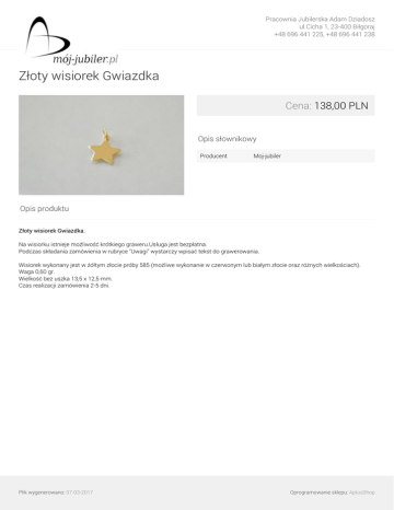 Pracownia Jubilerska Adam Dziadosz ul.Cicha 1, 23-400 Biłgoraj +48 696 441 225, +48 696 441 238 Złoty wisiorek Gwiazdka Cena: 138,00 PLN Opis słownikowy Producent Moj-jubiler Opis produktu Złoty wisiorek Gwiazdka. Na wisiorku istnieje możliwość krótkiego graweru.Usługa jest bezpłatna. Podczas składania zamówienia w rubryce "Uwagi" wystarczy wpisać tekst do grawerowania. Wisiorek wykonany jest w żółtym złocie próby 585 (możliwe wykonanie w czerwonym lub białym złocie oraz różnych wielkościach). Waga 0,60 gr. Wielkość bez uszka 13,5 x 12,5 mm. Czas realizacji zamówienia 2-5 dni. Plik wygenerowano: 07-03-2017 Powered by TCPDF (www.tcpdf.org) Oprogramowanie sklepu: AptusShop