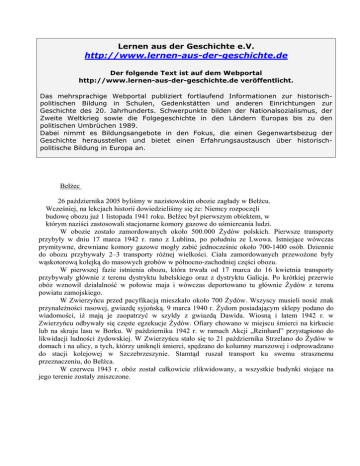 Lernen aus der Geschichte e.V. http://www.lernen-aus-der-geschichte.de Der folgende Text ist auf dem Webportal http://www.lernen-aus-der-geschichte.de veröffentlicht. Das mehrsprachige Webportal publiziert fortlaufend Informationen zur historischpolitischen Bildung in Schulen, Gedenkstätten und anderen Einrichtungen zur Geschichte des 20. Jahrhunderts. Schwerpunkte bilden der Nationalsozialismus, der Zweite Weltkrieg sowie die Folgegeschichte in den Ländern Europas bis zu den politischen Umbrüchen 1989. Dabei nimmt es Bildungsangebote in den Fokus, die einen Gegenwartsbezug der Geschichte herausstellen und bietet einen Erfahrungsaustausch über historischpolitische Bildung in Europa an. Bełżec 26 października 2005 byliśmy w nazistowskim obozie zagłady w Bełżcu. Wcześniej, na lekcjach historii dowiedzieliśmy się że: Niemcy rozpoczęli budowę obozu już 1 listopada 1941 roku. Bełżec był pierwszym obiektem, w którym naziści zastosowali stacjonarne komory gazowe do uśmiercania ludzi. W obozie zostało zamordowanych około 500.000 Żydów polskich. Pierwsze transporty przybyły w dniu 17 marca 1942 r. rano z Lublina, po południu ze Lwowa. Istniejące wówczas prymitywne, drewniane komory gazowe mogły zabić jednocześnie około 700-1400 osób. Dziennie do obozu przybywały 2–3 transporty różnej wielkości. Ciała zamordowanych przewożone były wąskotorową kolejką do masowych grobów w północno-zachodniej części obozu. W pierwszej fazie istnienia obozu, która trwała od 17 marca do 16 kwietnia transporty przybywały głównie z terenu dystryktu lubelskiego oraz z dystryktu Galicja. Po krótkiej przerwie obóz wznowił działalność w połowie maja i wówczas deportowano tu głównie Żydów z terenu powiatu zamojskiego. W Zwierzyńcu przed pacyfikacją mieszkało około 700 Żydów. Wszyscy musieli nosić znak przynależności rasowej, gwiazdę syjońską. 9 marca 1940 r. Żydom posiadającym sklepy podano do wiadomości, iż mają je zaopatrzyć w szyldy z gwiazdą Dawida. Wiosną i latem 1942 r. w Zwierzyńcu odbywały się częste egzekucje Żydów. Ofiary chowano w miejscu śmierci na kirkucie lub na skraju lasu w Borku. W październiku 1942 r. w ramach Akcji „Reinhard” przystąpiono do likwidacji ludności żydowskiej. W Zwierzyńcu stało się to 21 października Strzelano do Żydów w domach i na ulicy, a tych, którzy uniknęli śmierci, spędzano do kolumny marszowej i odprowadzano do stacji kolejowej w Szczebrzeszynie. Stamtąd ruszał transport ku swemu strasznemu przeznaczeniu, do Bełżca. W czerwcu 1943 r. obóz został całkowicie zlikwidowany, a wszystkie budynki stojące na jego terenie zostały zniszczone.