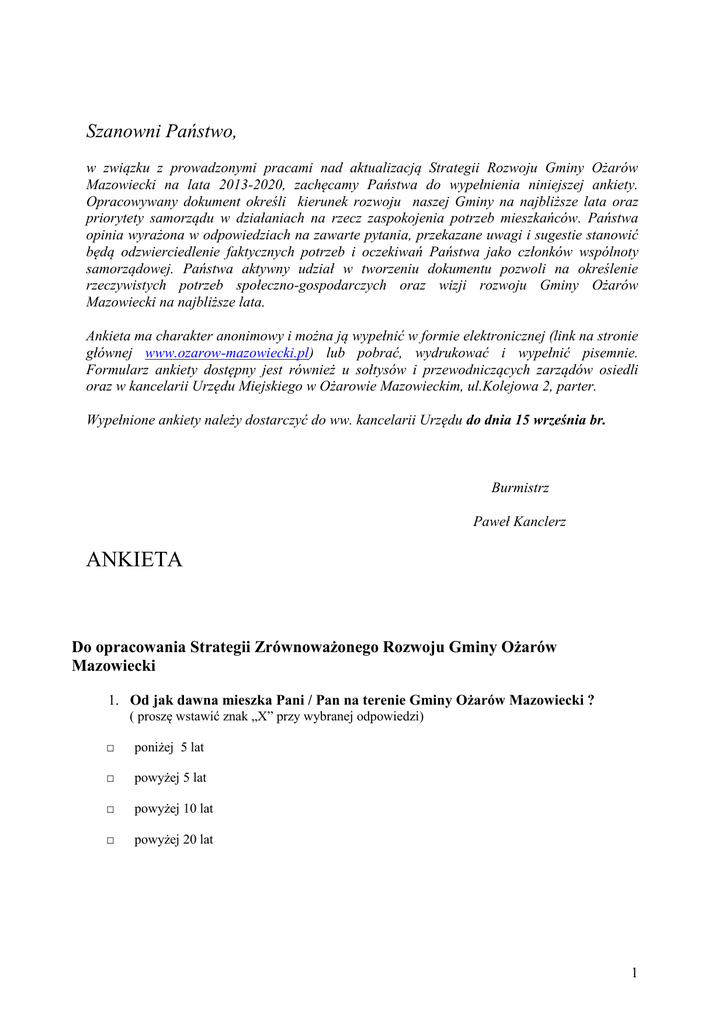 Szanowni Państwo, w związku z prowadzonymi pracami nad aktualizacją Strategii Rozwoju Gminy Ożarów Mazowiecki na lata 2013-2020, zachęcamy Państwa do wypełnienia niniejszej ankiety. Opracowywany dokument określi kierunek rozwoju naszej Gminy na najbliższe lata oraz priorytety samorządu w działaniach na rzecz zaspokojenia potrzeb mieszkańców. Państwa opinia wyrażona w odpowiedziach na zawarte pytania, przekazane uwagi i sugestie stanowić będą odzwierciedlenie faktycznych potrzeb i oczekiwań Państwa jako członków wspólnoty samorządowej. Państwa aktywny udział w tworzeniu dokumentu pozwoli na określenie rzeczywistych potrzeb społeczno-gospodarczych oraz wizji rozwoju Gminy Ożarów Mazowiecki na najbliższe lata. Ankieta ma charakter anonimowy i można ją wypełnić w formie elektronicznej (link na stronie głównej www.ozarow-mazowiecki.pl) lub pobrać, wydrukować i wypełnić pisemnie. Formularz ankiety dostępny jest również u sołtysów i przewodniczących zarządów osiedli oraz w kancelarii Urzędu Miejskiego w Ożarowie Mazowieckim, ul.Kolejowa 2, parter. Wypełnione ankiety należy dostarczyć do ww. kancelarii Urzędu do dnia 15 września br. Burmistrz Paweł Kanclerz ANKIETA Do opracowania Strategii Zrównoważonego Rozwoju Gminy Ożarów Mazowiecki 1. Od jak dawna mieszka Pani / Pan na terenie Gminy Ożarów Mazowiecki ? ( proszę wstawić znak „X” przy wybranej odpowiedzi) □ poniżej 5 lat □ powyżej 5 lat □ powyżej 10 lat □ powyżej 20 lat 1 2.Jak Pani / Pan ocenia warunki życia w Gminie Ożarów Mazowiecki ? ( proszę wstawić znak „X” przy wybranej odpowiedzi) Pytanie / ocena bardzo dobrze średnio dobrze słabo źle lokalny rynek pracy (możliwość znalezienia pracy na terenie gminy) warunki do zamieszkania bezpieczeństwo publiczne zabezpieczenie opieki nad dziećmi do lat 3 dostępność placówek przedszkolnych dostępność placówek szkolnych dostępność punktów usługowo- handlowych stan nawierzchni dróg sieć oświetlenia ulicznego sieć wodociągowa sieć kanalizacyjna sieć gazociągowa transport publiczny układ komunikacyjny (dróg) opieka zdrowotna opieka społeczna oferta kulturalna oferta sportowo -rekreacyjna stan środowiska naturalnego czystość i porządek na terenie Gminy organizacja przestrzeni publicznej ( parki , place zabaw ) więzi społeczne i aktywność mieszkańców dostęp do internetu jakość obsługi mieszkańców przez gminne jednostki organizacyjne 2 3. Jak często spotyka się Pani/Pan z niżej określonymi problemami społeczno – gospodarczymi występującymi na terenie Gminy Ożarów Mazowiecki? ( proszę wstawić znak „X” przy wybranej odpowiedzi) Pytanie/ ocena wcale rzadko przeciętnie często bezrobocie ubóstwo przemoc bezdomność przestępczość uzależnienia trudności w dostępie do usług medycznych niskie poczucie bezpieczeństwa publicznego niedostateczna oferta oświatowa , kulturalna i sportowa zły stan infrastruktury drogowej niewystarczająca baza wypoczynkoworekreacyjna niewystarczająca infrastruktura wodnokanalizacyjna słaba integracja społeczności lokalnej mała świadomość ekologiczna mieszkańców nieatrakcyjna oferta dla młodzieży inne...................... 4.Czy zgadza się Pani / Pan z poniższymi stwierdzeniami dotyczącymi atrakcyjności Gminy Ożarów Mazowiecki? ( proszę wstawić znak „X” przy wybranej odpowiedzi) Stwierdzenie / odpowiedź TAK NIE położona w atrakcyjnym miejscu przyjazna mieszkańcom 3 atrakcyjna dla inwestorów zaspokaja potrzeby mieszkańców posiada dobrą kondycje finansową jest dobrze zarządzana posiada bogatą ofertę kulturalną posiada dobrą bazę rekreacyjno- sportową rozwija placówki oświatowe stwarza mieszkańcom dobre warunki życia posiada walory przyrodnicze 5.Proszę ocenić w skali od 1 do 5 (1- nieistotne; 5- bardzo ważne), które z poniższych obszarów powinny stanowić priorytet dla władz Gminy Ożarów Mazowiecki w perspektywie najbliższych lat ? (proszę wstawić znak „X” przy wybranej odpowiedzi) Pytanie/ ocena 1 2 3 4 5 ochrona zdrowia problemy społeczne (uzależnienia , bieda, przemoc) warunki do rozwoju małej i średniej przedsiębiorczości transport publiczny infrastruktura drogowa infrastruktura wodno- kanalizacyjna oferta edukacyjna , kulturalna i sportowa warunki do rozwoju mieszkalnictwa walory przyrodnicze i estetyczne dostępność usług i handlu bezpieczeństwo publiczne ład przestrzenny rozwój rolnictwa i przetwórstwa budowa obiektów sportowo- rekreacyjnych melioracja i zbiorniki retencyjne inne......................................... 4 6. Z jakiego źródła najczęściej czerpie Pani/ Pan informacje o działaniach podejmowanych przez władze Gminy Ożarów Mazowiecki i wydarzeniach lokalnych? ( proszę wstawić znak „X” przy dowolnej ilości odpowiedzi) □ z gminnej strony internetowej □ z gminnego informatora □ z innych stron internetowych □ z prasy lokalnej □ od znajomych, sąsiadów □ z tablic ogłoszeń □ z plakatów i ulotek □ od pracowników Urzędu Miejskiego i innych Instytucji □ z zebrań społeczności lokalnych □ podczas imprez kulturalnych i sportowo - rekreacyjnych METRYCZKA 1. Płeć: 2. Wiek 18253. Wykształcenie 4. Aktywność zawodowa Własna Praca działalność u gospodarcza pracodawcy 35- Rolnictwo 45- 55- Uczę się /studiuję Rencista /Emeryt 5. Związek z terenem Gminy Ożarów Mazowiecki miejsce miejsce prowadzenia miejsce pracy klient zamieszkania działalności gospodarczej Bezrobotny Inne(jakie?) Dziękujemy za wypełnienie ankiety 5