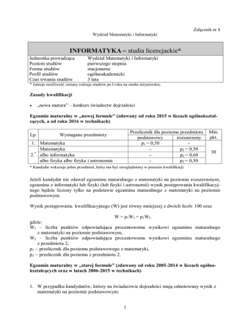 Załącznik nr 8 Wydział Matematyki i Informatyki INFORMATYKA studia licencjackie* Jednostka prowadząca Poziom studiów Forma studiów Profil studiów Czas trwania studiów Wydział Matematyki i Informatyki pierwszego stopnia stacjonarne ogólnoakademicki 3 lata * Istnieje możliwość zmiany rodzaju studiów po I roku na studia inżynierskie. Zasady kwalifikacji „nowa matura” – konkurs świadectw dojrzałości Egzamin maturalny w „nowej formule” (zdawany od roku 2015 w liceach ogólnokształcących, a od roku 2016 w technikach) Lp. Przelicznik dla poziomu przedmiotu podstawowy rozszerzony p1 = 0,50 p = 0,50 2 p2 = 0,60 p2 = 0,50 Wymagane przedmioty 1. Matematyka Matematyka * 2. albo informatyka albo fizyka albo fizyka i astronomia Min. pkt. 30 * Kandydat wskazuje jeden przedmiot, który ma być uwzględniony w procesie kwalifikacji. Jeżeli kandydat nie zdawał egzaminu maturalnego z matematyki na poziomie rozszerzonym, egzaminu z informatyki lub fizyki (lub fizyki i astronomii) wynik postępowania kwalifikacyjnego będzie liczony tylko na podstawie egzaminu maturalnego z matematyki na poziomie podstawowym. Wynik postępowania kwalifikacyjnego (W) jest równy mniejszej z dwóch liczb: 100 oraz W = p1W1 + p2 W2 gdzie: W1 – liczba punktów odpowiadająca procentowemu wynikowi egzaminu maturalnego z matematyki na poziomie podstawowym, W2 – liczba punktów odpowiadająca procentowemu wynikowi egzaminu maturalnego z przedmiotu 2, p1 przelicznik dla poziomu podstawowego z matematyki, p2 przelicznik dla poziomu z przedmiotu 2. Egzamin maturalny w „starej formule” (zdawany od roku 2005-2014 w liceach ogólnokształcących oraz w latach 2006-2015 w technikach) 1. W przypadku kandydatów, którzy na świadectwie dojrzałości mają odnotowany wynik z matematyki na poziomie podstawowym: 1 Załącznik nr 8 Wydział Matematyki i Informatyki Lp. Przelicznik dla poziomu przedmiotu podstawowy rozszerzony p1 = 0,50 p2 = 0,50 p2 = 0,30 p2 = 0,60 p2= 0,30 p2 = 0,50 Wymagane przedmioty 1. Matematyka Matematyka * 2. albo informatyka albo fizyka albo fizyka i astronomia Min. pkt. 30 * Kandydat wskazuje jeden przedmiot, który ma być uwzględniony w procesie kwalifikacji. Jeżeli kandydat nie zdawał egzaminu maturalnego z matematyki na poziomie rozszerzonym, egzaminu z informatyki lub fizyki (lub fizyki i astronomii) wynik postępowania kwalifikacyjnego będzie liczony tylko na podstawie egzaminu maturalnego z matematyki na poziomie podstawowym. Wynik postępowania kwalifikacyjnego (W) jest równy mniejszej z dwóch liczb: 100 oraz W = p1W1 + p2 W2 gdzie: W1 – liczba punktów odpowiadająca procentowemu wynikowi egzaminu maturalnego z matematyki na poziomie podstawowym, W2 – liczba punktów odpowiadająca procentowemu wynikowi egzaminu maturalnego z przedmiotu 2, p1 przelicznik dla poziomu podstawowego z matematyki, p2 przelicznik dla poziomu z przedmiotu 2. Jeżeli kandydat na świadectwie dojrzałości ma odnotowany wynik z przedmiotów informatyka lub fizyka i astronomia zarówno na poziomie rozszerzonym jak i podstawowym, to w postępowaniu kwalifikacyjnym uwzględniany jest wynik z poziomu, który po przemnożeniu przez odpowiedni przelicznik daje wyższą wartość. 2. W przypadku kandydatów, którzy na świadectwie dojrzałości nie mają odnotowanego wyniku z matematyki na poziomie podstawowym: Lp. Wymagane przedmioty 1.* Matematyka albo informatyka albo fizyka i astronomia Przelicznik dla poziomu przedmiotu podstawowy rozszerzony p = 1,00 p = 0,60 p = 1,00 Min. pkt. 30 * Kandydat wskazuje jeden przedmiot, który ma być uwzględniony w procesie kwalifikacji. Wynik postępowania kwalifikacyjnego (W) obliczany jest zgodnie ze wzorem: W = pWm gdzie: Wm liczba punktów odpowiadająca procentowemu wynikowi egzaminu maturalnego ze wskazanego przedmiotu, p przelicznik dla poziomu ze wskazanego przedmiotu. 2 Załącznik nr 8 Wydział Matematyki i Informatyki Jeżeli kandydat na świadectwie dojrzałości ma odnotowany wynik z przedmiotów informatyka lub fizyka i astronomia zarówno na poziomie rozszerzonym jak i podstawowym, to w postępowaniu kwalifikacyjnym uwzględniany jest wynik z poziomu, który po przemnożeniu przez odpowiedni przelicznik daje wyższą wartość. „stara matura” konkurs świadectw dojrzałości Egzamin dojrzałości (stara matura) (zdawany do roku 2004 w liceach ogólnokształcących oraz do roku 2005 w technikach) Lp. Wymagane przedmioty * 1. Matematyka 2.* Język polski Dowolny przedmiot (inny niż matematyka i ję3.* zyk polski) Przelicznik p1 = 0,50 p2 = 0,20 p3 = 0,30 *W przypadku dwóch różnych ocen na egzaminie dojrzałości (z egzaminu pisemnego i ustnego) kandydat wskazuje ocenę wyższą. Warunkiem ubiegania się o przyjęcie na studia jest odnotowany na świadectwie dojrzałości pozytywny wynik z matematyki. Wynik postępowania kwalifikacyjnego (W) obliczany jest zgodnie ze wzorem: W = p1W1 + p2W2 + p3W3 gdzie: W1 – liczba punktów odpowiadająca ocenie z matematyki, W2 – liczba punktów odpowiadająca ocenie z języka polskiego, W3 – liczba punktów odpowiadająca ocenie z przedmiotu 3, p1 przelicznik dla matematyki, p2 przelicznik dla języka polskiego, p3 przelicznik dla dowolnego przedmiotu 3. Oceny z egzaminu dojrzałości przelicza się na punkty zgodnie z tabelą: Ocena (skala 1-6) Punkty za ocenę Ocena (skala 2-5) Punkty za ocenę dopuszczająca (2) dostateczna (3) dobra (4) bardzo dobra (5) celująca (6) 30 50 70 90 100 dostateczna (3) dobra (4) bardzo dobra (5) 40 75 100 „matura zagraniczna” konkurs świadectw dojrzałości Pod uwagę brane są wszystkie przedmioty, przy czym musi być odnotowany wynik z przedmiotu obejmującego treści kształcenia dla przedmiotu matematyka. Wyniki przeliczanie są na punkty w skali od 0 do 100. Kandydaci zobowiązani są dostarczyć świadectwo dojrzałości do Uczelnianej Komisji Rekrutacyjnej nie później niż do ostatniego dnia rejestracji. 3 Załącznik nr 8 Wydział Matematyki 