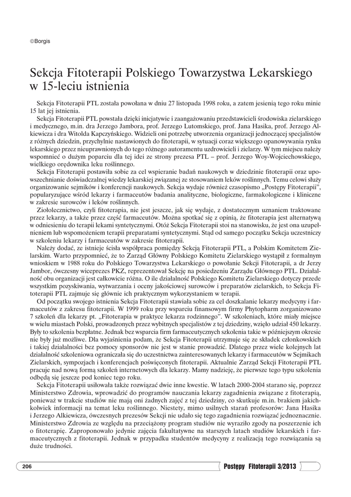 Borgis Sekcja Fitoterapii Polskiego Towarzystwa Lekarskiego w 15-leciu istnienia Sekcja Fitoterapii PTL została powołana w dniu 27 listopada 1998 roku, a zatem jesienią tego roku minie 15 lat jej istnienia. Sekcja Fitoterapii PTL powstała dzięki inicjatywie i zaangażowaniu przedstawicieli środowiska zielarskiego i medycznego, m.in. dra Jerzego Jambora, prof. Jerzego Lutomskiego, prof. Jana Hasika, prof. Jerzego Alkiewicza i dra Witolda Kapczyńskiego. Widzieli oni potrzebę utworzenia organizacji jednoczącej specjalistów z różnych dziedzin, przychylnie nastawionych do fitoterapii, w sytuacji coraz większego opanowywania rynku lekarskiego przez nieuprawnionych do tego różnego autoramentu uzdrowicieli i zielarzy. W tym miejscu należy wspomnieć o dużym poparciu dla tej idei ze strony prezesa PTL – prof. Jerzego Woy-Wojciechowskiego, wielkiego orędownika leku roślinnego. Sekcja Fitoterapii postawiła sobie za cel wspieranie badań naukowych w dziedzinie fitoterapii oraz upowszechnianie doświadczalnej wiedzy lekarskiej związanej ze stosowaniem leków roślinnych. Temu celowi służy organizowanie sejmików i konferencji naukowych. Sekcja wydaje również czasopismo „Postępy Fitoterapii”, popularyzujące wśród lekarzy i farmaceutów badania analityczne, biologiczne, farmakologiczne i kliniczne w zakresie surowców i leków roślinnych. Ziołolecznictwo, czyli fitoterapia, nie jest jeszcze, jak się wydaje, z dostatecznym uznaniem traktowane przez lekarzy, a także przez część farmaceutów. Można spotkać się z opinią, że fitoterapia jest alternatywą w odniesieniu do terapii lekami syntetycznymi. Otóż Sekcja Fitoterapii stoi na stanowisku, że jest ona uzupełnieniem lub wspomożeniem terapii preparatami syntetycznymi. Stąd od samego początku Sekcja uczestniczy w szkoleniu lekarzy i farmaceutów w zakresie fitoterapii. Należy dodać, ze istnieje ścisła współpraca pomiędzy Sekcją Fitoterapii PTL, a Polskim Komitetem Zielarskim. Warto przypomnieć, że to Zarząd Główny Polskiego Komitetu Zielarskiego wystąpił z formalnym wnioskiem w 1988 roku do Polskiego Towarzystwa Lekarskiego o powołanie Sekcji Fitoterapii, a dr Jerzy Jambor, ówczesny wiceprezes PKZ, reprezentował Sekcję na posiedzeniu Zarządu Głównego PTL. Działalność obu organizacji jest całkowicie różna. O ile działalność Polskiego Komitetu Zielarskiego dotyczy przede wszystkim pozyskiwania, wytwarzania i oceny jakościowej surowców i preparatów zielarskich, to Sekcja Fitoterapii PTL zajmuje się głównie ich praktycznym wykorzystaniem w terapii. Od początku swojego istnienia Sekcja Fitoterapii stawiała sobie za cel doszkalanie lekarzy medycyny i farmaceutów z zakresu fitoterapii. W 1999 roku przy wsparciu finansowym firmy Phytopharm zorganizowano 7 szkoleń dla lekarzy pt. „Fitoterapia w praktyce lekarza rodzinnego”. W szkoleniach, które miały miejsce w wielu miastach Polski, prowadzonych przez wybitnych specjalistów z tej dziedziny, wzięło udział 450 lekarzy. Były to szkolenia bezpłatne. Jednak bez wsparcia firm farmaceutycznych szkolenia takie w późniejszym okresie nie były już możliwe. Dla wyjaśnienia podam, że Sekcja Fitoterapii utrzymuje się ze składek członkowskich i takiej działalności bez pomocy sponsorów nie jest w stanie prowadzić. Dlatego przez wiele kolejnych lat działalność szkoleniowa ograniczała się do uczestnictwa zainteresowanych lekarzy i farmaceutów w Sejmikach Zielarskich, sympozjach i konferencjach poświęconych fitoterapii. Aktualnie Zarząd Sekcji Fitoterapii PTL pracuje nad nową formą szkoleń internetowych dla lekarzy. Mamy nadzieję, że pierwsze tego typu szkolenia odbędą się jeszcze pod koniec tego roku. Sekcja Fitoterapii usiłowała także rozwiązać dwie inne kwestie. W latach 2000-2004 starano się, poprzez Ministerstwo Zdrowia, wprowadzić do programów nauczania lekarzy zagadnienia związane z fitoterapią, ponieważ w trakcie studiów nie mają oni żadnych zajęć z tej dziedziny, co skutkuje m.in. brakiem jakichkolwiek informacji na temat leku roślinnego. Niestety, mimo usilnych starań profesorów: Jana Hasika i Jerzego Alkiewicza, ówczesnych prezesów Sekcji nie udało się tego zagadnienia rozwiązać jednoznacznie. Ministerstwo Zdrowia ze względu na przeciążony program studiów nie wyraziło zgody na poszerzenie ich o fitoterapię. Zaproponowało jedynie zajęcia fakultatywne na starszych latach studiów lekarskich i farmaceutycznych z fitoterapii. Jednak w przypadku studentów medycyny z realizacją tego rozwiązania są duże trudności. 206 Postępy Fitoterapii 3/2013 Sekcja Fitoterapii Polskiego Towarzystwa Lekarskiego w 15-leciu istnienia Jeszcze inna kwestia dotyczyła podyplomowego szkolenia lekarzy rodzinnych z zakresu fitoterapii, w celu ubiegania się o tzw. certyfikaty umiejętności w tej dziedzinie. Początkowo Ministerstwo Zdrowia przychylnie zapatrywało się na takie rozwiązanie, jednak w efekcie umiejętność lekarza fitoterapeuty nie została przez Ministerstwo Zdrowia zaakceptowana. W ostatnim okresie Sekcja Fitoterapii rozpisała Konkurs pt. „Racjonalna fitoterapia i suplementacja diety” objęty patronatem honorowym Prezesa PTL – prof. Jerzego Woy-Wojciechowskiego. Celem Konkursu było promowanie najlepszych na polskim rynku leczniczych produktów roślinnych oraz suplementów diety. Informacje o Konkursie zostały podane na Sejmiku Zielarskim w maju 2012 r. w Żerkowie, ukazały się w czasopismie „Postępy Fitoterapii” i zostały zamieszczone na stronie internetowej Sekcji. Ponadto w październiku 2012 roku do blisko 50 firm zajmujących się produkcją leków i suplementów roślinnych wysłano materiały informujące o warunkach uczestnictwa w Konkursie. Początkowo planowano przyjmowanie zgłoszeń konkursowych do końca 2012 roku, a następnie przedłużono termin do końca lutego 2013 roku. Niestety, ze względu na małą liczbę zgłoszeń Ko