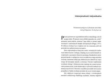 Rozdział 2 Intencjonalność indywidualna Zrozumienie polega na wyobrażeniu sobie faktu. Ludwig Wittgenstein, The Big Typescńp 1 P rocesy poznawcze są produktem doboru naturalnego, ale nie sąjego celem. W gruncie rzeczy dobór naturalny nie „widzi” poznania; może jedynie „dostrzec” jego efekty w postaci zapla nowanych i sterowanych działań zewnętrznych (Piaget, 1971). W obliczu ewolucji bycie mądrym nie ma znaczenia, jeśli nie prowadzi do zachowywania się mądrze. Dwie najważniejsze klasyczne teorie zwierzęcych zacho wań, behawioryzm i etologia, skupiają się na zachowaniach ze wnętrznych, a poznanie właściwie pomijają. Standardowa etolo gia poświęcała w najlepszym razie szczątkową uwagę umysłom zwierząt, natomiast tradycyjny behawioryzm odnosił się wręcz wrogo do koncepcji umysłu u zwierząt. Chociaż współczesne wcielenia etologii i behawioryzmu zajmują się czasem proce sami poznawczymi, to nie dostarczają w tej kwestii żadnych sys tematycznych teorii. Również wszystkie pozostałe nowoczesne perspektywy badań ewolucji poznania nie są tu wystarczające. Aby należycie rozpocząć naszą relację z ewolucyjnych narodzin unikatowego ludzkiego myślenia, musimy najpierw 24 Historia naturalna ludzkiego myślenia 2. Intencjonainość indywidualna 25 sformułować, w dużym skrócie, ogólną teorię ewolucj i pozna tury ciała u ssaków. Specjalizacje te są bardziej rozwinięte niż nia. Dopiero potem, używając takiej ramy teoretycznej do scha rakteryzowania procesów poznania i myślenia u żyjących obec nieumyślne odruchy, gdyż umożliwiają odpowiednie działania nie człowiekowatych - jako przedstawicieli punktu wyjścia dość złożone, jak na przykład zdolność tkania pajęczyn. Niemoż ewolucji człowieka zachodzącej od rozgałęzienia linii naczel liwe jest, by pająk utkał swoją sieć, posługując się tylko połą nych około sześciu milionów lat temu - będziemy mogli zacząć czeniami typu bodziec-reakcja. Proces ten jest zbyt dynamiczny naszą wyprawę w przeszłość. i zależny od konkretnego kontekstu. Pająk musi raczej „znać” w znacznie bardziej zróżnicowanych okolicznościach i mogą być stan docelowy, do którego powinien dążyć oraz mieć zdolności percepcyjne i behawioralne, które pozwolą mu go osiągnąć po Ewolucja poznania przez samoregulację. Te specjalizacje adaptacyjne nie mająjednak charakteru poznawczego (bądź jest on szczątkowy), jako U każdego organizmu występują pewne odruchy zorganizo wane w liniowe połączenia typu bodziec-reakcja. Behawioryści uważają, że całe zachowanie składa się z takich połączeń, przy czym u bardziej złożonych gatunków mogą być one nabywane i wiązane między sobą na różne sposoby. Stanowisko odmienne od behawioryzmu przyjmuje, że złożone organizmy posiadają również „obwodowe” specjalizacje adaptacyjne, działające jako systemy kontroli informacji zwrotnej, z wbudowanymi stanami docelowymi i wariantami działania. Przy takim założeniu, po że są z natury nieświadome i nieelastyczne: postrzegane sytu acje, warianty zachowania i wyznaczane cele są zwykle połą czone w sposób nieelastyczny. Posługujące się nimi, zwierzęta nie rozumieją przyczynowych i intencjonalnych aspektów sytu acji w sposób, który umożliwiłby im elastyczne reagowanie na „nieznane” okoliczności. Dobór naturalny ukształtował te narzę dzia tak, aby działały jednorodnie w sytuacjach „takich samych” jak te, które wystąpiły już wcześniej; inteligencja osobnicza nie jest tu zatem wymagana. znanie ewoluuje nie poprzez coraz bardziej złożone połączenia O poznaniu i myśleniu możemy zacząć mówić w przypadku bodziec-reakcja, ale raczej gdy poszczególne osobniki zyskują zwierząt żyjących w mniej przewidywalnych warunkach - do (1) możliwości elastycznego podejmowania decyzji i kontroli behawioralnej w postaci różnych specjalizacji adaptacyjnych bór naturalny kształtuje procesy podejmowania decyzji, które dają poszczególnym osobnikom możliwość rozpoznawania oraz (2) zdolności tworzenia reprezentacji poznawczych i infe- nowych sytuacji i elastycznego działania na własny rachunek rencji na podstawie przyczynowych i intencjonalnych relacji po w obliczu nagłej konieczności. Tym, co umożliwia skuteczne między istotnymi zdarzeniami. Specjalizacje adaptacyjne powstająjako samoregulujące się systemy, podobne do licznych procesów fizjologicznych, takich jak homeostatyczna regulacja ilości cukru we krwi i tempera radzenie sobie z nowymi warunkami jest pewien stopień zrozu mienia występujących relacji przyczynowych i/lub intencjonal nych, który w efekcie sugeruje odpowiednią, potencjalnie no watorską, odpowiedź behawioralną. Dla przykładu, szympans 26 Historia naturalna ludzkiego myślenia 27 2. Intencjonalność indywidualna może zauważyć, że jedyne narzędzie dostępne mu w pewnej sy symulacji i wnioskowania z przyczynowych, intencjonalnych tuacji wymaga, ze względu na pewne zależności fizyczne, wy i/lub logicznych przekształceń uzyskanych reprezentacji oraz konania czynności, których nigdy w danym celu nie wykony (3) zdolność samokontroli i oceniania, jakie efekty behawioralne wał. Zwierzę dysponujące umiejętnościami poznania działa wynikają z prowadzonych symulacji - a więc do podejmowania zatem jak system kontrolny z ustalonymi wartościami czy ce przemyślanych decyzji o zachowaniu. Sukces lub porażka po lami referencyjnymi, zdolnościami dostrzegania sytuacji przy szczególnych decyzji behawioralnych wrzuca stojące za nimi czynowo lub intencjonalnie „istotnych” dla tych wartości lub procesy reprezentacji, symulacji i samokontroli, rzecz jasna po celów oraz zdolnością wybierania tych działań, które prowadzą średnio, w bezlitosne sito doboru naturalnego. do spełnienia tychże (z uwagi na przyczynową i/lub intencjo nalną strukturę sytuacji). Opis w kat