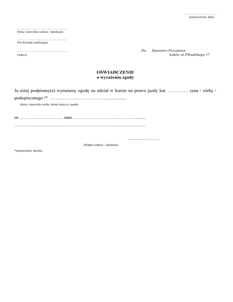 ………………………… (miejscowość, data) ………………………………………… (Imię i nazwisko rodzica / opiekuna) ………………………………………… (Nr dowodu osobistego) Do …………………………………………. (Adres) Starostwo Powiatowe Łuków ul.Piłsudskiego 17 OŚWIADCZENIE o wyrażeniu zgody Ja niżej podpisany(a) wyrażamy zgodę na udział w kursie na prawo jazdy kat. …………. syna / córkę / podopiecznego /* ………………………………................. (Imię i nazwisko osoby, której dotyczy zgoda) ur. ……………………… zam. …………………………………......... ………………………………………………………………………… .…...…...……… (Podpis rodzica / opiekuna) *niepotrzebne skreślić