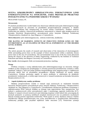 Trendy ve vzdělávání 2014 Technika a didaktika technických předmětů OCENA SZKODLIWOŚCI ODDZIAŁYWANIA INDUKCYJNEGO LINII ENERGETYCZNYCH NA OTOCZENIE, JAKO PRZYKŁAD PRAKTYKI DYDAKTYCZNEJ NA POZIOMIE SZKOŁY WYŻSZEJ PRAUZNER Tomasz, PL Streszczenie W artykule przedstawiono wyniki badań oraz obserwacji oddziaływania pola elektromagnetycznego linii energetycznych na otoczenie na przykładzie przeprowadzonych pomiarów w obrębie przypadkowo obranej linii energetycznej na terenie miasta Częstochowy. Problem ochrony środowiska jest jednym z kluczowych problemów omawianych w ramach zajęć dydaktycznych na kierunku Inżynieria Bezpieczeństwa, prowadzonych przez Instytutu Edukacji Technicznej i Bezpieczeństwa Akademii im. Jana Długosza w Częstochowie. Słowa kluczowe: pole elektromagnetyczne, ochrona środowiska, dydaktyka. THE RATING OF HARMFUL EFFECTS OF INDUCTIVE POWER LINES ON THE ENVIRONMENT, AS AN EXAMPLE OF PRACTICAL EXPERIENCE AT THE HIGHER LEVEL SCHOOL Abstract The article presents the results of research and observation of the interaction of electromagnetic fields surrounding power lines on the example of direct measurement within a randomly chosen power lines in the city of Czestochowa. The environmental issue is one of the key issues discussed during the classes in the direction of Safety Engineering, conducted by the Institute of Technical Education and Safety Jan Dlugosz University in Czestochowa. Key words: electromagnetic field, environmental protection, teaching. Wstęp Problem związany z oceną oddziaływania pola elektromagnetycznego na otoczenie, którego źródłem są linie energetyczne przebiegające w otwartej przestrzeni przedstawiony zostanie w kilku aspektach. Jednym z nich jest próba pomiaru bezpośredniego pola magnetycznego w najbliższym otoczeniu takich linii na przykładzie przypadkowo obranej lokalizacji na terenie miasta Częstochowy. Kolejny poruszany aspekt, to ujecie problemu w odniesieniu do dydaktyki przedmiotów technicznych, a ściślej zajęć terenowych w ramach kształcenia na kierunku Inżynieria Bezpieczeństwa [3,12]. 1 Aspekt dydaktyczny analizy problemu Badania przeprowadzone zostały w ramach zajęć terenowych ze studentami kierunku Inżynieria Bezpieczeństwa prowadzonych przez Instytut Edukacji Technicznej i Bezpieczeństwa Akademii im. Jana Długosza w Częstochowie. Uświadomienie słuchaczom problemu związanego z oddziaływaniem PEM, których źródłem są różnego typu napowietrzne linie energetyczne, jest jednym z podstawowych celów prowadzonych zajęć z monitoringu zagrożeń środowiska [6,7]. Studenci w ramach ćwiczeń terenowych sami dokonują inspekcji wokół takich linii, przystępują do prostych pomiarów za pomocą mobilnych urządzeń mierniczych oraz na podstawie uzyskanych danych oceniają poziom zagrożenia środowiska. Wiele pytań ze strony słuchaczy dotyczy właśnie szkodliwości takiego promieniowania oraz oceny prawidłowości w projektowaniu infrastruktury technicznej podając, jako przykład najbliższe sobie otoczenie [13]. Postawiona sytuacja 120 Trendy ve vzdělávání 2014 Technika a didaktika technických předmětů problemowa ma za zadanie zapoznanie się z wiedzą teoretyczną tematyki zajęć oraz odniesieniu jej do rzeczywistości. Pomimo, iż metoda ta uznawana jest za metodę kształcenia tradycyjną, doskonale znaną szczególnie na poziomie kształcenia technicznego, doskonale sprawdza się w praktyce dydaktycznej. Cechą charakterystyczną tej metody jest swoista dominacja uczenia się nad nauczaniem, a więc postrzeganie problemu poprzez własny osąd. Polega na ciągłej interakcji między wykładowcą a studentami w odniesieniu do zmieniających się czynników zewnętrznych charakteryzujących problem. Celem jej jest uruchomienie sił studenta, wzbudzenie jego wiary w siebie i nabycie przez niego przekonania, że jest on w stanie udzielić prawidłowej odpowiedzi na coraz trudniejsze pytania. Metoda ta wymaga wysokiego kunsztu nauczycielskiego, albowiem chodzi w niej o gruntowną znajomość nauczanej treści by pomóc studentom dostrzegać nowe aspekty pracy, o umiejętne zainteresowanie problemem i kierowania wszystkimi, kolejnymi fazami rozwiązania oraz systematyzowania [8,9]. Ocena zjawiska na podstawie pomiarów bezpośrednich W omawianym przypadku za miejsce obserwacji wybrano teren otwarty, w znacznej odległości od zabudowań jednak w okolicy nowo wydzielonych geodezyjnie działek budowlanych, w pobliżu których przebiega trakcja linii energetycznych. (Rys.1,2) W celu bliższej wizualizacji lokalizacji miejsca badań posłużono się ogólnie dostępną mapą online, na której naniesione są wszystkie linie energetyczne średniego (SW), wysokiego (WN) i najwyższego napięcia (NN). Pomiary wykonano w obrębie linii SN i NN, które przebiegają w danej lokalizacji. (Rys.3) 2 Rys.1 Widok badanej linii energetycznej NN, 400KV [źródło własne] Rys.2 Widok badanej linii SN, 15 kV [źródło własne] Głównym celem zajęć jest uzyskanie odpowiedzi na pytanie. czy uzyskane wyniki badań mogą być przesłanką do określenia stopnia szkodliwości i oddziaływania PEM na środowisko? Pomiary przeprowadzono dla obydwu linii energetycznych po prostopadłej od skrajnego przewodu linii w odstępach ~ 5 m. Temperatura otoczenia 11,50C. (Rys.4) 121 Trendy ve vzdělávání 2014 Technika a didaktika technických předmětů Rys. 3 Lokalizacja dokonanych pomiarów oraz identyfikacja linii energetycznych za pomocą mapy ITO Map - Electricity distribution Rys.4 Obszar pomiarów pola magnetycznego dla linii NN (analogicznie dla SN) 3,5 Wartość B [μT] 3 Wartość B [μT] 2,5 2 1,5 1 0,5 0,2 0,18 0,16 0,14 0,12 0,1 0,08 0,06 0,04 0,02 0 0 0 0 5 10 15 20 25 30 Odległość [m] 5 10 15 20 25 30 35 40 45 50 55 60 65 70 75 80 85 90 95 100 Odległość [m] Wykres 1. Rozkład wartości indukcji magnetycznej B w zależności od odległości od linii NN Wykres 2. Rozkład wart