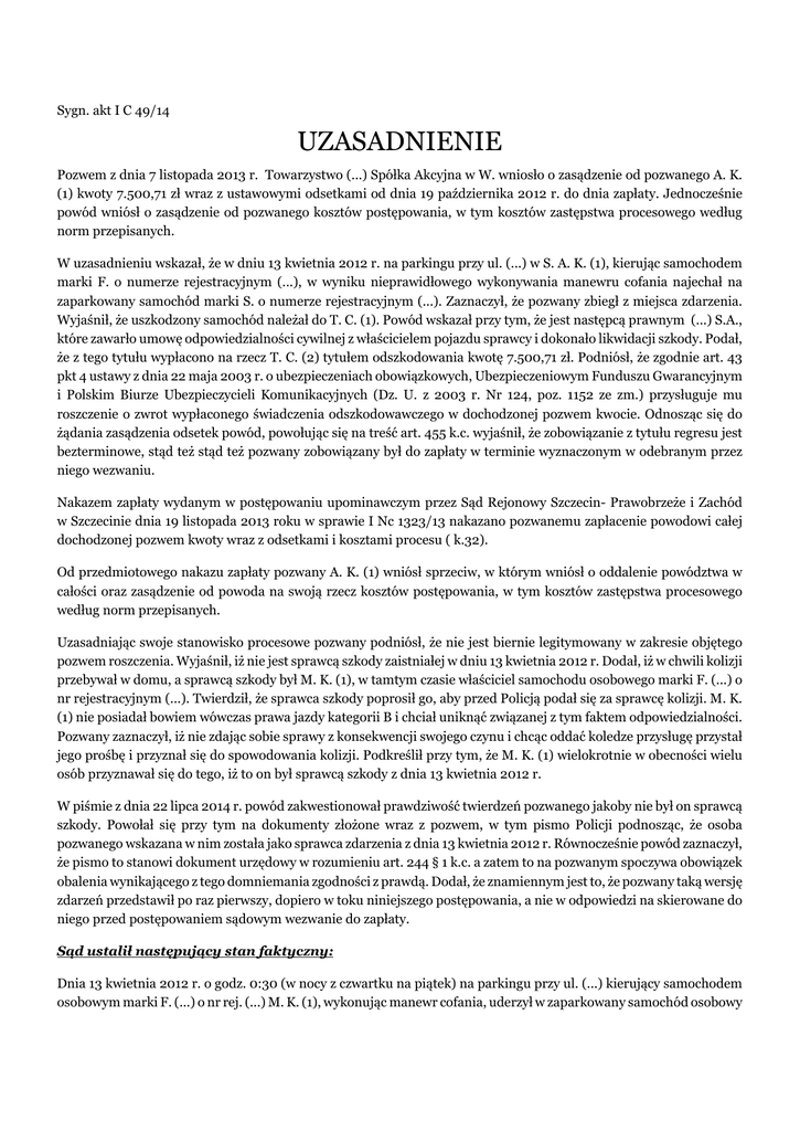 Sygn. akt I C 49/14 UZASADNIENIE Pozwem z dnia 7 listopada 2013 r. Towarzystwo (...) Spółka Akcyjna w W. wniosło o zasądzenie od pozwanego A. K. (1) kwoty 7.500,71 zł wraz z ustawowymi odsetkami od dnia 19 października 2012 r. do dnia zapłaty. Jednocześnie powód wniósł o zasądzenie od pozwanego kosztów postępowania, w tym kosztów zastępstwa procesowego według norm przepisanych. W uzasadnieniu wskazał, że w dniu 13 kwietnia 2012 r. na parkingu przy ul. (...) w S. A. K. (1), kierując samochodem marki F. o numerze rejestracyjnym (...), w wyniku nieprawidłowego wykonywania manewru cofania najechał na zaparkowany samochód marki S. o numerze rejestracyjnym (...). Zaznaczył, że pozwany zbiegł z miejsca zdarzenia. Wyjaśnił, że uszkodzony samochód należał do T. C. (1). Powód wskazał przy tym, że jest następcą prawnym (...) S.A., które zawarło umowę odpowiedzialności cywilnej z właścicielem pojazdu sprawcy i dokonało likwidacji szkody. Podał, że z tego tytułu wypłacono na rzecz T. C. (2) tytułem odszkodowania kwotę 7.500,71 zł. Podniósł, że zgodnie art. 43 pkt 4 ustawy z dnia 22 maja 2003 r. o ubezpieczeniach obowiązkowych, Ubezpieczeniowym Funduszu Gwarancyjnym i Polskim Biurze Ubezpieczycieli Komunikacyjnych (Dz. U. z 2003 r. Nr 124, poz. 1152 ze zm.) przysługuje mu roszczenie o zwrot wypłaconego świadczenia odszkodowawczego w dochodzonej pozwem kwocie. Odnosząc się do żądania zasądzenia odsetek powód, powołując się na treść art. 455 k.c. wyjaśnił, że zobowiązanie z tytułu regresu jest bezterminowe, stąd też stąd też pozwany zobowiązany był do zapłaty w terminie wyznaczonym w odebranym przez niego wezwaniu. Nakazem zapłaty wydanym w postępowaniu upominawczym przez Sąd Rejonowy Szczecin- Prawobrzeże i Zachód w Szczecinie dnia 19 listopada 2013 roku w sprawie I Nc 1323/13 nakazano pozwanemu zapłacenie powodowi całej dochodzonej pozwem kwoty wraz z odsetkami i kosztami procesu ( k.32). Od przedmiotowego nakazu zapłaty pozwany A. K. (1) wniósł sprzeciw, w którym wniósł o oddalenie powództwa w całości oraz zasądzenie od powoda na swoją rzecz kosztów postępowania, w tym kosztów zastępstwa procesowego według norm przepisanych. Uzasadniając swoje stanowisko procesowe pozwany podniósł, że nie jest biernie legitymowany w zakresie objętego pozwem roszczenia. Wyjaśnił, iż nie jest sprawcą szkody zaistniałej w dniu 13 kwietnia 2012 r. Dodał, iż w chwili kolizji przebywał w domu, a sprawcą szkody był M. K. (1), w tamtym czasie właściciel samochodu osobowego marki F. (...) o nr rejestracyjnym (...). Twierdził, że sprawca szkody poprosił go, aby przed Policją podał się za sprawcę kolizji. M. K. (1) nie posiadał bowiem wówczas prawa jazdy kategorii B i chciał uniknąć związanej z tym faktem odpowiedzialności. Pozwany zaznaczył, iż nie zdając sobie sprawy z konsekwencji swojego czynu i chcąc oddać koledze przysługę przystał jego prośbę i przyznał się do spowodowania kolizji. Podkreślił przy tym, że M. K. (1) wielokrotnie w obecności wielu osób przyznawał się do tego, iż to on był sprawcą szkody z dnia 13 kwietnia 2012 r. W piśmie z dnia 22 lipca 2014 r. powód zakwestionował prawdziwość twierdzeń pozwanego jakoby nie był on sprawcą szkody. Powołał się przy tym na dokumenty złożone wraz z pozwem, w tym pismo Policji podnosząc, że osoba pozwanego wskazana w nim została jako sprawca zdarzenia z dnia 13 kwietnia 2012 r. Równocześnie powód zaznaczył, że pismo to stanowi dokument urzędowy w rozumieniu art. 244 § 1 k.c. a zatem to na pozwanym spoczywa obowiązek obalenia wynikającego z tego domniemania zgodności z prawdą. Dodał, że znamiennym jest to, że pozwany taką wersję zdarzeń przedstawił po raz pierwszy, dopiero w toku niniejszego postępowania, a nie w odpowiedzi na skierowane do niego przed postępowaniem sądowym wezwanie do zapłaty. Sąd ustalił następujący stan faktyczny: Dnia 13 kwietnia 2012 r. o godz. 0:30 (w nocy z czwartku na piątek) na parkingu przy ul. (...) kierujący samochodem osobowym marki F. (...) o nr rej. (...) M. K. (1), wykonując manewr cofania, uderzył w zaparkowany samochód osobowy marki S. (...) o nr rej. (...). Następnie odjechał z miejsca zdarzenia, nie pozostawiając żadnych danych umożliwiających zidentyfikowanie sprawcy szkody. W chwili zdarzenia M. K. (1) był właścicielem samochodu marki F. (...). Nie posiadał jednak prawa jazdy na samochody osobowe, a jedynie na motocykle. Świadkiem zdarzenia był W. J. (1), który widząc odjeżdżający z miejsca kolizji samochód zanotował jego numer rejestracyjny, a następnie na przedniej szybie uszkodzonego pojazdu umieścił informację dotyczącą numeru rejestracyjnego sprawcy oraz swój numer telefonu. W dniu 13 kwietnia o godz. 6.00 rano właściciel samochodu osobowego marki S. (...), T. C. (1) niezwłocznie po dostrzeżeniu uszkodzeń zawiadomił funkcjonariuszy Policji, którzy przybyli na miejsce zdarzenia. Funkcjonariusze Policji, po przesłuchaniu W. J. (1) oraz właściciela uszkodzonego pojazdu oraz zapoznaniu się ze stanem pojazdu sporządzili notatkę urzędową. M. K. (1), opowiadał swoim znajomym, w tym: P. S., A. K. (1) i O. B. o kolizji z dnia 13 kwietnia 2012 r. W momencie, gdy dowiedział się, że A. K. (1) posiada prawo jazdy kategorii (...) zwrócił się do niego z prośbą, aby przed funkcjonariuszami policji prowadzącymi postepowanie dotyczące kolizji zeznał, że prowadził samochód w chwili zderzenia z pojazdem marki S. (...). M. K. (1) i A. K. (1) nie znali się zbyt długo. Poznał ich kilka miesięcy wcześniej O. B.. M. K. (1) bardzo nalegał, przekonując, iż pieniądze na naprawę uszkodzonego pojazdu zapłacone zostaną przez towarzystwo ubezpieczeń. Wskazywał, że A. K. (1) nie poniesie żadnych konsekwencji, zaś sam M. K. (1) uniknie odpowiedzialności za prowadzenie pojazdu bez uprawnienia. Ro