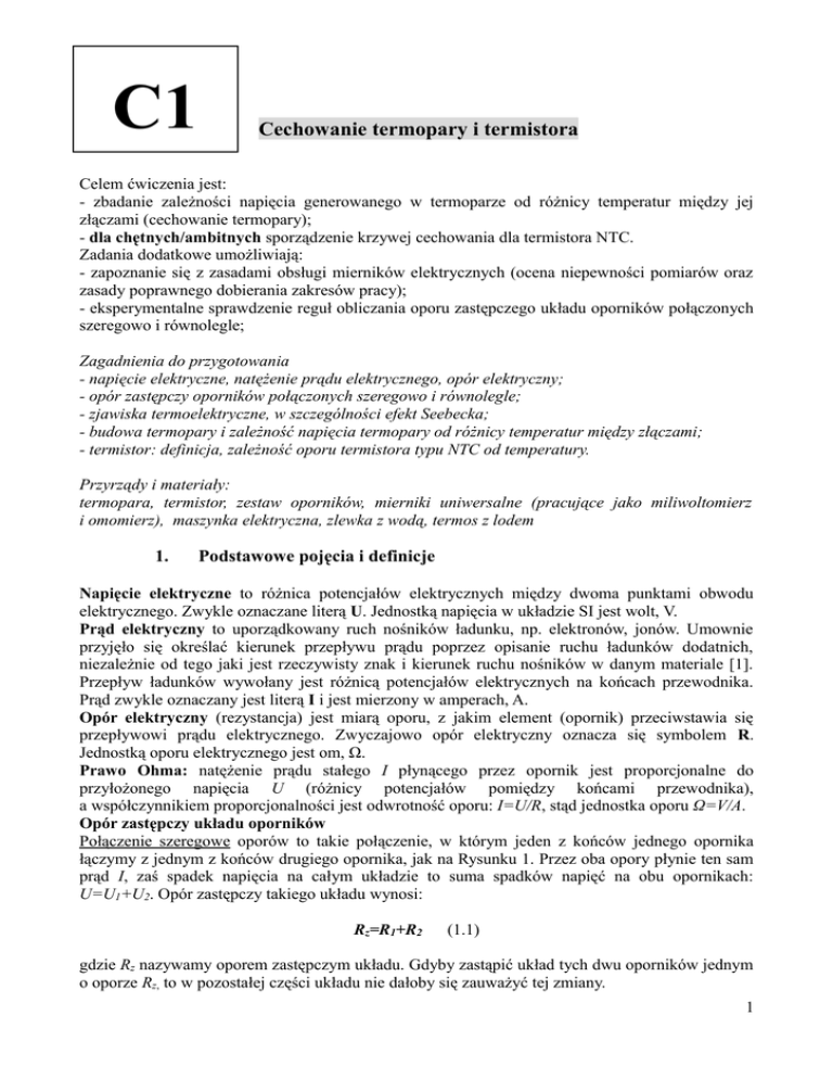 C1 Cechowanie termopary i termistora Celem ćwiczenia jest: - zbadanie zależności napięcia generowanego w termoparze od różnicy temperatur między jej złączami (cechowanie termopary); - dla chętnych/ambitnych sporządzenie krzywej cechowania dla termistora NTC. Zadania dodatkowe umożliwiają: - zapoznanie się z zasadami obsługi mierników elektrycznych (ocena niepewności pomiarów oraz zasady poprawnego dobierania zakresów pracy); - eksperymentalne sprawdzenie reguł obliczania oporu zastępczego układu oporników połączonych szeregowo i równolegle; Zagadnienia do przygotowania - napięcie elektryczne, natężenie prądu elektrycznego, opór elektryczny; - opór zastępczy oporników połączonych szeregowo i równolegle; - zjawiska termoelektryczne, w szczególności efekt Seebecka; - budowa termopary i zależność napięcia termopary od różnicy temperatur między złączami; - termistor: definicja, zależność oporu termistora typu NTC od temperatury. Przyrządy i materiały: termopara, termistor, zestaw oporników, mierniki uniwersalne (pracujące jako miliwoltomierz i omomierz), maszynka elektryczna, zlewka z wodą, termos z lodem 1. Podstawowe pojęcia i definicje Napięcie elektryczne to różnica potencjałów elektrycznych między dwoma punktami obwodu elektrycznego. Zwykle oznaczane literą U. Jednostką napięcia w układzie SI jest wolt, V. Prąd elektryczny to uporządkowany ruch nośników ładunku, np. elektronów, jonów. Umownie przyjęło się określać kierunek przepływu prądu poprzez opisanie ruchu ładunków dodatnich, niezależnie od tego jaki jest rzeczywisty znak i kierunek ruchu nośników w danym materiale [1]. Przepływ ładunków wywołany jest różnicą potencjałów elektrycznych na końcach przewodnika. Prąd zwykle oznaczany jest literą I i jest mierzony w amperach, A. Opór elektryczny (rezystancja) jest miarą oporu, z jakim element (opornik) przeciwstawia się przepływowi prądu elektrycznego. Zwyczajowo opór elektryczny oznacza się symbolem R. Jednostką oporu elektrycznego jest om, Ω. Prawo Ohma: natężenie prądu stałego I płynącego przez opornik jest proporcjonalne do przyłożonego napięcia U (różnicy potencjałów pomiędzy końcami przewodnika), a współczynnikiem proporcjonalności jest odwrotność oporu: I=U/R, stąd jednostka oporu Ω=V/A. Opór zastępczy układu oporników Połączenie szeregowe oporów to takie połączenie, w którym jeden z końców jednego opornika łączymy z jednym z końców drugiego opornika, jak na Rysunku 1. Przez oba opory płynie ten sam prąd I, zaś spadek napięcia na całym układzie to suma spadków napięć na obu opornikach: U=U1+U2. Opór zastępczy takiego układu wynosi: Rz=R1+R2 (1.1) gdzie Rz nazywamy oporem zastępczym układu. Gdyby zastąpić układ tych dwu oporników jednym o oporze Rz, to w pozostałej części układu nie dałoby się zauważyć tej zmiany. 1 Rysunek 1. Schemat szeregowego połączenia oporów. Połączenie równoległe oporników to takie połączenie, gdy łączymy każdy z dwu końców jednego opornika z analogicznym końcem drugiego, jak na Rysunku 2. Jak widać napięcie panujące na każdym z oporników jest takie samo i wynosi dokładnie tyle samo, ile wynosiłoby na oporze zastępczym. Dla dwóch oporników połączonych równolegle: 1/R=1/R1+1/R2 (1.2) Rysunek 2. Schemat równoległego połączenie oporów. Zjawiska termoelektryczne Zjawiska termoelektryczne to zjawiska łączące procesy cieplne i elektryczne w materiałach (przewodnikach, półprzewodnikach), omówione są z pozycji [1]. Warto też zajrzeć do Wikipedii [2]. Aczkolwiek należy pamiętać, iż czasem podawane tam informacje są niepełne lub wręcz błędne. Zatem warto odwołać się także do źródeł drukowanych. Do zjawisk termoelektrycznych zaliczamy między innymi: efekt Seebecka, efekt Peltiera i efekt Thompsona. Na styku dwóch metali, ze względu na różną koncentrację elektronów i różną pracę wyjścia elektronów z metalu, pojawia się niezerowe napięcie kontaktowe. Wartość tego napięcia zależy od rodzaju metali tworzących to połączenie oraz od temperatury, w której znajduje się to połączenie znajduje. Zjawisko Seebecka polega na powstawaniu niezerowego napięcia w układzie dwóch metalowych przewodników połączonych oboma końcami (złącza), gdy złącza będą miały (z powodu czynników zewnętrznych) różne temperatury. Odwrotnie, jeżeli przez układ połączonych przewodników (ze złączami o tej samej temperaturze) zacznie płynąć prąd, to na jednym ze złącz będzie wydzielane ciepło, na drugim zaś będzie ono pochłaniane. Kierunek przepływu ciepła zależy od kierunku przepływu prądu. Jest to zjawisko Peltiera. Zjawisko termoelektryczne można również zaobserwować w pojedynczym przewodniku, przez który płynie prąd, a którego końce mają różne temperatury. W zależności od kierunku przepływu prądu w przewodniku takim będzie wydzielane lub pochłaniane ciepło. Nosi to nazwę zjawiska Thompsona. Termopara Termopara, zwana także ogniwem termoelektrycznym, to przyrząd służący do pomiaru temperatury w oparciu o efekt Seebecka. Termopara zbudowana jest z dwóch przewodników połączonych oboma końcami. Na skutek różnicy temperatur między złączami w układzie takim powstaje napięcie elektryczne (patrz powyżej). W obszarze temperatur badanych w tym ćwiczeniu, wartość tego napięcia jest proporcjonalna do różnicy temperatur w miejscach styków, zgodnie z formułą: 2 U=α T 1−T 2 (1.3) gdzie α jest stałą termopary (poszukiwaną w tym ćwiczeniu), a T 1 i T 2 to temperatury spojeń. Termopary działają w bardzo szerokim zakresie temperatur: obszar ich pracy mieści się w przedziale temperatur od -200ºC do 1800ºC. Cechowanie termopary polega na dokonaniu pomiaru napięć wywołanych różnicami temperatur na stykach przewodników i wyznaczeniu stał α. Termistor - typy, zależn