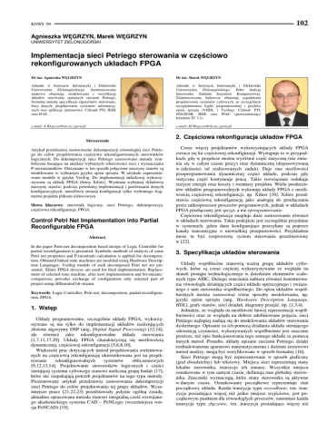 KNWS ‘09 102 Agnieszka WĘGRZYN, Marek WĘGRZYN UNIWERSYTET ZIELONOGÓRSKI Implementacja sieci Petriego sterowania w częściowo rekonfigurowanych układach FPGA Dr inŜ. Agnieszka WĘGRZYN Dr inŜ. Marek WĘGRZYN Adiunkt w Instytucie Informatyki i Elektroniki Uniwersytetu Zielonogórskiego. Zainteresowania naukowe obejmują: modelowanie i weryfikację układów sterowania opisanych sieciami Petriego, formalne metody specyfikacji algorytmów sterowania, bazy danych, projektowanie systemów informacyjnych oraz aplikacje internetowe. Członek PTI, IEEE oraz IFAC. Adiunkt w Instytucie Informatyki i Elektroniki Uniwersytetu Zielonogórskiego. Pełni funkcję kierownika Zakładu InŜynierii Komputerowej. Zainteresowania badawcze obejmują zagadnienia projektowania systemów cyfrowych, ze szczególnym uwzględnieniem logiki programowalnej i języków opisu sprzętu (VHDL i Verilog). Członek PTI, POLSPAR, IEEE oraz IFAC (przewodniczący komitetu TC 3.1). e-mail: [email protected] e-mail: [email protected] Streszczenie Artykuł przedstawia zastosowanie dekompozycji równoległej sieci Petriego do celów projektowania częściowo rekonfigurowanych sterowników logicznych. Do dekompozycji sieci Petriego zastosowano metody symboliczne bazujące na analizie wybranych właściwości sieci i wyznaczaniu P-niezmienników. Otrzymane w ten sposób połączone maszyny stanów są modelowane w wybranym języku opisu sprzętu. W artykule zaprezentowano modele w języku Verilog. Do implementacji układowej wykorzystywane są układy FPGA (firmy Xilinx). Wymiana wybranej składowej maszyny stanów, podczas powtórnej implementacji i porównaniu danych konfiguracyjnych, umoŜliwia zmianę konfiguracji tylko wybranego fragmentu projektu plikiem róŜnicowym. Słowa kluczowe: sterownik logiczny, sieci Petriego, dekompozycja, częściowa rekonfiguracja, FPGA. Control Petri Net Implementation into Partial Reconfigurable FPGA Abstract In the paper Petri-net decomposition based design of Logic Controller for partial reconfiguration is presented. Symbolic methods of analysis of some Petri net properties and P-invariants calculation is applied for decomposition. Obtained linked state machines are modeled using Hardware Description Languages. Verilog models of such decomposed Petri net are presented. Xilinx FPGA devices are used for final implementation. Replacement of selected state machine, after next implementation and bit-streams’ comparison, provides exchange of configuration only selected part of project using differential bit-stream. Keywords: Logic Controller, Petri net, decomposition, partial reconfiguration, FPGA. 1. Wstęp Układy programowalne, szczególnie układy FPGA, wykorzystywane są nie tylko do implementacji układów realizujących złoŜone algorytmy DSP (ang. Digital Signal Processing) [12,14], ale równieŜ jako rekonfigurowalne układy sterowania [1,7,11,17,20]. Układy FPGA charakteryzują się moŜliwością dynamicznej, częściowej rekonfiguracji [5,6,8,10]. Większość prac dotyczących metod projektowania zorientowanych na częściową rekonfigurację ukierunkowana jest na projektowanie rekonfigurowalnych systemów obliczeniowych [9,12,13,14]. Projektowanie sterowników logicznych i części sterującej systemu cyfrowego stanowi nieliczną grupę badań [17], które nie zaspakajają potrzeb projektantów na tego typu metody. Prezentowany artykuł przedstawia zastosowania dekompozycji sieci Petriego do celów projektowania tej grupy układów. Wcześniejsze prace [21,22,23] przedstawiały jedynie ogólną zasadę, aktualnie opracowana metoda stanowi integralną cześć rozwijanego akademickiego systemu CAD – PeNLogic (wcześniejsza wersja PeNCAD) [19]. 2. Częściowa rekonfiguracja układów FPGA Coraz więcej projektantów wykorzystujących układy FPGA zwraca się ku częściowej rekonfiguracji. Występuje to w przypadkach, gdy w projekcie moŜna wyróŜnić część statyczną (nie zmienia się w całym czasie pracy) oraz dynamiczną (dopasowywaną w zaleŜności od realizowanych zadań). Daje ona moŜliwości przeprogramowania dynamicznej części układu, podczas gdy statyczna część kontynuuje pracę. Takie rozwiązanie redukuje zuŜycie energii oraz koszty i rozmiary projektu. Wielu producentów układów programowalnych wykonuje układy FPGA z moŜliwością częściowej rekonfiguracji, np. Xilinx [10]. Xilinx przedstawia częściową rekonfigurację jako analogię do przełączania przez mikroprocesor procesów programowych, jednak w układach FPGA przełączany jest sprzęt, a nie oprogramowanie. Częściowa rekonfiguracja znajduje duŜe zastosowanie równieŜ w układach sterowania. Takie podejście jest szczególnie przydatne w systemach, gdzie dane konfigurujące przesyłane są poprzez kanały transmisyjne o niewielkiej przepustowości. Przykładem moŜe tu być rozproszony system sterowania przedstawiony w [22]. 3. Specyfikacja układów sterowania Układy współbieŜne stanowią waŜną grupę układów cyfrowych, które są coraz częściej wykorzystywane ze względu na skutek postępu technologicznego w dziedzinie elementów scalonych typu ASIC. DuŜego znaczenia nabiera równieŜ konstruowanie równolegle działających części układu operacyjnego i związanego z nim sterownika współbieŜnego. Do opisu układów współbieŜnych moŜna zastosować róŜne sposoby modelowania, np. języki opisu sprzętu (ang. Hardware Description Language, HDL), grafy stanów, sieci działań, diagramy przejść, itp. [1,3,4]. JednakŜe, ze względu na moŜliwość łatwej reprezentacji współbieŜności oraz ze względu na dobrze zdefiniowane pojęcia, sieci Petriego najlepiej nadają się do modelowania układów sterowania dyskretnego. Opisanie za ich pomocą działania układu sterującego sekwencją czynności, wykonywanych współbieŜnie jest znacznie prostsze, niŜ opis funkcjonowania tego samego układu za pomocą innych metod. Ponadto, układy opisane sieciami Pe