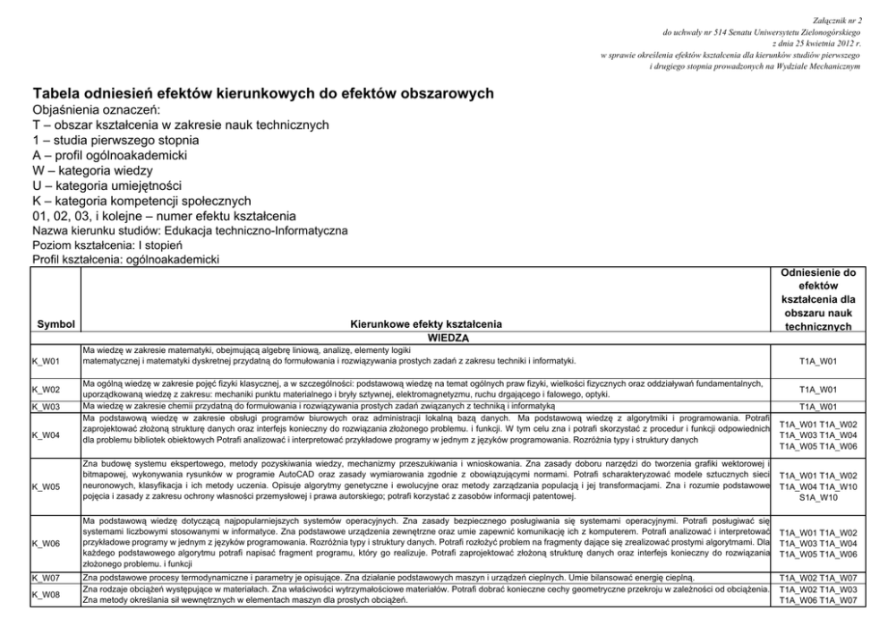 Załącznik nr 2 do uchwały nr 514 Senatu Uniwersytetu Zielonogórskiego z dnia 25 kwietnia 2012 r. w sprawie określenia efektów kształcenia dla kierunków studiów pierwszego i drugiego stopnia prowadzonych na Wydziale Mechanicznym Tabela odniesień efektów kierunkowych do efektów obszarowych Objaśnienia oznaczeń: T – obszar kształcenia w zakresie nauk technicznych 1 – studia pierwszego stopnia A – profil ogólnoakademicki W – kategoria wiedzy U – kategoria umiejętności K – kategoria kompetencji społecznych 01, 02, 03, i kolejne – numer efektu kształcenia Nazwa kierunku studiów: Edukacja techniczno-Informatyczna Poziom kształcenia: I stopień Profil kształcenia: ogólnoakademicki Symbol K_W01 K_W02 K_W03 K_W04 K_W05 K_W06 K_W07 K_W08 Kierunkowe efekty kształcenia WIEDZA Ma wiedzę w zakresie matematyki, obejmującą algebrę liniową, analizę, elementy logiki matematycznej i matematyki dyskretnej przydatną do formułowania i rozwiązywania prostych zadań z zakresu techniki i informatyki. Ma ogólną wiedzę w zakresie pojęć fizyki klasycznej, a w szczególności: podstawową wiedzę na temat ogólnych praw fizyki, wielkości fizycznych oraz oddziaływań fundamentalnych, uporządkowaną wiedzę z zakresu: mechaniki punktu materialnego i bryły sztywnej, elektromagnetyzmu, ruchu drgającego i falowego, optyki. Ma wiedzę w zakresie chemii przydatną do formułowania i rozwiązywania prostych zadań związanych z techniką i informatyką Ma podstawową wiedzę w zakresie obsługi programów biurowych oraz administracji lokalną bazą danych. Ma podstawową wiedzę z algorytmiki i programowania. Potrafi zaprojektować złożoną strukturę danych oraz interfejs konieczny do rozwiązania złożonego problemu. i funkcji. W tym celu zna i potrafi skorzystać z procedur i funkcji odpowiednich dla problemu bibliotek obiektowych Potrafi analizować i interpretować przykładowe programy w jednym z języków programowania. Rozróżnia typy i struktury danych Zna budowę systemu ekspertowego, metody pozyskiwania wiedzy, mechanizmy przeszukiwania i wnioskowania. Zna zasady doboru narzędzi do tworzenia grafiki wektorowej i bitmapowej, wykonywania rysunków w programie AutoCAD oraz zasady wymiarowania zgodnie z obowiązującymi normami. Potrafi scharakteryzować modele sztucznych sieci neuronowych, klasyfikacja i ich metody uczenia. Opisuje algorytmy genetyczne i ewolucyjne oraz metody zarządzania populacją i jej transformacjami. Zna i rozumie podstawowe pojęcia i zasady z zakresu ochrony własności przemysłowej i prawa autorskiego; potrafi korzystać z zasobów informacji patentowej. Odniesienie do efektów kształcenia dla obszaru nauk technicznych T1A_W01 T1A_W01 T1A_W01 T1A_W01 T1A_W02 T1A_W03 T1A_W04 T1A_W05 T1A_W06 T1A_W01 T1A_W02 T1A_W04 T1A_W10 S1A_W10 Ma podstawową wiedzę dotyczącą najpopularniejszych systemów operacyjnych. Zna zasady bezpiecznego posługiwania się systemami operacyjnymi. Potrafi posługiwać się systemami liczbowymi stosowanymi w informatyce. Zna podstawowe urządzenia zewnętrzne oraz umie zapewnić komunikację ich z komputerem. Potrafi analizować i interpretować przykładowe programy w jednym z języków programowania. Rozróżnia typy i struktury danych. Potrafi rozłożyć problem na fragmenty dające się zrealizować prostymi algorytmami. Dla każdego podstawowego algorytmu potrafi napisać fragment programu, który go realizuje. Potrafi zaprojektować złożoną strukturę danych oraz interfejs konieczny do rozwiązania złożonego problemu. i funkcji T1A_W01 T1A_W02 T1A_W03 T1A_W04 T1A_W05 T1A_W06 Zna podstawowe procesy termodynamiczne i parametry je opisujące. Zna działanie podstawowych maszyn i urządzeń cieplnych. Umie bilansować energię cieplną. Zna rodzaje obciążeń występujące w materiałach. Zna właściwości wytrzymałościowe materiałów. Potrafi dobrać konieczne cechy geometryczne przekroju w zależności od obciążenia. Zna metody określania sił wewnętrznych w elementach maszyn dla prostych obciążeń. T1A_W02 T1A_W07 T1A_W02 T1A_W03 T1A_W06 T1A_W07 K_W09 K_W10 K_W11 K_W12 K_W13 K_W14 K_W15 K_W16 K_W17 K_W18 K_W19 K_W20 K_W21 K_W22 Potrafi wymienić dziedziny powiązane z kierunkiem studiów, w których można zastosować wybrane metody matematyczne, określić podstawowe metody matematyczne stosowane do formułowania i rozwiązywania prostych zagadnień technicznych. Student zna programy komputerowe zawierające obliczeniowe metody matematyczne stosowane przy rozwiązywaniu prostych zadań inżynierskich. Ma podstawową wiedzę w zakresie projektowania części maszyn, sposobu obliczeń, zasad i warunków eksploatacji, przedstawienia graficznego zapisu konstrukcji, analizą technologiczności konstrukcji, projektowania i eksploatacji maszyn. Ma podstawową wiedzę o powszechnie używanych obiektach i systemach automatyki, napędach i podzespołach elektronicznych, zna cykl ich projektowania, wytwarzania, używania i utylizacji, zna podstawowe metody, techniki, narzędzia i materiały stosowane do rozwiązywania prostych zadań inżynierskich z zakresu automatyzacji i robotyzacji procesów przemysłowych. Zna podstawowe pojęcia ekonomii i porafi wykorzystywać je w wypowiedziach słownych i pisemnych, zna podstawowe prawa ekonomiczne i potrafi je prawidłowo objaśniać, potrafi analizować i interpretować dane oraz sporządzać wykresy obrazujące wybrane kategorie ekonomiczne, rozumie mechanizmy funkcjonowania podmiotów ekonomicznych, potrafi wskazać związki przyczynowo-skutkowe w decyzjach podmiotów gospodarujących. Ma wiedzę na temat struktur i więzi ekonomicznych. Ma podstawową wiedzę niezbędną do rozumienia społecznych, ekonomicznych, prawnych i innych pozatechnicznych uwarunkowań działalności inżynierskiej. T1A_W01 T1A_W02 T1A_W07 T1A_W02 T1A_W06 T1A_W06 T1A_W07 T1A_W08 S1A_W02 S1A_W05 S1A_W06 S1A_W07 S1A_W09 Student ma podstawową wiedzę o powszechnie używany
