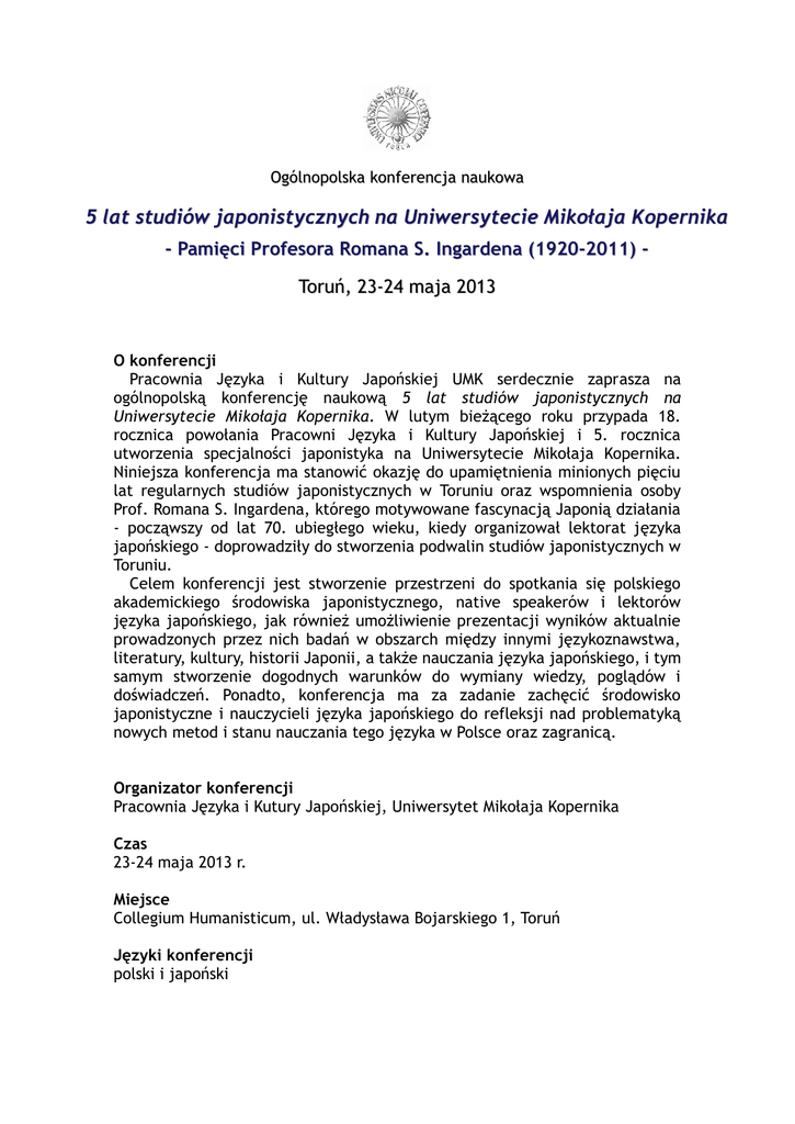 Ogólnopolska konferencja naukowa 5 lat studiów japonistycznych na Uniwersytecie Mikołaja Kopernika - Pamięci Profesora Romana S. Ingardena (1920-2011) Toruń, 23-24 maja 2013 O konferencji Pracownia Języka i Kultury Japońskiej UMK serdecznie zaprasza na ogólnopolską konferencję naukową 5 lat studiów japonistycznych na Uniwersytecie Mikołaja Kopernika. W lutym bieżącego roku przypada 18. rocznica powołania Pracowni Języka i Kultury Japońskiej i 5. rocznica utworzenia specjalności japonistyka na Uniwersytecie Mikołaja Kopernika. Niniejsza konferencja ma stanowić okazję do upamiętnienia minionych pięciu lat regularnych studiów japonistycznych w Toruniu oraz wspomnienia osoby Prof. Romana S. Ingardena, którego motywowane fascynacją Japonią działania - począwszy od lat 70. ubiegłego wieku, kiedy organizował lektorat języka japońskiego - doprowadziły do stworzenia podwalin studiów japonistycznych w Toruniu. Celem konferencji jest stworzenie przestrzeni do spotkania się polskiego akademickiego środowiska japonistycznego, native speakerów i lektorów języka japońskiego, jak również umożliwienie prezentacji wyników aktualnie prowadzonych przez nich badań w obszarch między innymi językoznawstwa, literatury, kultury, historii Japonii, a także nauczania języka japońskiego, i tym samym stworzenie dogodnych warunków do wymiany wiedzy, poglądów i doświadczeń. Ponadto, konferencja ma za zadanie zachęcić środowisko japonistyczne i nauczycieli języka japońskiego do refleksji nad problematyką nowych metod i stanu nauczania tego języka w Polsce oraz zagranicą. Organizator konferencji Pracownia Języka i Kutury Japońskiej, Uniwersytet Mikołaja Kopernika Czas 23-24 maja 2013 r. Miejsce Collegium Humanisticum, ul. Władysława Bojarskiego 1, Toruń Języki konferencji polski i japoński Prelegenci i uczestnicy konferencja jest skierowana w szczególności do japonistów i nauczycieli języka japońskiego Szczegóły dotyczące uczestnictwa w konferencji opłata konferencyjna: 50 PLN sposób zgłoszenia propozycji referatu: wypełniony formularz zgłoszeniowy przesłany pocztą elektroniczną lub tradycyjną na wskazany poniżej adres termin zgłoszenia referatu: 31 marca 2013 powiadomienie o przyjęciu: 12 kwietnia 2013 termin nadsyłania tekstów do publikacji: 30 czerwca 2013 Komitet organizacyjny/Kontakt: kierownik naukowy konferencji sekretarze konferencji dr hab. Krzysztof Stefański, prof. UMK e-mail: [email protected] tel.: (56) 611-35-79 dr Adam Bednarczyk e-mail: [email protected] tel.: (56) 611-36-90 mgr Marcelina Leśniczak e-mail: [email protected] tel.: (56) 611-36-92 mgr Wojciech Nowak e-mail: [email protected] tel.: (56) 611-36-90 Adres do korespondencji dr Adam Bednarczyk Pracownia Języka i Kultury Japońskiej Uniwersytet Mikołaja Kopernika ul. Władysława Bojarskiego 1, 87-100 Toruń tel.: (56) 611-35-79 e-mail: [email protected] Strona www konferencji http://www.home.umk.pl/~pjkj_umk/konf2013.html