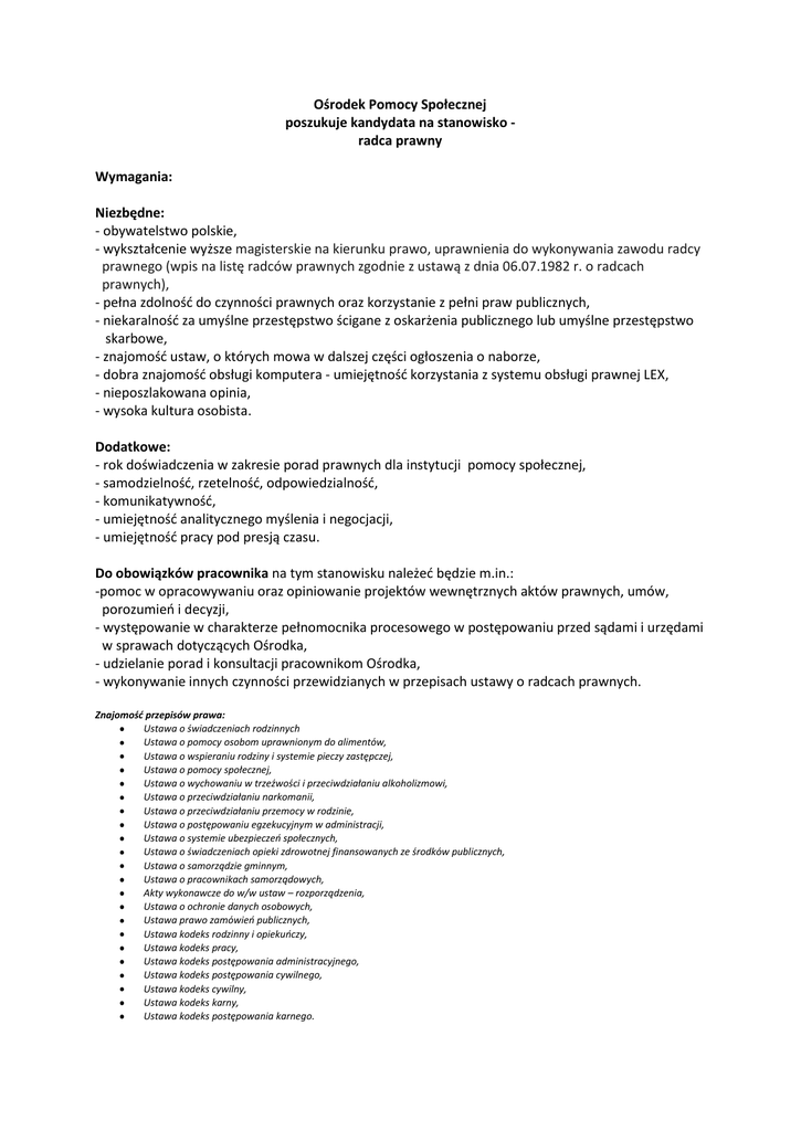 Ośrodek Pomocy Społecznej poszukuje kandydata na stanowisko radca prawny Wymagania: Niezbędne: - obywatelstwo polskie, - wykształcenie wyższe magisterskie na kierunku prawo, uprawnienia do wykonywania zawodu radcy prawnego (wpis na listę radców prawnych zgodnie z ustawą z dnia 06.07.1982 r. o radcach prawnych), - pełna zdolność do czynności prawnych oraz korzystanie z pełni praw publicznych, - niekaralność za umyślne przestępstwo ścigane z oskarżenia publicznego lub umyślne przestępstwo skarbowe, - znajomość ustaw, o których mowa w dalszej części ogłoszenia o naborze, - dobra znajomość obsługi komputera - umiejętność korzystania z systemu obsługi prawnej LEX, - nieposzlakowana opinia, - wysoka kultura osobista. Dodatkowe: - rok doświadczenia w zakresie porad prawnych dla instytucji pomocy społecznej, - samodzielność, rzetelność, odpowiedzialność, - komunikatywność, - umiejętność analitycznego myślenia i negocjacji, - umiejętność pracy pod presją czasu. Do obowiązków pracownika na tym stanowisku należeć będzie m.in.: -pomoc w opracowywaniu oraz opiniowanie projektów wewnętrznych aktów prawnych, umów, porozumień i decyzji, - występowanie w charakterze pełnomocnika procesowego w postępowaniu przed sądami i urzędami w sprawach dotyczących Ośrodka, - udzielanie porad i konsultacji pracownikom Ośrodka, - wykonywanie innych czynności przewidzianych w przepisach ustawy o radcach prawnych. Znajomość przepisów prawa: Ustawa o świadczeniach rodzinnych Ustawa o pomocy osobom uprawnionym do alimentów, Ustawa o wspieraniu rodziny i systemie pieczy zastępczej, Ustawa o pomocy społecznej, Ustawa o wychowaniu w trzeźwości i przeciwdziałaniu alkoholizmowi, Ustawa o przeciwdziałaniu narkomanii, Ustawa o przeciwdziałaniu przemocy w rodzinie, Ustawa o postępowaniu egzekucyjnym w administracji, Ustawa o systemie ubezpieczeń społecznych, Ustawa o świadczeniach opieki zdrowotnej finansowanych ze środków publicznych, Ustawa o samorządzie gminnym, Ustawa o pracownikach samorządowych, Akty wykonawcze do w/w ustaw – rozporządzenia, Ustawa o ochronie danych osobowych, Ustawa prawo zamówień publicznych, Ustawa kodeks rodzinny i opiekuńczy, Ustawa kodeks pracy, Ustawa kodeks postępowania administracyjnego, Ustawa kodeks postępowania cywilnego, Ustawa kodeks cywilny, Ustawa kodeks karny, Ustawa kodeks postępowania karnego. Warunki pracy: - pełny wymiar czasu pracy – umowa o pracę, - miejsce pracy – I piętro budynku przy ul. Energetyków 5 – w budynku znajduje się podjazd dla osób niepełnosprawnych (jedynie do poziomu parteru), brak windy w budynku. Wskaźnik zatrudnienia: - w sierpniu 2015 r., tj. w miesiącu poprzedzającym publikację niniejszego ogłoszenia, wskaźnik zatrudnienia osób niepełnosprawnych w Ośrodku Pomocy Społecznej w Łaziskach Górnych, w rozumieniu przepisów o rehabilitacji zawodowej i społecznej oraz zatrudnieniu osób niepełnosprawnych przekroczył 6%. Oferty zawierające: - podpisany życiorys, - podpisany list motywacyjny, - kwestionariusz osobowy, - podpisane oświadczenie o posiadaniu pełnej zdolności do czynności prawnych i korzystaniu z pełni praw publicznych, - podpisane oświadczenie o niekaralności za umyślne przestępstwo ścigane z oskarżenia publicznego lub umyślne przestępstwo skarbowe, - podpisane oświadczenie o wyrażeniu zgody na przetwarzanie danych osobowych zawartych w ofercie pracy dla potrzeb niezbędnych dla realizacji niniejszego procesu rekrutacji, zgodnie z ustawą z dnia 29 sierpnia 1997 r. o ochronie danych osobowych (Dz. U.2014.1182 j.t. z późn. zm.) - osoby, które zamierzają skorzystać z uprawnienia, o którym mowa w art. 13a ust. 2 ustawy o pracownikach samorządowych są obowiązane do złożenia wraz z dokumentami aplikacyjnymi na w/w stanowisko kopii dokumentu potwierdzającego niepełnosprawność, - kserokopie świadectw pracy, - kserokopie dokumentów potwierdzających wykształcenie, - kserokopie zaświadczeń o ukończonych kursach, szkoleniach. prosimy przesłać na adres: Ośrodek Pomocy Społecznej ul. Energetyków 5 43-170 Łaziska Górne lub dostarczyć do siedziby Ośrodka w terminie do dnia 18 września 2015 r. w godzinach pracy Ośrodka tj . poniedziałek od 730-1700, wtorek-piątek 730-1530 O przyjęciu zgłoszenia decyduje data wpływu do siedziby Ośrodka – oferty przesłane, dostarczone po tym terminie nie będą rozpatrywane.