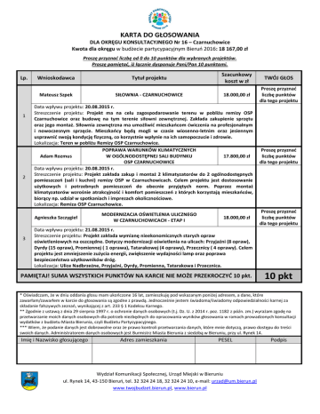 KARTA DO GŁOSOWANIA DLA OKRĘGU KONSULTACYJNEGO Nr 16 – Czarnuchowice Kwota dla okręgu w budżecie partycypacyjnym Bieruń 2016: 18 167,00 zł Proszę przyznać liczbę od 0 do 10 punktów dla wybranych projektów. Proszę pamiętać, iż łącznie dysponuje Pani/Pan 10 punktami. Lp. 1 2 Wnioskodawca Tytuł projektu Szacunkowy koszt w zł TWÓJ GŁOS Mateusz Szpek SIŁOWNIA - CZARNUCHOWICE 18.000,00 zł Proszę przyznać liczbę punktów dla tego projektu Data wpływu projektu: 20.08.2015 r. Streszczenie projektu: Projekt ma na celu zagospodarowanie terenu w pobliżu remizy OSP Czarnuchowice oraz budowę na tym terenie siłowni zewnętrznej. Zakłada zakupienie sprzętu oraz jego montaż. Siłownia zewnętrzna ma umożliwić mieszkańcom ćwiczenia na profesjonalnym i nowoczesnym sprzęcie. Mieszkańcy będą mogli w czasie wiosenno-letnim oraz jesiennym usprawnić swoją kondycję fizyczną, co korzystnie wpłynie na ich samopoczucie i zdrowie. Lokalizacja: Teren w pobliżu Remizy OSP Czarnuchowice. POPRAWA WARUNKÓW KLIMATYCZNYCH Adam Rozmus W OGÓLNODOSTĘPNEJ SALI BUDYNKU 17.800,00 zł OSP CZARNUCHOWICE Data wpływu projektu: 20.08.2015 r. Streszczenie projektu: Projekt zakłada zakup i montaż 2 klimatyzatorów do 2 ogólnodostępnych pomieszczeń (sali i kuchni) remizy OSP w Czarnuchowicach. Celem projektu jest dostosowanie użytkowych i potrzebnych pomieszczeń do obecnie przyjętych norm. Poprzez montaż klimatyzatorów wzrośnie atrakcyjność i komfort pomieszczeń z których korzystają mieszkańców, biorący np. udział w spotkaniach i imprezach okolicznościowe. Lokalizacja: Remiza OSP Czarnuchowice. Agnieszka Szczygieł 3 MODERNIZACJA OŚWIETLENIA ULICZNEGO W CZARNUCHOWICACH - ETAP I 18.000,00 zł Proszę przyznać liczbę punktów dla tego projektu Proszę przyznać liczbę punktów dla tego projektu Data wpływu projektu: 21.08.2015 r. Streszczenie projektu: Projekt zakłada wymianę nieekonomicznych starych opraw oświetleniowych na oszczędne. Dotyczy modernizacji oświetlenia na ulicach: Przyjaźni (8 opraw), Dyrdy (15 opraw), Promiennej ( 1 oprawa), Tatarakowej (4 oprawy), Przecznicy ( 4 oprawy). Celem projektu jest zmniejszenie zużycia energii, zwiększenie wydajności lamp oraz poprawa bezpieczeństwa użytkowników dróg. Lokalizacja: Ulice Nadbrzeżne, Przyjaźni, Dyrdy, Promienna, Tatarakowa i Przecznica. PAMIĘTAJ! SUMA WSZYSTKICH PUNKTÓW NA KARCIE NIE MOŻE PRZEKROCZYĆ 10 pkt. 10 pkt * Oświadczam, że w dniu oddania głosu mam ukończone 16 lat, zamieszkuję pod wskazanym poniżej adresem, a dane, które zawarłam/zawarłem w karcie do głosowania są zgodne z prawdą. Jednocześnie jestem świadoma/świadomy odpowiedzialności karnej za składanie fałszywych zeznań, wynikającej z art. 233 § 1 Kodeksu Karnego. ** Zgodnie z ustawą z dnia 29 sierpnia 1997 r. o ochronie danych osobowych (t.j. Dz. U. z 2014 r. poz. 1182 z późn. zm.) wyrażam zgodę na przetwarzanie moich danych osobowych dla potrzeb niezbędnych do opracowania wyników głosowania w ramach prowadzonych konsultacji wydatków z budżetu Miasta Bierunia, czyli Budżetu Partycypacyjnego. *** Wiem, że podanie danych jest dobrowolne oraz że prawo kontroli przetwarzania danych, które mnie dotyczą, prawo dostępu do treści swoich danych. Administratorem danych osobowych jest Burmistrz Miasta Bierunia z siedzibą w Bieruniu, przy ul. Rynek 14. Imię i Nazwisko głosującego Adres zamieszkania PESEL Wydział Komunikacji Społecznej, Urząd Miejski w Bieruniu ul. Rynek 14, 43-150 Bieruń, tel. 32 324 24 18, 32 324 24 10, e-mail: [email protected] www.twojbudzet.bierun.pl, www.bierun.pl Podpis INSTRUKCJA GŁOSOWANIA Głosowanie odbywa się w dniach od 19 do 24 października 2015 r.: a) osobiście, poprzez złożenie karty do głosowania w kancelarii Urzędu Miejskiego w Bieruniu, ul. Rynek 14 lub w Punkcie Konsultacyjnym wyznaczonym dla danego okręgu konsultacyjnego, b) korespondencyjnie, poprzez przesłanie karty do głosowania na adres: Urząd Miejski w Bieruniu, 43-150 Bieruń, Rynek 14. O ważności karty do głosowania decyduje data stempla pocztowego, c) elektronicznie, poprzez zeskanowanie i przesłanie karty do głosowania za pomocą poczty e-mail na adres [email protected] lub poprzez Elektroniczną Platformę Usług Administracji Publicznej e-PUAP lub poprzez formularz on-line na stronie www.twojbudzet.bierun.pl Głosowanie odbywa się na karcie do głosowania dla danego okręgu konsultacyjnego poprzez rozdysponowania przy odpowiednich projektach liczby 10 punktów, jakimi dysponuje każdy mieszkaniec. Przekroczenie progu 10 pkt. oznaczać będzie nieważność głosu. Oznacza to, iż każdy projekt może dostać ocenę w skali od 0 do 10, ale suma wszystkich punktów na karcie nie może przekroczyć 10 pkt. Każdy mieszkaniec okręgu konsultacyjnego może głosować wyłącznie raz. W przypadku zagłosowania w dwóch lub więcej okręgach konsultacyjnych lub poprzez oddanie głosu dwa razy w danym okręgu, głosy te uznaje się za nieważne. Głosowanie jest jawne, a każdy mieszkaniec biorący udział w głosowaniu oświadcza, że ma ukończone 16 lat i dane, które zostały zawarte w karcie do głosowania są zgodne ze stanem faktycznym. Brak imienia i nazwiska, adresu zamieszkania, nr PESEL i podpisu pod oświadczeniami znajdującymi się pod listą projektów o treści: „Oświadczam, że w dniu oddania głosu mam ukończone 16 lat, zamieszkuję pod wskazanym poniżej adresem, a dane, które zawarłam/zawarłem w karcie do głosowania są zgodne z prawdą. Jednocześnie jestem świadoma/świadomy odpowiedzialności karnej za składanie fałszywych zeznań, wynikającej z art. 233 § 1 Kodeksu Karnego” oraz „Zgodnie z ustawą z dnia 29 sierpnia 1997 r. o ochronie danych osobowych (t.j. Dz. U. z 2014 r. poz. 1182 z późn. zm.) wyrażam zgodę a przetwarzanie moich danych osobowych dla potrzeb niezbędnych do opracowania wyników głosowania w ramach prowadzonych konsult