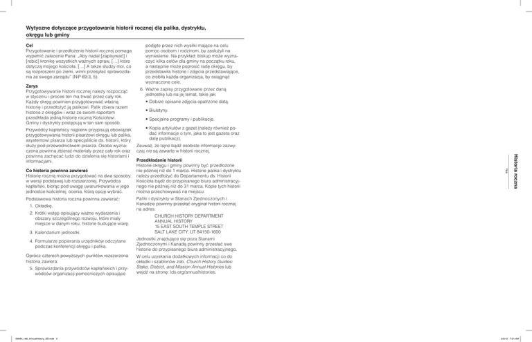 Wytyczne dotyczące przygotowania historii rocznej dla palika, dystryktu, okręgu lub gminy Cel Przygotowanie i przedłożenie historii rocznej pomaga wypełnić zalecenie Pana: „Aby nadal [zapisywać] i [robić] kronikę wszystkich ważnych spraw, […] które dotyczą mojego kościoła. […] A także słudzy moi, co są rozproszeni po ziemi, winni przesyłać sprawozdania ze swego zarządu” (NiP 69:3, 5). Zarys Przygotowywanie historii rocznej należy rozpocząć w styczniu i proces ten ma trwać przez cały rok. Każdy okręg powinien przygotowywać własną historię i przedłożyć ją palikowi. Palik zbiera razem historie z okręgów i wraz ze swoim raportem przedkłada jedną historię roczną Kościołowi. Gminy i dystrykty postępują w ten sam sposób. Podstawowa historia roczna powinna zawierać: 1. Okładkę. 2. Krótki wstęp opisujący ważne wydarzenia i obszary szczególnego rozwoju, które miały miejsce w danym roku, historie budujące wiarę. 3. Kalendarium jednostki. 4. Formularze popierania urzędników odczytane podczas konferencji okręgu i palika. Oprócz czterech powyższych punktów rozszerzona historia zawiera: 5. Sprawozdania przywódców kapłańskich i przywódców organizacji pomocniczych opisujące 09694_166_AnnualHistory_SD.indd 2 Н%PCS[FPQJTBOF[EKÙDJBPQBUS[POFEBUÅ Н#JVMFUZOZ Н4QFDKBMOFQSPHSBNZJQVCMJLBDKF Н,PQJFBSUZLVā³X[HB[FUOBMFĻZS³XOJFĻQPdać informacje o tym, jaka to jest gazeta oraz datę publikacji). Zauważ, że tajne bądź osobiste informacje zazwyczaj nie są zawarte w historii rocznej. Przedkładanie historii Historie okręgu i gminy powinny być przedłożone nie później niż do 1 marca. Historie palika i dystryktu OBMFĻZQS[FEāPĻZÇEP%FQBSUBNFOUVET)JTUPSJJ Kościoła bądź do przypisanego biura administracyjnego nie później niż do 31 marca. Kopie tych historii można przechowywać na miejscu. Rok Co historia powinna zawierać Historię roczną można przygotować na dwa sposoby: w wersji podstawej lub rozszerzonej. Przywódca kapłański, biorąc pod uwagę uwarunkowania w jego jednostce kościelnej, ocenia, którą opcję wybrać. 6. Ważne zapisy przygotowane przez daną jednostkę lub na jej temat, takie jak: Historia roczna Przywódcy kapłańscy najpierw przypisują obowiązek przygotowywania historii pisarzowi okręgu lub palika, asystentowi pisarza lub specjaliście ds. historii, który służy pod przewodnictwem pisarza. Osoba wyznaczona powinna zbierać materiały przez cały rok oraz powinna zachęcać ludzi do dzielenia się historiami i informacjami. podjęte przez nich wysiłki mające na celu pomoc osobom i rodzinom, by zasłużyli na wyniesienie. Na przykład: biskup może wyznaczyć kilka celów dla gminy na początku roku, a następnie może poprosić radę okręgu, by przedstawiła historie i zdjęcia przedstawiające, co zrobiła każda organizacja, by osiągnąć wyznaczone cele. Paliki i dystrykty w Stanach Zjednoczonych i Kanadzie powinny przesłać oryginał historii rocznej na adres: $)63$))*4503:%&1"35.&/5 ANNUAL HISTORY &"454065)5&.1-&453&&5 4"-5-",&$*5:65 Jednostki znajdujące się poza Stanami Zjednoczonymi i Kanadą powinny przesłać swe historie do przypisanego biura administracyjnego. W celu uzyskania dodatkowych informacji co do okładki i szablonów zob. Church History Guides: Stake, District, and Mission Annual Histories lub wejdź na stronę: lds.org/annualhistories. 2/3/12 7:21 AM