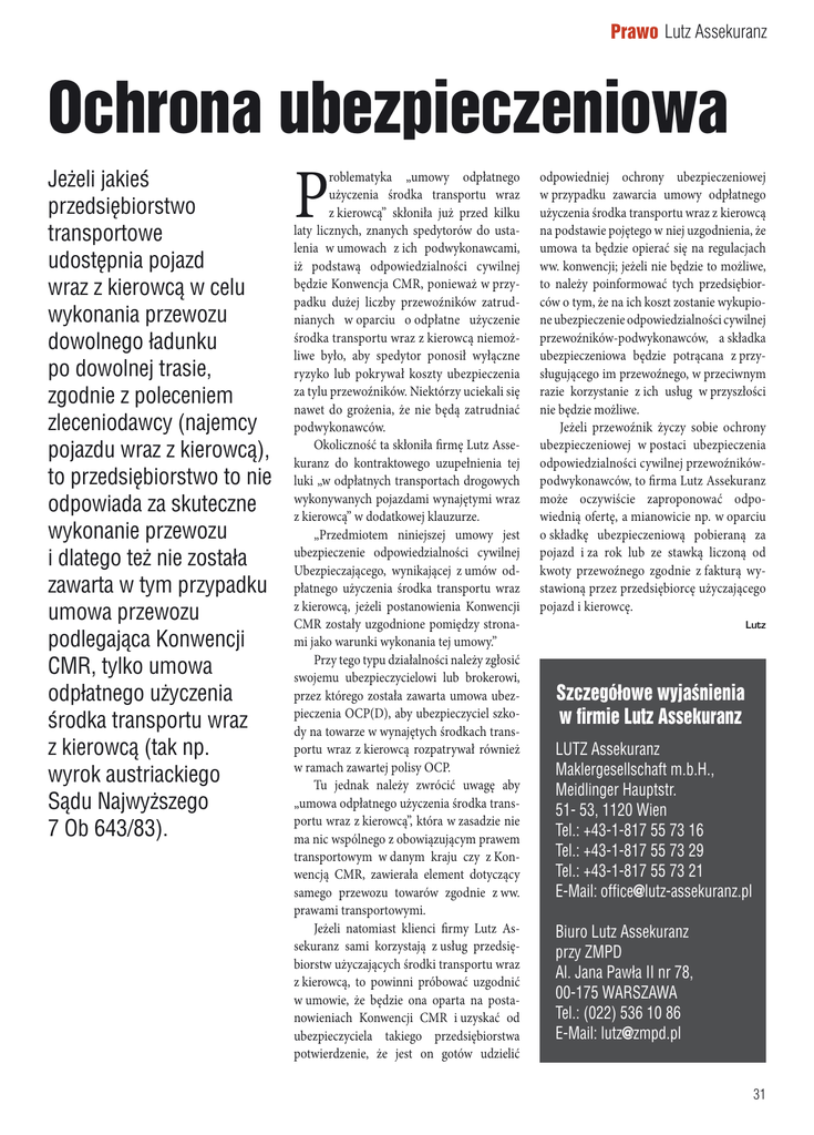 Prawo Lutz Assekuranz Ochrona ubezpieczeniowa Jeżeli jakieś przedsiębiorstwo transportowe udostępnia pojazd wraz z kierowcą w celu wykonania przewozu dowolnego ładunku po dowolnej trasie, zgodnie z poleceniem zleceniodawcy (najemcy pojazdu wraz z kierowcą), to przedsiębiorstwo to nie odpowiada za skuteczne wykonanie przewozu i dlatego też nie została zawarta w tym przypadku umowa przewozu podlegająca Konwencji CMR, tylko umowa odpłatnego użyczenia środka transportu wraz z kierowcą (tak np. wyrok austriackiego Sądu Najwyższego 7 Ob 643/83). P roblematyka „umowy odpłatnego użyczenia środka transportu wraz z kierowcą” skłoniła już przed kilku laty licznych, znanych spedytorów do ustalenia w umowach z ich podwykonawcami, iż podstawą odpowiedzialności cywilnej będzie Konwencja CMR, ponieważ w przypadku dużej liczby przewoźników zatrudnianych w oparciu o odpłatne użyczenie środka transportu wraz z kierowcą niemożliwe było, aby spedytor ponosił wyłączne ryzyko lub pokrywał koszty ubezpieczenia za tylu przewoźników. Niektórzy uciekali się nawet do grożenia, że nie będą zatrudniać podwykonawców. Okoliczność ta skłoniła firmę Lutz Assekuranz do kontraktowego uzupełnienia tej luki „w odpłatnych transportach drogowych wykonywanych pojazdami wynajętymi wraz z kierowcą” w dodatkowej klauzurze. „Przedmiotem niniejszej umowy jest ubezpieczenie odpowiedzialności cywilnej Ubezpieczającego, wynikającej z umów odpłatnego użyczenia środka transportu wraz z kierowcą, jeżeli postanowienia Konwencji CMR zostały uzgodnione pomiędzy stronami jako warunki wykonania tej umowy.” Przy tego typu działalności należy zgłosić swojemu ubezpieczycielowi lub brokerowi, przez którego została zawarta umowa ubezpieczenia OCP(D), aby ubezpieczyciel szkody na towarze w wynajętych środkach transportu wraz z kierowcą rozpatrywał również w ramach zawartej polisy OCP. Tu jednak należy zwrócić uwagę aby „umowa odpłatnego użyczenia środka transportu wraz z kierowcą”, która w zasadzie nie ma nic wspólnego z obowiązującym prawem transportowym w danym kraju czy z Konwencją CMR, zawierała element dotyczący samego przewozu towarów zgodnie z ww. prawami transportowymi. Jeżeli natomiast klienci firmy Lutz Assekuranz sami korzystają z usług przedsiębiorstw użyczających środki transportu wraz z kierowcą, to powinni próbować uzgodnić w umowie, że będzie ona oparta na postanowieniach Konwencji CMR i uzyskać od ubezpieczyciela takiego przedsiębiorstwa potwierdzenie, że jest on gotów udzielić odpowiedniej ochrony ubezpieczeniowej w przypadku zawarcia umowy odpłatnego użyczenia środka transportu wraz z kierowcą na podstawie pojętego w niej uzgodnienia, że umowa ta będzie opierać się na regulacjach ww. konwencji; jeżeli nie będzie to możliwe, to należy poinformować tych przedsiębiorców o tym, że na ich koszt zostanie wykupione ubezpieczenie odpowiedzialności cywilnej przewoźników-podwykonawców, a składka ubezpieczeniowa będzie potrącana z przysługującego im przewoźnego, w przeciwnym razie korzystanie z ich usług w przyszłości nie będzie możliwe. Jeżeli przewoźnik życzy sobie ochrony ubezpieczeniowej w postaci ubezpieczenia odpowiedzialności cywilnej przewoźnikówpodwykonawców, to firma Lutz Assekuranz może oczywiście zaproponować odpowiednią ofertę, a mianowicie np. w oparciu o składkę ubezpieczeniową pobieraną za pojazd i za rok lub ze stawką liczoną od kwoty przewoźnego zgodnie z fakturą wystawioną przez przedsiębiorcę użyczającego pojazd i kierowcę. Lutz Szczegółowe wyjaśnienia w firmie Lutz Assekuranz LUTZ Assekuranz Maklergesellschaft m.b.H., Meidlinger Hauptstr. 51- 53, 1120 Wien Tel.: +43-1-817 55 73 16 Tel.: +43-1-817 55 73 29 Tel.: +43-1-817 55 73 21 E-Mail: [email protected] Biuro Lutz Assekuranz przy ZMPD Al. Jana Pawła II nr 78, 00-175 WARSZAWA Tel.: (022) 536 10 86 E-Mail: [email protected] 31
