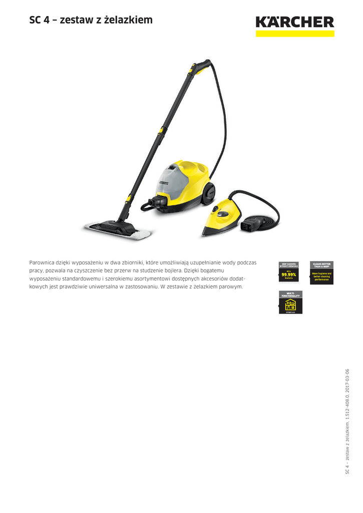 SC 4 – zestaw z żelazkiem Parownica dzięki wyposażeniu w dwa zbiorniki, które umożliwiają uzupełnianie wody podczas * pracy, pozwala na czyszczenie bez przerw na studzenie bojlera. Dzięki bogatemu wyposażeniu standardowemu i szerokiemu asortymentowi dostępnych akcesoriów dodat* When thoroughly cleaning with the Kärcher Steam Cleaner 99.99 % of all common household bacteria will be killed on common household hard surfaces. SC 4 – zestaw z żelazkiem, 1.512-408.0, 2017-03-06 kowych jest prawdziwie uniwersalna w zastosowaniu. W zestawie z żelazkiem parowym. SC 4 – zestaw z żelazkiem Dodatkowy zbiornik na wodę, który można łatwo zdemontować i napełnić umożliwia pracę bez przerw Osobne miejsce na przechowywanie przewodu zasilającego Dane techniczne 1.512-408.0 Numer katalogowy Wydajność powierzchniowa m² 100 Czas podgrzewania min. 4 Pojemność kotła / zbiornika wyrównawczego Maks. ciśnienie pary l 0,5 + 0,8 / Dodatkowy zbiornik bar 3,5 Moc grzałki W 2000 Ciężar bez wyposażenia kg 4 Wymiary (dł. x szer. x wys.) mm 380 × 251 × 273 Wyposażenie standardowe Bezpieczna blokada / Zawór bezpieczeństwa Regulacja ilości pary Wbudowany lejek do napełniania Na rękojeści System dwóch zbiorników Comfort Plus + Rury ssące 2 x 0,5 m Zestaw do czyszczenia podłóg Ściereczka podłogowa z mikrofibry szt. 1 Ściereczka frotte do dyszy ręcznej szt. 1 Odkamieniacz w pałeczkach Wąż parowy z pistoletem Pozycja parking Objęte dostawą. m 2 SC 4 – zestaw z żelazkiem, 1.512-408.0, 2017-03-06 4054278041032 Akcesoria dla SC 4 – zestaw z żelazkiem 1.512-408.0 1 2 3 4 5 6 7 8 9 10 11 13 15 16 Numer katalogowy Cena Opis Akcesoria do prasowania Żelazko parowe I 6006 do parownic Stopa do żelazka parowego I 6006 1 2.863-208.0 2 2.860-142.0 AB 1000 - deska do prasowania 3 2.884-933.0 Powłoka na deskę do prasowania 4 2.884-969.0 Wysokiej jakości żelazko parowe z łatwo przesuwającą się stopą ze stali nierdzewnej w kolorze żółto-czarnym. Nieprzywierająca stopa do żelazka I 6006. Przeznaczona do prasowania delikatnych tkanin np. jedwab, len, czarna odzież, koronkowa bielizna lub koszulki z nadrukiem. Deska do prasowania z funkcją nadmuchu, odsysania pary i 6 stopniową regulacją wysokości. Bawełniana powłoka na deskę do prasowania z piankową podszewką gwarantuje gładką powierzchnię do prasowania i lepsze przenikanie pary. Zapewnia doskonałe rezultaty prasowania. W zestawie dysza podłogowa Comfort Plus i ściereczka do dyszy podłogowej wykonana z mikrofibry. Dysza ręczna ze szczeciną do czyszczenia niewielkich powierzchni np. kabiny prysznicowe, płytki ścienne itp. Przeznaczona do pracy z lub bez powłoczki z mikrofibry. Dzięki swoim kompaktowym wymiarom dysza podłogowa "Comfort Mini" dociera do trudno dostępnych miejsc. Dysza do okien dokładnie czyści szkło, okna oraz lustra przy użyciu parownicy. Dysza Power z przedłużką znacznie zwiększa siłę czyszczenia dyszy do detali. Doskonała do łatwego, ekologicznego czyszczenia trudnodostępnych miejsc np. rogów. Dysza do pielęgnacji tekstyliów odświeża i usuwa zagięcia ubrań i tekstyliów, efektywnie usuwając nieprzyjemne zapachy. Posiada warstwę usuwającą meszek. Dysze Zestaw do czyszczenia podłóg "Comfort Plus" Dysza ręczna 5 2.863-019.0 6 2.884-280.0 Dysza podłogowa Comfort Mini 7 2.863-244.0 Dysza do czyszczenia okien 8 2.863-025.0 Dysza power 9 2.884-282.0 Dysza do pielęgnacji tekstyliów Dysza do pielęgnacji tekstyliów für SC Gumowa listwa do dyszy do okien 10 4.130-390.0 11 2.863-233.0 12 6.273-140.0 Gumowa listwa do dyszy do okien dla parownic. Miękkie powłoczki z mikrofibry na dużą szczotkę okrągłą 13 2.863-243.0 Ściereczki podłogowe z mikrofibry do dyszy podłogowej Comfort Plus 14 2.863-020.0 Zestaw powłoczek z mikrofibry 15 2.863-174.0 Zestaw składa się z: 2 miękkich powłoczek z mikrofibry na dużą szczotkę okrągłą. Do czyszczenia silnie zabrudzonych powierzchni w kuchni i w łazience. Zestaw składa się z 2 miękkich ściereczek podłogowych, o dużej chłonności, wykonanych z najwyższej jakości mikrofibry. Ściereczki pasują do nowej dyszy podłogowej Comfort Plus. Zestaw składa się z dwóch miękkich powłoczek z mikrofibry na dyszę ręczną przeznaczonych do czyszczenia silnie zabrudzonych powierzchni w kuchni i w łazience. Zestaw pięciu wysoce chłonnych powłoczek na dyszę ręczną z wysokiej jakości bawełny. Powłoczki frotte 5 sztuk 16 6.370-990.0 Zestawy szczotek Zestaw okrągłych szczotek 17 2.863-058.0 Zestaw szczotek z mosiężną szczeciną 18 2.863-061.0 Okrągła szczotka – duża 19 2.863-022.0 Objęte dostawą. Dostępne akcesoria. Praktyczny zestaw okrągłych szczotek dostępny w dwóch kolorach Zestaw szczotek okrągłych z mosiężną szczeciną do usuwania uporczywych, zaschniętych zabrudzeń. Doskonałe do niewrażliwych powierzchni. Dzięki dużej, okrągłej szczotce wyczyścisz większą powierzchnię w krótszym czasie. SC 4 – zestaw z żelazkiem, 1.512-408.0, 2017-03-06 Zestawy ściereczek Akcesoria dla SC 4 – zestaw z żelazkiem 1.512-408.0 20 21 22 Numer katalogowy Szczotka okrągła ze skrobakiem 20 2.863-140.0 Parowa szczotka Turbo 21 2.863-159.0 23 Cena Opis Szczotka okrągła z dwoma rzędami odpornej na wysokie temperatury szczeciny oraz skrobakiem do łatwego usuwa nia uporczywych zabrudzeń. Nie nadaje się do czyszczenia powierzchni wrażliwych. Parowa szczotka Turbo ogranicza czas czyszczenia o połowę. Dzięki jej silnemu działaniu nie ma potrzeby szoro- wania. Umożliwia oszczędność czasu. Inne akcesoria Dysza do usuwania tapet 22 2.863-062.0 Zestaw O-ringów 23 2.884-312.0 Zdzieracz do tapet doskonale usuwa tapety oraz pozostałości kleju wykorzystując działanie pary. Zamienny zestaw O-ringów do wyposażenia parownic. SC 4 – zestaw z żelazkiem, 1.512-408.0, 2017-03-06 Objęte dostawą. Dostępne akcesoria.