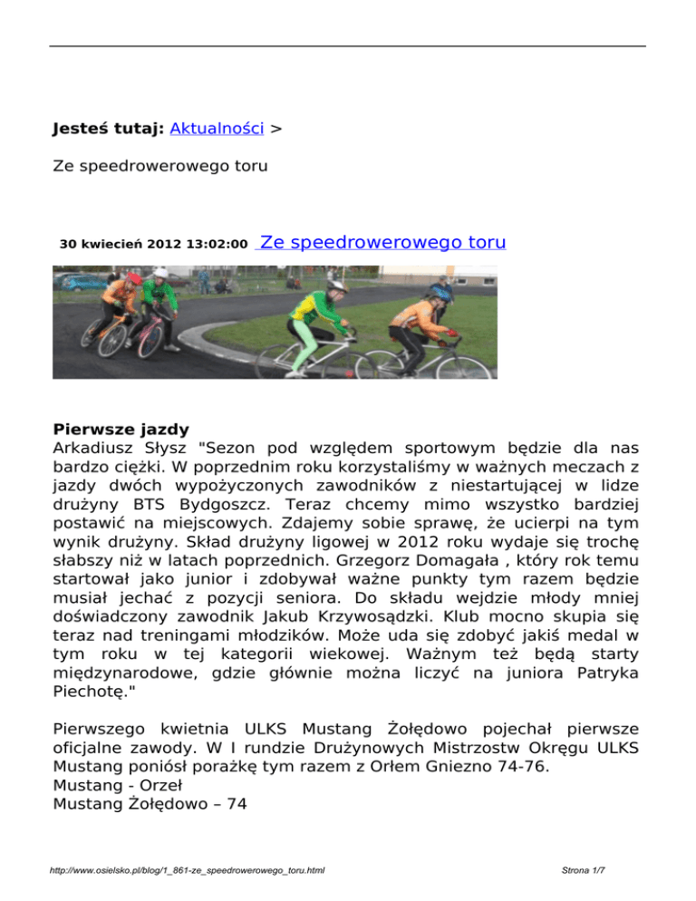 Jesteś tutaj: Aktualności > Ze speedrowerowego toru 30 kwiecień 2012 13:02:00 Ze speedrowerowego toru Pierwsze jazdy Arkadiusz Słysz "Sezon pod względem sportowym będzie dla nas bardzo ciężki. W poprzednim roku korzystaliśmy w ważnych meczach z jazdy dwóch wypożyczonych zawodników z niestartującej w lidze drużyny BTS Bydgoszcz. Teraz chcemy mimo wszystko bardziej postawić na miejscowych. Zdajemy sobie sprawę, że ucierpi na tym wynik drużyny. Skład drużyny ligowej w 2012 roku wydaje się trochę słabszy niż w latach poprzednich. Grzegorz Domagała , który rok temu startował jako junior i zdobywał ważne punkty tym razem będzie musiał jechać z pozycji seniora. Do składu wejdzie młody mniej doświadczony zawodnik Jakub Krzywosądzki. Klub mocno skupia się teraz nad treningami młodzików. Może uda się zdobyć jakiś medal w tym roku w tej kategorii wiekowej. Ważnym też będą starty międzynarodowe, gdzie głównie można liczyć na juniora Patryka Piechotę." Pierwszego kwietnia ULKS Mustang Żołędowo pojechał pierwsze oficjalne zawody. W I rundzie Drużynowych Mistrzostw Okręgu ULKS Mustang poniósł porażkę tym razem z Orłem Gniezno 74-76. Mustang - Orzeł Mustang Żołędowo – 74 http://www.osielsko.pl/blog/1_861-ze_speedrowerowego_toru.html Strona 1/7 1. 2. 3. 4. 5. 6. 7. R. Chabowski (4,4,3,1,4) 16 A. Dolatowski (1,1,-,1,1) 4 M. Detlaf (4,4,4,3*,1) 16+1 W. Kadow (1,1,1,-,1) 4 P .Piechota (4,4,4,4,4) 20 J. Krzywosądzki (1,1,2,4,2) 10 D. Wieliński (1,3) 4 Weekend speedrowerowy 14-15 kwietnia Kolejny start ULKS Mustang Żołędowo miał miejsce w weekend 14-15 kwietnia. W sobotę w Toruniu w I rundzie eliminacji do Drużynowych Mistrzostw Polski Juniorów młodzi zawodnicy Mustanga zajęli 3 miejsce (do finału awansują 2 najlepsze drużyny z 4 turniejów eliminacyjnych). 1. Toruń - 53 2. Gniezno- 47 3. Żołędowo 32 Jakub Krzywosądzki 8(1, 2, 3, 2) Maciej Kaźmierczak 7 (1, 2, 2, 2 ) Wiktor Kadow 5 (2, 2, 1, ) Michał Dolatowski 4(1, -, 2, 1) Patryk Piechota 8( 4, 4 ) 4. Bydgoszcz -28 Również w Toruniu odbyła się I runda eliminacji do Indywidualnych Mistrzostw Polski Juniorów (do finału awansuje pierwszych 5 zawodników z cyklu 4 turniejów). Klasę w zawodach pokazał Patryk Piechota, który wygrał zawody z kompletem 20 punktów. Miejsca zawodników Mustang Żołędowo 1.Patryk Piechota 20 (4,4,4,4,4) 9.Jakub Krzywosądzki 12( 2, 3, 2, 3, 2) 14. Dawid Wieliński 7(1, 2, 2, 1, 1) 16. Wiktor Kadow 5(1, 1, 1, 1, 1) W niedzielę 15 kwietnia rozpoczęły się rozgrywki ligowe. W pierwszym meczu Mustang Żołędowo przegrał wysoko w Ostrowie. Mecz można podzielić na dwie części . Do 8 wyścigu kiedy pola startowe były suche mecz był bardzo zacięty . Wiraż Ostrów prowadził tylko 35-34 i zapowiadało się że walka o zwycięstwo będzie trwała do samego http://www.osielsko.pl/blog/1_861-ze_speedrowerowego_toru.html Strona 2/7 końca. Jednak od tego czasu zaczął padać deszcz i zawodnicy gości zaczęli ślizgać się na starcie . Wiraż wykorzystał to bezwzględnie i w trzech kolejnych biegach zwiększył prowadzenie aż do 11 punktów ( 60-49). 11 punktów różnicy utrzymało się do biegów nominowanych ( 75-64) , w których to gospodarze dwukrotnie zwyciężyli podwójnie 7-3 . Ostatecznie Wiraż Ostrów pokonał Mustanga Żołędowo 89-70. Arkadiusz Słysz" Przegraliśmy zbyt wysoko. Straciliśmy praktycznie szansę na punkt bonusowy za dwumecz z drużyną z Ostrowa. Nie wiem czy gdyby było sucho to byśmy wygrali, ale z pewnością mecz byłby zacięty do końca. Startujemy ze zbyt wychylonej do przodu pozycji i jak jest śliskie pole startowe to niestety koła się ślizgają. W tym sezonie szans na medal raczej nie mamy więc dla nas liczyć się będzie każde zwycięstwo o które powalczymy u siebie z ZKS Zielona Góra 22 kwietnia o godzinie 15.00) Patryk Piechota " Byłem trochę zmęczony po sobocie w Toruniu gdzie udało mi się wygrać turniej eliminacji Mistrzostw Polski. W Ostrowie na 6 biegów jakie jechałem tylko w trzech wyszedłem ze startu bez uślizgu na trasie zawodnicy z Ostrowa byli bardzo szybcy i nie udawało się wyprzedzać" Punkty dla ULKS Mustang zdobyli 1. Sebastian Morawiak 10(4,2,3,1) 2. Rafał Chabowski 4(2,1,1) 3. Remigiusz Burchardt 17(4,w,3,4,4,2) 4. Grzegorz Domagała 8(2,4,1,-,1) 5. Arkadiusz Słysz 11(3,4,1,1,2) 6. Patryk Piechota 15(4,1,3,2,4,1) 7. Jakub Krzywosądzki 5(1,2,1,1) Weekend 21-22 kwietnia W sobotę w Bydgoszczy odbyły się Mistrzostwa Okręgu Kadetów w kategorii par i indywidualnie . W zawodach wystartowało 8 zawodników ULKS Mustang Żołędowo. Na podium udało się stanąć tylko w parach gdzie Wiktor Kadow i Jakub Krzywosądzki zajęli 3 miejsce. Wyniki Par 1. Orzeł Gniezno - 38 2. BTS"S" Bydgoszcz 36 3. Mustang Żołędowo 32 W.Kadow 14 (3,1,4,3,1,2) J.Krzywosądzki 18 ( 4,4,3,2,2,3) http://www.osielsko.pl/blog/1_861-ze_speedrowerowego_toru.html Strona 3/7 pozostałe pary ULKS Mustanga 6 miejsce 19 punktów M.Kaźmierczak 11(3,w,4,4) R.Morawiak 8(1,2,2,3) 8 miejsce 15 punktów Dawid Wieliński 9 (2,3,3,1) Adam Dolatowski 6(3,1,w,2) 10 miejsce 12 punktów J.Rychel 7(2,3,2,w) A.Słysz 5(1,1,1,2) W zawodach indywidualnych nie wystartował Jakub Krzywosądzki, którego trener oszczędzał na mecz ligowy oraz dwaj najmłodsi Aleksander Słysz i Radosław Morawiak. Najlepiej z jadących zawodników wypadł Maciej Kaźmierczak zajmując 6 miejsce. Podium i miejsca zawodników Mustanga 1.Dawid Zachmyc Orzeł Gniezno 19+4 2. Mikołaj Lis TSŻ Pekum Toruń 19+3 3. Borys Kołodziejski Orzeł Gniezno 18 6. Maciej Kaźmierczak 14(1,4,3,3,3) 8.Wiktor Kadow 12 (2,3,2,4,1) 9. Jakub Rychel 12 (2,2,3,3,2) 12. Adam Dolatowski 9(3,2,1,1,2) 13 Dawid Wieliński 8( 1,2,2,w,3) A w niedzielę po wysokiej przegranej w pierwszym meczu z Wirażem Ostrów drużyna ULKS Mustang Żołędowo podejmował ZKS Zielona Góra. Mecz zapowiadał się na bardzo wyrównany i tak też było. Biegi 