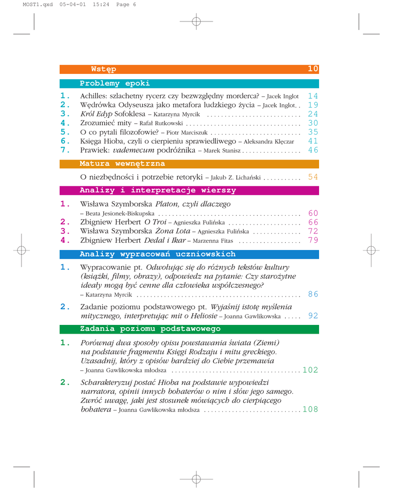 MOST1.qxd 05-04-01 15:24 Page 6 10 Wstêp Problemy epoki 1. 2. 3. 4. 5. 6. 7. Achilles: szlachetny rycerz czy bezwzglêdny morderca? Jacek Inglot Wêdrówka Odyseusza jako metafora ludzkiego ¿ycia Jacek Inglot Król Edyp Sofoklesa Katarzyna Myrcik Zrozumieæ mity Rafa³ Rutkowski O co pytali filozofowie? Piotr Marciszuk Ksiêga Hioba, czyli o cierpieniu sprawiedliwego Aleksandra Klêczar Prawiek: vademecum podró¿nika Marek Stanisz 14 19 24 30 35 41 46 Matura wewnêtrzna O niezbêdnoci i potrzebie retoryki Jakub Z. Lichañski 54 Analizy i interpretacje wierszy 1. Wis³awa Szymborska Platon, czyli dlaczego 2. 3. 4. Zbigniew Herbert O Troi Agnieszka Fuliñska Wis³awa Szymborska ¯ona Lota Agnieszka Fuliñska Zbigniew Herbert Dedal i Ikar Marzenna Fitas Beata Jesionek-Biskupska 60 66 72 79 Analizy wypracowañ uczniowskich 1. 2. Wypracowanie pt. Odwo³uj¹c siê do ró¿nych tekstów kultury (ksi¹¿ki, filmy, obrazy), odpowiedz na pytanie: Czy staro¿ytne idea³y mog¹ byæ cenne dla cz³owieka wspó³czesnego? Katarzyna Myrcik 86 Zadanie poziomu podstawowego pt. Wyjanij istotê mylenia mitycznego, interpretuj¹c mit o Heliosie Joanna Gawlikowska 92 Zadania poziomu podstawowego 1. 2. Porównaj dwa sposoby opisu powstawania wiata (Ziemi) na podstawie fragmentu Ksiêgi Rodzaju i mitu greckiego. Uzasadnij, który z opisów bardziej do Ciebie przemawia Joanna Gawlikowska m³odsza 102 Scharakteryzuj postaæ Hioba na podstawie wypowiedzi narratora, opinii innych bohaterów o nim i s³ów jego samego. Zwróæ uwagê, jaki jest stosunek mówi¹cych do cierpi¹cego bohatera Joanna Gawlikowska m³odsza 108 MOST1.qxd 05-04-01 15:24 Page 7 3. Wska¿ i omów archetypy pojawiaj¹ce siê w Przypowieci o synu marnotrawnym Joanna Gawlikowska m³odsza 114 4. Opisz sposób budowy toposu odwróconego z fragmentu powieci Olgi Tokarczuk Prawiek i inne czasy, porównuj¹c go z histori¹ opisan¹ w Ksiêdze Rodzaju. Zanalizuj opowieæ o grzechu pierworodnym wed³ug koncepcji wspó³czesnej pisarki Joanna Gawlikowska m³odsza 120 5. W przedstawieniu Teatrzyku Zielona Gê pod tytu³em ¯ar³oczna Ewa K. I. Ga³czyñski zaprezentowa³ historiê grzechu pierworodnego na opak. Wyró¿nij i omów wszystkie elementy komiczne i absurdalne, które odró¿niaj¹ tekst od pierwowzoru. Zastanów siê, czy znajomoæ treci Ksiêgi Rodzaju jest konieczna do w³aciwego zrozumienia tekstu? Joanna Gawlikowska m³odsza 125 Test czytania ze zrozumieniem Bohaterowie antycznej tragedii Gra¿yna Bogucka, Janusz Wojczakowski 130 Nauka o jêzyku Ludzie Ksiêgi Ma³gorzata Szeja 138 Analizy obrazów 1. 2. 3. 4. 5. 6. 7. 8. 9. Hendrick ter Brugghen Niewierny Tomasz Ma³gorzata Konopiñska 45 50 Micha³ Anio³ Stworzenie Adama Katarzyna Myrcik 52 Caravaggio Z³o¿enie Chrystusa do Grobu Ma³gorzata Konopiñska 64 Rafael Santi Szko³a ateñska Katarzyna Myrcik 84 Giovanni Bellini Uczta bogów Ma³gorzata Konopiñska 91 Malowid³o na wazie Edyp i Sfinks Ma³gorzata Konopiñska 100 Peter Paul Rubens S¹d Parysa Ma³gorzata Konopiñska 100 Claude Lorrain S¹d Parysa Ma³gorzata Konopiñska Rembrandt Harmensz van Rijn Powrót syna marnotrawnego Ma³gorzata Konopiñska 10. Pieter Bruegel Wie¿a Babel Katarzyna Myrcik 119 143
