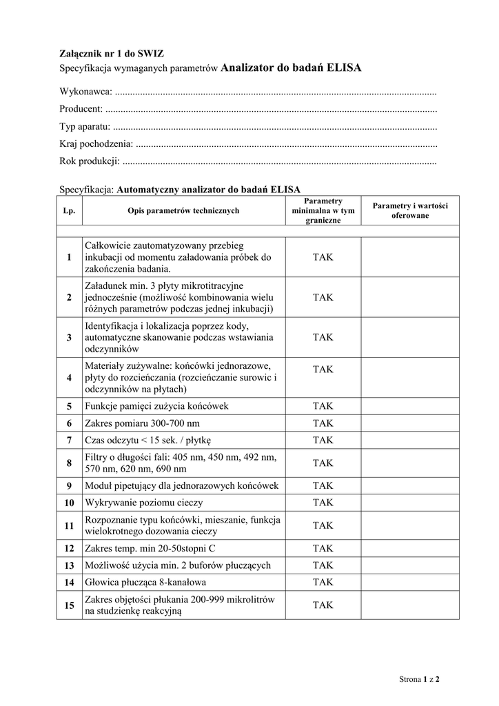 Załącznik nr 1 do SWIZ Specyfikacja wymaganych parametrów Analizator do badań ELISA Wykonawca: ................................................................................................................................ Producent: .................................................................................................................................... Typ aparatu: ................................................................................................................................. Kraj pochodzenia: ........................................................................................................................ Rok produkcji: ............................................................................................................................. Specyfikacja: Automatyczny analizator do badań ELISA Lp. Opis parametrów technicznych Parametry minimalna w tym graniczne 1 Całkowicie zautomatyzowany przebieg inkubacji od momentu załadowania próbek do zakończenia badania. TAK 2 Załadunek min. 3 płyty mikrotitracyjne jednocześnie (możliwość kombinowania wielu różnych parametrów podczas jednej inkubacji) TAK 3 Identyfikacja i lokalizacja poprzez kody, automatyczne skanowanie podczas wstawiania odczynników TAK 4 Materiały zużywalne: końcówki jednorazowe, płyty do rozcieńczania (rozcieńczanie surowic i odczynników na płytach) TAK 5 Funkcje pamięci zużycia końcówek TAK 6 Zakres pomiaru 300-700 nm TAK 7 Czas odczytu < 15 sek. / płytkę TAK 8 Filtry o długości fali: 405 nm, 450 nm, 492 nm, 570 nm, 620 nm, 690 nm TAK 9 Moduł pipetujący dla jednorazowych końcówek TAK 10 Wykrywanie poziomu cieczy TAK 11 Rozpoznanie typu końcówki, mieszanie, funkcja wielokrotnego dozowania cieczy TAK 12 Zakres temp. min 20-50stopni C TAK 13 Możliwość użycia min. 2 buforów płuczących TAK 14 Głowica płucząca 8-kanałowa TAK 15 Zakres objętości płukania 200-999 mikrolitrów na studzienkę reakcyjną TAK Parametry i wartości oferowane Strona 1 z 2 16 Alarm poziomu cieczy TAK 17 Opcje oznaczeń: wyniki jakościowe – definiowany przez użytkownika rodzaj wyniku, wyniki ilościowe – algorytm dopasowania krzywej TAK 18 Analiza kontroli jakości – wartość średnia, SD, CV, błąd standardowy oraz wykres Levey Jennings TAK 19 System operacyjny Windows XP lub równoważny TAK 20 Własny procesor, niezależny od systemu IT TAK 21 Dwukierunkowe połączenie z laboratoryjnym systemem informatycznym TAK 22 Ostrzeżenia informujące użytkownika o nieprawidłowościach TAK 23 Analizator wyposażony w specjalna osłonę ochronną TAK 24 Wykonawca dokona instalacji i przygotowania urządzenia do pracy wraz z bezpłatnym szkoleniem osób obsługujących TAK 25 Wykonawca zapewnia bezpłatny serwis na czas trwania umowy TAK 26 Wszystkie protokoły inkubacji testów ELISA zintergrowane z aparatem TAK 27 Podpięcie analizatora do systemu informatycznego TAK PARAMETRY DODATKOWE Kontrola jakości zewnętrzna obejmująca badania : ANA, ANCA, p/ciała p/ko 28 endomysium i gliadynie , Trab, CCP , borelia IgG, IgM – metodą ELISA i immunoblot TAK ………………………….. (Pieczęć i podpis oferenta ) Strona 2 z 2