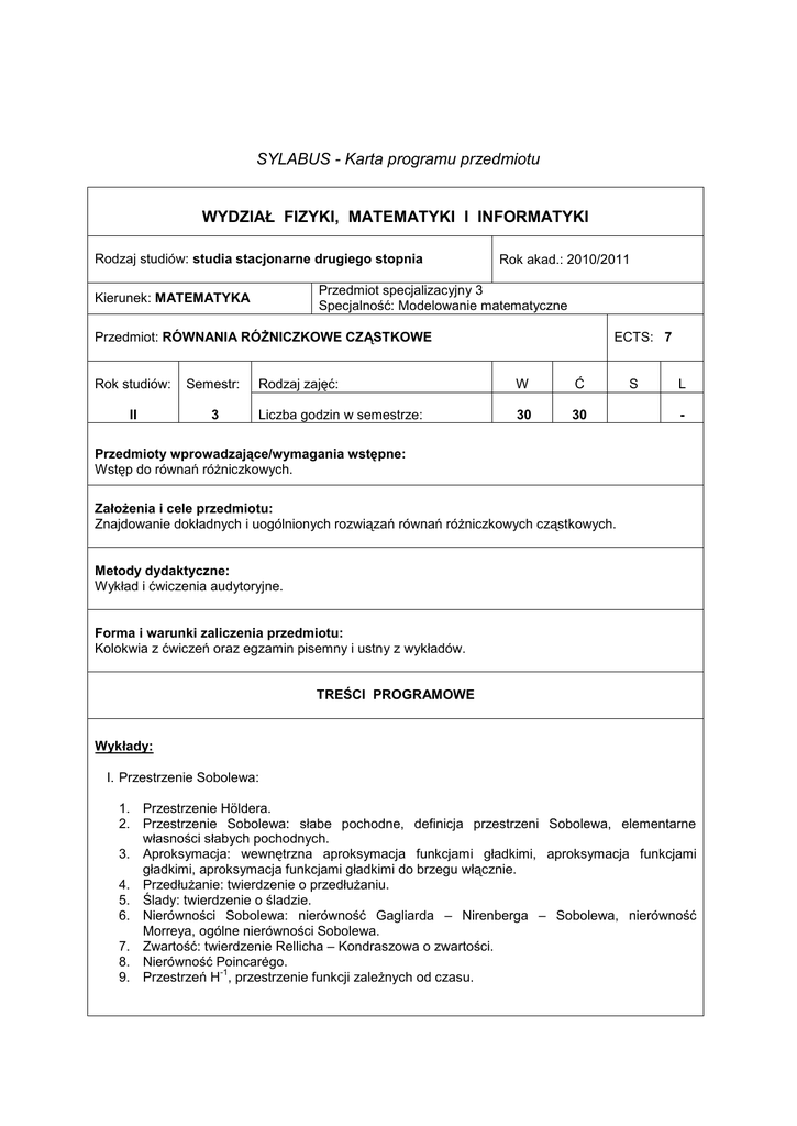 SYLABUS - Karta programu przedmiotu WYDZIAŁ FIZYKI, MATEMATYKI I INFORMATYKI Rodzaj studiów: studia stacjonarne drugiego stopnia Rok akad.: 2010/2011 Przedmiot specjalizacyjny 3 Specjalność: Modelowanie matematyczne Kierunek: MATEMATYKA Przedmiot: RÓWNANIA RÓŻNICZKOWE CZĄSTKOWE Rok studiów: Semestr: II 3 ECTS: 7 Rodzaj zajęć: W Ć Liczba godzin w semestrze: 30 30 S L - Przedmioty wprowadzające/wymagania wstępne: Wstęp do równań różniczkowych. Założenia i cele przedmiotu: Znajdowanie dokładnych i uogólnionych rozwiązań równań różniczkowych cząstkowych. Metody dydaktyczne: Wykład i ćwiczenia audytoryjne. Forma i warunki zaliczenia przedmiotu: Kolokwia z ćwiczeń oraz egzamin pisemny i ustny z wykładów. TREŚCI PROGRAMOWE Wykłady: I. Przestrzenie Sobolewa: 1. Przestrzenie Höldera. 2. Przestrzenie Sobolewa: słabe pochodne, definicja przestrzeni Sobolewa, elementarne własności słabych pochodnych. 3. Aproksymacja: wewnętrzna aproksymacja funkcjami gładkimi, aproksymacja funkcjami gładkimi, aproksymacja funkcjami gładkimi do brzegu włącznie. 4. Przedłużanie: twierdzenie o przedłużaniu. 5. Ślady: twierdzenie o śladzie. 6. Nierówności Sobolewa: nierówność Gagliarda – Nirenberga – Sobolewa, nierówność Morreya, ogólne nierówności Sobolewa. 7. Zwartość: twierdzenie Rellicha – Kondraszowa o zwartości. 8. Nierówność Poincarėgo. -1 9. Przestrzeń H , przestrzenie funkcji zależnych od czasu. II. Liniowe równania eliptyczne drugiego rzędu: 1. Definicje: równania eliptyczne, słabe rozwiązania. 2. Istnienie słabych rozwiązań: twierdzenie Laxa – Milgrama, oszacowania energetyczne, alternatywa Fredholma. 3. Regularność: regularność we wnętrzu, regularność na brzegu. 4. Zasady maksimum: słaba zasada maksimum, mocna zasada maksimum, nierówność Harnacka. 5. Wartości własne i funkcje własne: wartości własne symetrycznych operatorów eliptycznych, wartości własne niesymetrycznych operatorów eliptycznych. III. Liniowe równania paraboliczne drugiego rzędu: 1. Definicje: równania paraboliczne, słabe rozwiązania. 2. Istnienie słabych rozwiązań: przybliżenia Galerkina, oszacowania energetyczne, istnienie i jednoznaczność. 3. Regularność rozwiązań: twierdzenie o wzmocnionej regularności. 4. Zasady maksimum: słabe zasady maksimum, mocna zasada maksimum. IV. Liniowe równania hiperboliczne drugiego rzędu: 1. Definicje: równania hiperboliczne, słabe rozwiązania. 2. Istnienie słabych rozwiązań: przybliżenia Galerkina, oszacowania energetyczne, istnienie i jednoznaczność. 3. Regularność rozwiązań: twierdzenia o poprawionej regularności, większej regularności i nieskończonej różniczkowalności. 4. Rozchodzenie się zaburzeń: twierdzenie o skończonej prędkości rozchodzenia się zaburzeń. 5. Równania w dwu zmiennych. Ćwiczenia audytoryjne : 1. 2. 3. 4. Zadania do części I z wykładów. Zadania do części II z wykładów. Zadania do części III z wykładów. Zadania do części IV z wykładów. Laboratorium: Wykaz literatury podstawowej: [1] L. C. Evans, Równania różniczkowe cząstkowe, PWN, Warszawa 2002. [2] H. Marcinkowska, Dystrybucje, przestrzenie Sobolewa, równania różniczkowe, PWN, Warszawa 1993. Wykaz literatury uzupełniającej: [1] R. A. Adams, Sobolev Spaces, New York 1975. [2] H. Marcinkowska, Wstęp do teorii równań różniczkowych cząstkowych, PWN, Warszawa 1986. Osoba odpowiedzialna za przedmiot: dr hab. Ludwik BYSZEWSKI, prof. PK Zatwierdził: dr hab. Teresa WINIARSKA, prof. PK