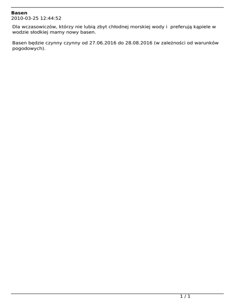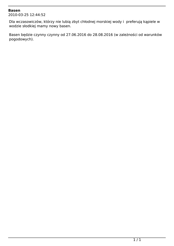 Basen 2010-03-25 12:44:52 Dla wczasowiczów, którzy nie lubią zbyt chłodnej morskiej wody i preferują kąpiele w wodzie słodkiej mamy nowy basen. Basen będzie czynny czynny od 27.06.2016 do 28.08.2016 (w zależności od warunków pogodowych). 1/1