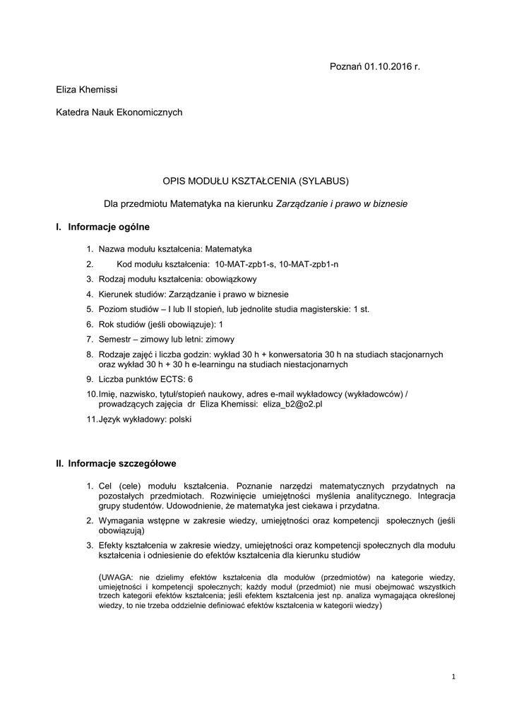 Poznań 01.10.2016 r. Eliza Khemissi Katedra Nauk Ekonomicznych OPIS MODUŁU KSZTAŁCENIA (SYLABUS) Dla przedmiotu Matematyka na kierunku Zarządzanie i prawo w biznesie I. Informacje ogólne 1. Nazwa modułu kształcenia: Matematyka 2. Kod modułu kształcenia: 10-MAT-zpb1-s, 10-MAT-zpb1-n 3. Rodzaj modułu kształcenia: obowiązkowy 4. Kierunek studiów: Zarządzanie i prawo w biznesie 5. Poziom studiów – I lub II stopień, lub jednolite studia magisterskie: 1 st. 6. Rok studiów (jeśli obowiązuje): 1 7. Semestr – zimowy lub letni: zimowy 8. Rodzaje zajęć i liczba godzin: wykład 30 h + konwersatoria 30 h na studiach stacjonarnych oraz wykład 30 h + 30 h e-learningu na studiach niestacjonarnych 9. Liczba punktów ECTS: 6 10. Imię, nazwisko, tytuł/stopień naukowy, adres e-mail wykładowcy (wykładowców) / prowadzących zajęcia dr Eliza Khemissi: [email protected] 11. Język wykładowy: polski II. Informacje szczegółowe 1. Cel (cele) modułu kształcenia. Poznanie narzędzi matematycznych przydatnych na pozostałych przedmiotach. Rozwinięcie umiejętności myślenia analitycznego. Integracja grupy studentów. Udowodnienie, że matematyka jest ciekawa i przydatna. 2. Wymagania wstępne w zakresie wiedzy, umiejętności oraz kompetencji społecznych (jeśli obowiązują) 3. Efekty kształcenia w zakresie wiedzy, umiejętności oraz kompetencji społecznych dla modułu kształcenia i odniesienie do efektów kształcenia dla kierunku studiów (UWAGA: nie dzielimy efektów kształcenia dla modułów (przedmiotów) na kategorie wiedzy, umiejętności i kompetencji społecznych; każdy moduł (przedmiot) nie musi obejmować wszystkich trzech kategorii efektów kształcenia; jeśli efektem kształcenia jest np. analiza wymagająca określonej wiedzy, to nie trzeba oddzielnie definiować efektów kształcenia w kategorii wiedzy ) 1 Symbol efektów kształcenia* Po zakończeniu modułu (przedmiotu) i potwierdzeniu osiągnięcia efektów kształcenia student potrafi: Odniesienie do efektów kształcenia dla kierunku # studiów MAT_01 wykonać działania na macierzach, dowodzić własności macierzy, podać zastosowania macierzy w ekonomii K_U01; K_W01 MAT_02 MAT_03 MAT_04 MAT_05 MAT_06 MAT_07 MAT_08 obliczać pochodne, obliczać i stosować K_U01; K_W01 różniczkę obliczać elastyczność funkcji i ją interpretować, badać przebieg zmienności funkcji, obliczać i interpretować pochodne cząstkowe, podać podstawowe twierdzenia rachunku różniczkowego i ich znaczenie stosować rachunek całkowy (obliczać całki nieoznaczone i oznaczone, obliczać pola figur, obliczać całki metodą przez podstawianie i przez części, obliczać całki w przedziale nieskończonym, stosować całki w naukach ekonomicznych); K_U01; K_W01 stosować elementy programowania K_U01; K_W01 liniowego w zarządzaniu oraz stosować rachunek prawdopodobieństwa (wyznaczać funkcje rozkładu prawdopodobieństwa i dystrybuanty oraz obliczać parametry rozkładu dla zmiennej losowej skokowej i ciągłej, korzystać z tablic rozkładu prawdopodobieństwa wybranych zmiennych, analizować rozkład normalny…) stosować elementy matematyki K_U01; K_W01, K_W06 finansowej (obliczać przyszłą i obecną wartość pieniądza w warunkach stałego i zmiennego oprocentowania, wyznaczać efektywną roczną stopę procentową w warunkach częstej kapitalizacji odsetek, obliczać obecną i przyszłą wartość strumieni płatności …) rozwiązywać układy równań i nierówności różnymi metodami omówić zastosowania funkcji wielu zmiennych i przedstawić je graficznie, wyznaczać izokwanty i rysować poziomice, wyznaczać granice i badać ciągłość funkcji wielu zmiennych omówić ciekawostki matematyczne – ciąg Fibonacciego, Postać Stefana Banacha, historię Enigmy, rozwiązać zagadki matematyczne K_U01; K_W01 K_U01; K_W01 K_U01; K_W01 * kod modułu kształcenia, np. KHT_01 (KHT-kod modułu „Kataliza Heterogeniczna” w USOS) # efekty kształcenia dla kierunku studiów (np. K_W01, K_U01, ..) 2 W – wiedza; U – umiejętności; K – kompetencje społeczne (wyszczególnione tylko w symbolach kierunkowych efektów kształcenia) 01, 02… – numer efektu kształcenia UWAGA! Zaleca się, aby, w zależności od modułu, liczba efektów kształcenia zawierała się w przedziale: 5-10. 4. Treści kształcenia Nazwa modułu kształcenia: Symbol treści kształcenia* Opis treści kształcenia Algebra macierzy TK_01 Rachunek różniczkowy TK_02 Odniesienie do efektów kształcenia modułu# MAT_01 MAT_02 TK_03 Rachunek całkowy MAT_03 TK_04 Rachunek prawdopodobieństwa MAT_04 TK_05 Elementy programowania liniowego MAT_05 TK_06 Elementy matematyki finansowej MAT_06 TK_08 Układy równań i nierówności MAT_08 TK_09 Funkcje wielu zmiennych MAT_09 TK_10 Ciekawostki matematyczne MAT_10 * np. TK_01, TK_02, … # np. KHT_01 – kod modułu kształcenia wg tabeli w pkt. II 3 5. Zalecana literatura H. Augustyniak, Matematyka dla menedżerów, Wydawnictwo "Terra", Poznań, A. Ostoja -Ostaszewski, Matematyka w ekonomii, Modele i metody,t.1i2, Wydawnictwo Naukowe PWN, Warszawa D. i M. Zakrzewscy, Repetytorium z matematyki dla uczniów szkół średnich i kandydatów na studia, Wydawnictwo Szkolne PWN, R. Antoniewicz, A. Misztal, Matematyka dla studentów ekonomii, Wydawnictwo Naukowe PWN, Warszawa M. Matołka, Matematyka dla ekonomistów, Wydawnictwo Uniwersytetu Ekonomicznego w Poznaniu, Poznań K. Piasecki, Matematyka wspomagająca zarządzanie w zadaniach 6. Informacja o przewidywanej możliwości wykorzystania b-learningu 7. Informacja o tym, gdzie można zapoznać się z materiałami do zajęć, instrukcjami do laboratorium, itp. III. Informacje dodatkowe 1. Odniesienie efektów kształcenia i treści kształcenia do sposobów prowadzenia zajęć i metod oceniania 3 Nazwa modułu (przedmiotu): Symbol efektu kształcenia dla modułu * M_01-08 Symbol treści kształcenia realizowanych w trakcie zajęć# Sposoby pro