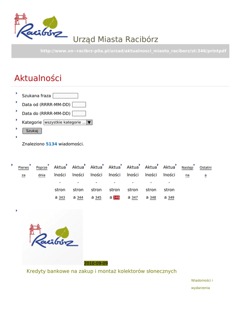 Urząd Miasta Racibórz http://www.xn--racibrz-p0a.pl/urzad/aktualnosci_miasto_raciborz/st:346/printpdf Aktualności Szukana fraza Data od (RRRR-MM-DD) Data do (RRRR-MM-DD) Kategorie wszystkie kategorie ... ▼ Szukaj Znaleziono 5134 wiadomości. Pierws Poprze Aktua Aktua Aktua Aktua Aktua Aktua Aktua Następ Ostatni za dnia lności lności lności lności lności lności lności na a - - - - - - - stron stron stron stron stron stron stron a 343 a 344 a 345 a 346 a 347 a 348 a 349 2010-09-09 Kredyty bankowe na zakup i montaż kolektorów słonecznych kategoria: Wiadomości i wydarzenia 17 czerwca br. Zarząd NFOŚiGW podpisał z sześcioma bankami umowy, uruchamiające program dopłat do kredytów bankowych na zakup i montaż kolektorów słonecznych. 2010-09-09 Zagrajmy razem- integracja, sport, rehabilitacja kategoria: Wiadomości i wydarzenia Impreza adresowana jest do wszystkich mieszkańców Raciborza i naszego regionu, a przede wszystkim do wszystkich osób niepełnosprawnych. 19 września 2010r. godz. od 13.00 do 18.30, Hala OSiR 2010-09-09 RTP Unia Racibórz - Brondby Kopenhaga kategoria: Wiadomości i wydarzenia 22 września (środa) o godz 16.00 na stadionie przy ul.Zamkowej w Raciborzu odbędzie się pierwszy mecz 1/16 finału piłkarskiej Ligi Mistrzyń Kobiet: RTP Unia Racibórz - Brondby Kopenhaga. 2010-09-09 Magazyn radiowy mniejszości niemieckiej w Radiu Plus kategoria: Wiadomości i wydarzenia Przez 13 lat można było usłyszeć Die deutsche Stimme aus Ratibor, audycję mniejszości niemieckiej z Raciborza na antenie lokalnego radia, od października program emitowana będzie w Radiu Plus Opole. 2010-09-06 Wrócił temat lokalizacji Komendy śląskiego Oddziału Straży Granicznej kategoria: Wiadomości i wydarzenia Poseł Henryk Siedlaczek na konferencji przedstawił najnowsze informacje z posiedzenia sejmowej komisji spraw wewnętrznych i administracji, gdzie 2 września poruszany był temat restrukturyzacji placówek straży granicznej. 2010-09-03 Odwołano pogotowie przeciwpowodziowe kategoria: Wiadomości i wydarzenia Zarządzeniem nr 18/2010 Starosta Raciborski dziś o godzinie 11.00 odwołał pogotowie przeciwpowodziowe dla Powiatu Raciborskiego. 2010-09-03 Dożynki Miejskie w Markowicach kategoria: Wiadomości i wydarzenia W tym roku Dożynki Miejskie zorganizowane zostaną w dzielnicy Raciborza Markowicach. Odbędą się 12 września. Rozpocznie je o godz. 10.00 tradycyjnie msza święta w Kościele św. Jadwigi. Około godziny 14.00 ulicami Gliwicką, Jordana, Hetmańską, Powstańców 2010-09-03 Pożegnanie Lata z Andrzejem Piasecznym kategoria: Wiadomości i wydarzenia W sobotę 11 września o godz. 19.00 wystąpi z koncertem w Raciborzu Andrzej Piaseczny. W tym dniu szykują się również atrakcje dla najmłodszych, m.in. przejażdżki ciuchcią oraz budowa unikalnej rzeźby z piasku. 2010-09-02 kategoria: Sprzątanie świata Wiadomości i wydarzenia Ogólnopolska akcja "Sprzątania Świata" inicjowana i koordynowana przez Fundację Nasza Ziemia jak co roku odbędzie się w trzeci weekend września tj. 17-19 września. 2010-09-01 Najlepsze basen i kręgielnia kategoria: Wiadomości i wydarzenia Dobiega końca wizyta w Raciborzu dzieci z Bogatyni, która w sierpniu ucierpiała w wyniku powodzi. Dziś grupę dzieci gościła w urzędzie miasta Ludmiła Nowacka wiceprezydent Raciborza. Pierws Poprze Aktua Aktua Aktua Aktua Aktua Aktua Aktua Następ Ostatni za dnia lności lności lności lności lności lności lności na a - - - - - - - stron stron stron stron stron stron stron a 343 a 344 a 345 a 346 a 347 a 348 a 349