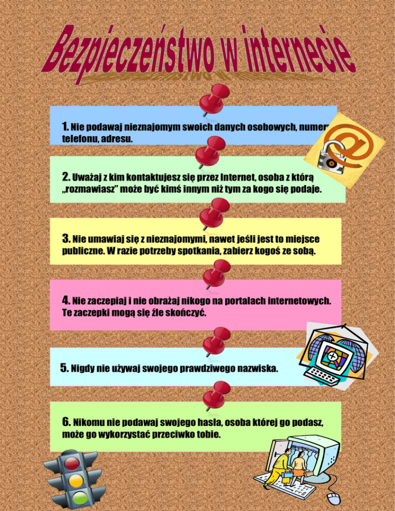 1. Nie podawaj nieznajomym swoich danych osobowych, numeru telefonu, adresu. 2. Uważaj z kim kontaktujesz się przez Internet, osoba z którą „rozmawiasz” może być kimś innym niż tym za kogo się podaje. 3. Nie umawiaj się z nieznajomymi, nawet jeśli jest to miejsce publiczne. W razie potrzeby spotkania, zabierz kogoś ze sobą. 4. Nie zaczepiaj i nie obrażaj nikogo na portalach internetowych. Te zaczepki mogą się źle skończyć. 5. Nigdy nie używaj swojego prawdziwego nazwiska. 6. Nikomu nie podawaj swojego hasła, osoba której go podasz, może go wykorzystać przeciwko tobie.