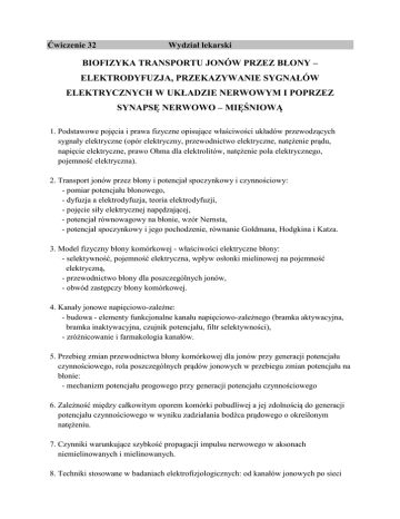 Ćwiczenie 32 Wydział lekarski BIOFIZYKA TRANSPORTU JONÓW PRZEZ BŁONY – ELEKTRODYFUZJA, PRZEKAZYWANIE SYGNAŁÓW ELEKTRYCZNYCH W UKŁADZIE NERWOWYM I POPRZEZ SYNAPSĘ NERWOWO – MIĘŚNIOWĄ 1. Podstawowe pojęcia i prawa fizyczne opisujące właściwości układów przewodzących sygnały elektryczne (opór elektryczny, przewodnictwo elektryczne, natężenie prądu, napięcie elektryczne, prawo Ohma dla elektrolitów, natężenie pola elektrycznego, pojemność elektryczna). 2. Transport jonów przez błony i potencjał spoczynkowy i czynnościowy: - pomiar potencjału błonowego, - dyfuzja a elektrodyfuzja, teoria elektrodyfuzji, - pojęcie siły elektrycznej napędzającej, - potencjał równowagowy na błonie, wzór Nernsta, - potencjał spoczynkowy i jego pochodzenie, równanie Goldmana, Hodgkina i Katza. 3. Model fizyczny błony komórkowej - właściwości elektryczne błony: - selektywność, pojemność elektryczna, wpływ osłonki mielinowej na pojemność elektryczną, - przewodnictwo błony dla poszczególnych jonów, - obwód zastępczy błony komórkowej. 4. Kanały jonowe napięciowo-zależne: - budowa - elementy funkcjonalne kanału napięciowo-zależnego (bramka aktywacyjna, bramka inaktywacyjna, czujnik potencjału, filtr selektywności), - zróżnicowanie i farmakologia kanałów. 5. Przebieg zmian przewodnictwa błony komórkowej dla jonów przy generacji potencjału czynnościowego, rola poszczególnych prądów jonowych w przebiegu zmian potencjału na błonie: - mechanizm potencjału progowego przy generacji potencjału czynnościowego 6. Zależność między całkowitym oporem komórki pobudliwej a jej zdolnością do generacji potencjału czynnościowego w wyniku zadziałania bodźca prądowego o określonym natężeniu. 7. Czynniki warunkujące szybkość propagacji impulsu nerwowego w aksonach niemielinowanych i mielinowanych. 8. Techniki stosowane w badaniach elektrofizjologicznych: od kanałów jonowych po sieci neuronowe: technika cienkich elektrod do pomiaru napięcia błonowego, technika patchclamp i jej konfiguracje, pomiar potencjałów polowych elektrodą zewnątrzkomórkową, elektroencefalografia, elektromiografia. 9. Synapsy: - elementy funkcjonalne kanału jonowego zależnego od ligandu, - kinetyka kanałów zależnych od ligandu (desensytyzacja), - synapsy pobudzające i hamujące – związek między funkcją pobudzająca lub hamującą synapsy a siłą elektryczną napędzającą dla jonów przewodzonych przez receptory synaptyczne, - sumowanie czasowe i przestrzenne potencjałów synaptycznych. 10. Przykłady kanałopatii: ataksja, mukowiscydoza, epilepsja, porażenia okresowe, miotonia wrodzona. 11. Wybrane patologie transmisji nerwowo-mięśniowej: zespół Lamberta-Eatona, miastenia. UWAGA: Student poza przygotowaniem się do omówienia przedstawionych powyżej zagadnień powinien posiadać wcześniejszą wiedzę na temat następujących problemów: Podstawy pobudzenia i przewodzenia w układzie nerwowym oraz wyższe czynności nerwowe, a także fizjologia mięśni prążkowanych i gładkich: 1. Rodzaje bodźców. 2. Potencjał spoczynkowy, potencjał czynnościowy, prawo „wszystko albo nic”. Zmiany pobudliwości w komórce pobudzonej. 3. Budowa i funkcje neuronu i synapsy. Przekazywanie informacji. Synapsa nerwowomięśniowa. Klasyfikacja synaps. Budowa i charakterystyka synaps elektrycznych. Budowa i charakterystyka synaps chemicznych. Mechanizm uwalniania neurotransmitera – cykl pęcherzykowy. 4. Potencjał czynnościowy i mechanizm skurczu mięśnia szkieletowego. Rodzaje skurczów. Mięśnie gładkie: budowa, unerwienie, potencjał czynnościowy i skurcz mięśnia gładkiego. 5. Biochemiczne podstawy pobudzenia i przewodzenia w układzie nerwowym oraz wyższych czynności nerwowych a także biochemia mięśni prążkowanych i gładkich. Zalecana literatura 1. S. Miękisz, A. Hendrich; Wybrane zagadnienia z biofizyki (Volumed, 1998) 2. S. Miękisz, A. Hendrich; Wybrane zagadnienia z biofizyki, skrypt (Akademia Medyczna we Wrocławiu, 2002) 3. F. Jaroszyk; Biofizyka (PZWL, 2001) 4. G. Matthews; Neurobiologia (PZWL, 2000) 6. A. Longstaff; „Neurobiologia” (PWN 2005) 7. Z. Traczyk; Fizjologia człowieka z elementami fizjologii stosowanej i klinicznej. (PZWL, 2001 i nowsze) 8. A. Giese; Fizjologia komórki, (PWN, 1985)