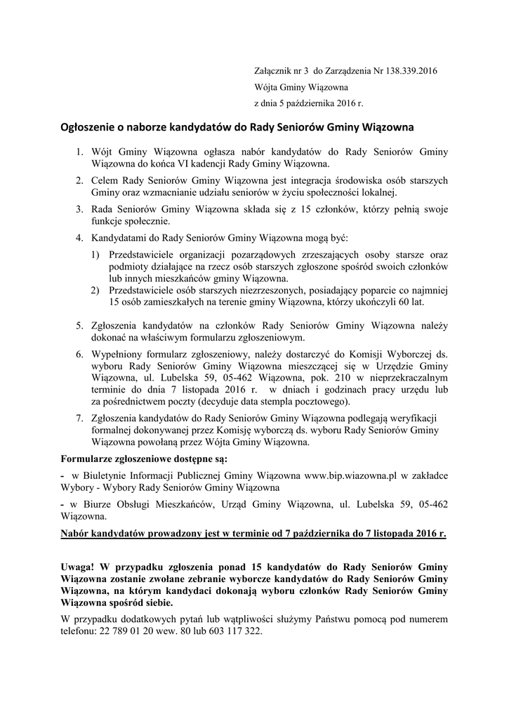 Załącznik nr 3 do Zarządzenia Nr 138.339.2016 Wójta Gminy Wiązowna z dnia 5 października 2016 r. Ogłoszenie o naborze kandydatów do Rady Seniorów Gminy Wiązowna 1. Wójt Gminy Wiązowna ogłasza nabór kandydatów do Rady Seniorów Gminy Wiązowna do końca VI kadencji Rady Gminy Wiązowna. 2. Celem Rady Seniorów Gminy Wiązowna jest integracja środowiska osób starszych Gminy oraz wzmacnianie udziału seniorów w życiu społeczności lokalnej. 3. Rada Seniorów Gminy Wiązowna składa się z 15 członków, którzy pełnią swoje funkcje społecznie. 4. Kandydatami do Rady Seniorów Gminy Wiązowna mogą być: 1) Przedstawiciele organizacji pozarządowych zrzeszających osoby starsze oraz podmioty działające na rzecz osób starszych zgłoszone spośród swoich członków lub innych mieszkańców gminy Wiązowna. 2) Przedstawiciele osób starszych niezrzeszonych, posiadający poparcie co najmniej 15 osób zamieszkałych na terenie gminy Wiązowna, którzy ukończyli 60 lat. 5. Zgłoszenia kandydatów na członków Rady Seniorów Gminy Wiązowna należy dokonać na właściwym formularzu zgłoszeniowym. 6. Wypełniony formularz zgłoszeniowy, należy dostarczyć do Komisji Wyborczej ds. wyboru Rady Seniorów Gminy Wiązowna mieszczącej się w Urzędzie Gminy Wiązowna, ul. Lubelska 59, 05-462 Wiązowna, pok. 210 w nieprzekraczalnym terminie do dnia 7 listopada 2016 r. w dniach i godzinach pracy urzędu lub za pośrednictwem poczty (decyduje data stempla pocztowego). 7. Zgłoszenia kandydatów do Rady Seniorów Gminy Wiązowna podlegają weryfikacji formalnej dokonywanej przez Komisję wyborczą ds. wyboru Rady Seniorów Gminy Wiązowna powołaną przez Wójta Gminy Wiązowna. Formularze zgłoszeniowe dostępne są: - w Biuletynie Informacji Publicznej Gminy Wiązowna www.bip.wiazowna.pl w zakładce Wybory - Wybory Rady Seniorów Gminy Wiązowna - w Biurze Obsługi Mieszkańców, Urząd Gminy Wiązowna, ul. Lubelska 59, 05-462 Wiązowna. Nabór kandydatów prowadzony jest w terminie od 7 października do 7 listopada 2016 r. Uwaga! W przypadku zgłoszenia ponad 15 kandydatów do Rady Seniorów Gminy Wiązowna zostanie zwołane zebranie wyborcze kandydatów do Rady Seniorów Gminy Wiązowna, na którym kandydaci dokonają wyboru członków Rady Seniorów Gminy Wiązowna spośród siebie. W przypadku dodatkowych pytań lub wątpliwości służymy Państwu pomocą pod numerem telefonu: 22 789 01 20 wew. 80 lub 603 117 322.