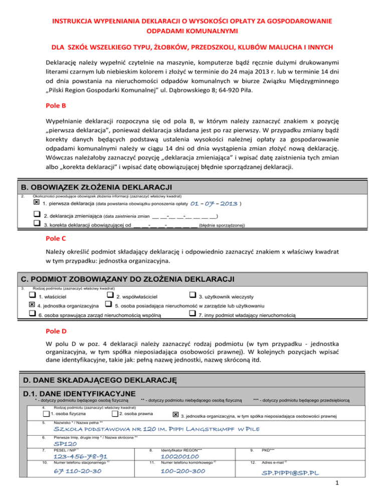 INSTRUKCJA WYPEŁNIANIA DEKLARACJI O WYSOKOŚCI OPŁATY ZA GOSPODAROWANIE ODPADAMI KOMUNALNYMI DLA SZKÓŁ WSZELKIEGO TYPU, ŻŁOBKÓW, PRZEDSZKOLI, KLUBÓW MALUCHA I INNYCH Deklarację należy wypełnić czytelnie na maszynie, komputerze bądź ręcznie dużymi drukowanymi literami czarnym lub niebieskim kolorem i złożyć w terminie do 24 maja 2013 r. lub w terminie 14 dni od dnia powstania na nieruchomości odpadów komunalnych w biurze Związku Międzygminnego „Pilski Region Gospodarki Komunalnej” ul. Dąbrowskiego 8; 64-920 Piła. Pole B Wypełnianie deklaracji rozpoczyna się od pola B, w którym należy zaznaczyć znakiem x pozycję „pierwsza deklaracja”, ponieważ deklaracja składana jest po raz pierwszy. W przypadku zmiany bądź korekty danych będących podstawą ustalenia wysokości należnej opłaty za gospodarowanie odpadami komunalnymi należy w ciągu 14 dni od dnia wystąpienia zmian złożyć nową deklarację. Wówczas należałoby zaznaczyć pozycję „deklaracja zmieniająca” i wpisać datę zaistnienia tych zmian albo „korekta deklaracji” i wpisać datę obowiązującej błędnie sporządzanej deklaracji. B. OBOWIĄZEK ZŁOŻENIA DEKLARACJI 2. Okoliczności powodujące obowiązek złożenia informacji (zaznaczyć właściwy kwadrat) 1. pierwsza deklaracja (data powstania obowiązku ponoszenia opłaty 01 – 07 – 2013 ) 2. deklaracja zmieniająca (data zaistnienia zmian __ __-__ __-__ __ __ __) 3. korekta deklaracji obowiązującej od __ __-__ __-__ __ __ __ (błędnie sporządzonej) Pole C Należy określić podmiot składający deklarację i odpowiednio zaznaczyć znakiem x właściwy kwadrat w tym przypadku: jednostka organizacyjna. C. PODMIOT ZOBOWIĄZANY DO ZŁOŻENIA DEKLARACJI 3. Rodzaj podmiotu (zaznaczyć właściwy kwadrat) 1. właściciel 2. współwłaściciel 3. użytkownik wieczysty 4. jednostka organizacyjna 5. osoba posiadająca nieruchomość w zarządzie lub użytkowaniu 6. osoba sprawująca zarząd nieruchomością wspólną 7. inny podmiot władający nieruchomością Pole D W polu D w poz. 4 deklaracji należy zaznaczyć rodzaj podmiotu (w tym przypadku - jednostka organizacyjna, w tym spółka nieposiadająca osobowości prawnej). W kolejnych pozycjach wpisać dane identyfikacyjne, takie jak: pełną nazwę jednostki, nazwę skróconą itd. D. DANE SKŁADAJĄCEGO DEKLARACJĘ D.1. DANE IDENTYFIKACYJNE * - dotyczy podmiotu będącego osobą fizyczną 4. X 2. osoba prawna X 1. osoba fizyczna 5. ** - dotyczy podmiotu niebędącego osobą fizyczną 3. jednostka organizacyjna, w tym spółka nieposiadająca osobowości prawnej Nazwisko * / Nazwa pełna ** SZKOŁA PODSTAWOWA NR 120 IM. PIPPI LANGSTRUMPF 6. *** - dotyczy podmiotu będącego przedsiębiorcą Rodzaj podmiotu (zaznaczyć właściwy kwadrat) W PILE Pierwsze Imię, drugie imię * / Nazwa skrócona ** SP120 7. PESEL / NIP1) 10. Numer telefonu stacjonarnego 123-456-78-91 67 110-20-30 2) 8. Identyfikator REGON*** 9. PKD*** 11. Numer telefonu komórkowego 2) 12. Adres e-mail 2) 100200100 100-200-300 [email protected] 1 Podanie danych w pozycjach 10, 11, 12 nie jest obowiązkowe. Ich podanie ułatwi kontakt ze strony pracowników Biura Związku. W polu D.2 należy wpisać adres siedziby. Na adres ten kierowana będzie korespondencja. D.2. ADRES ZAMIESZKANIA* / SIEDZIBY** 13. Kraj 14. POLSKA 16. Gmina 20. Miejscowość Województwo 15. WIELKOPOLSKIE 17. PIŁA 21. PIŁA Ulica Powiat 18. WESOŁA Kod pocztowy 64-920 22. PILSKI Nr domu 19. 5 Nr lokalu Poczta PIŁA Pole E Należy podać adres nieruchomości, dla której składana jest deklaracja, na której powstają odpady komunalne (w większości przypadków adres będzie ten sam co w polu D.2) E. MIEJSCE POŁOŻENIA NIERUCHOMOŚCI, NA KTÓREJ POWSTAJĄ ODPADY KOMUNALNE W przypadku większej liczby nieruchomości niż 1, wypełnić odpowiedni załącznik (DO-1/A lub DO-1/B). 23. Miejscowość PIŁA 24. Ulica WESOŁA 25. Nr domu 5 26. Nr lokalu 27. Nr działki 25/38 W przypadku większej liczby nieruchomości niż 1, należy wypełnić odpowiedni załącznik (DO-1/A lub DO-1/B). Pole F Należy zaznaczyć znakiem x kwadrat z odpowiednim rodzajem nieruchomości, w tym przypadku: nieruchomość, na której nie zamieszkują mieszkańcy, a powstają odpady komunalne. F. RODZAJ NIERUCHOMOŚCI 28. nieruchomość, na której zamieszkują mieszkańcy 3) (wypełnić część H) nieruchomość, na której nie zamieszkują mieszkańcy, a powstają odpady komunalne 4) (wypełnić część I) Pole G Pole G deklaracji jest bardzo istotne, ponieważ zawiera oświadczenie dotyczące sposobu zbierania odpadów komunalnych. Wybór sposobu zbierania odpadów niesie za sobą konsekwencje w postaci wysokości opłaty za gospodarowanie odpadami komunalnymi. Za odpady zmieszane należy przyjąć do obliczenia opłaty kwotę wyższą, natomiast przy segregowaniu odpadów kwota opłaty miesięcznej jest niższa. Przypominamy, że zgodnie z § 3 punkt 1 i 2 regulaminu utrzymania czystości i porządku na terenie Związku Międzygminnego „Pilski Region Gospodarki Odpadami Komunalnymi” właściciele nieruchomości zobowiązani są do prowadzenia selektywnego zbierania odpadów komunalnych. G. SPOSÓB ZBIERANIA I ODBIERANIA ODPADÓW KOMUNALNYCH Z NIERUCHOMOŚCI 29. selektywny 5) nieselektywny Pole H Nie dotyczy nieruchomości, na której nie zamieszkują mieszkańcy, a powstają odpady komunalne. Pole I Minimalne normatywy dostosowane do dwutygodniowego cyklu odbioru, w tym przypadku: 2 a) dla szkół wszelkiego typu – 0,003 m3 na każdego ucznia, studenta i pracownika; b) dla żłobków i przedszkoli, klubów malucha i innych – 0,003 m3 na każde dziecko i pracownika. Obowiązek wyposażenia nieruchomości w pojemniki służące do zbierania odpadów komunalnych oraz utrzymywanie tych pojemników w odpowiednim stanie sanitarnym, porządkowym i technicznym, przejmie Związek Międzygminny w ramach uiszczonej opłaty za gospodarowanie odpadami komunalnym
